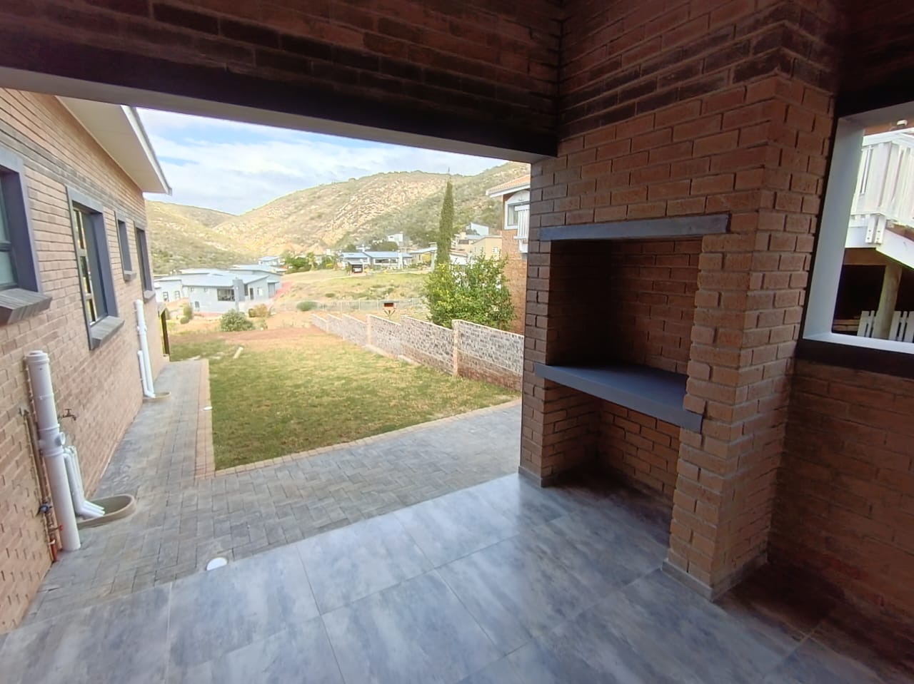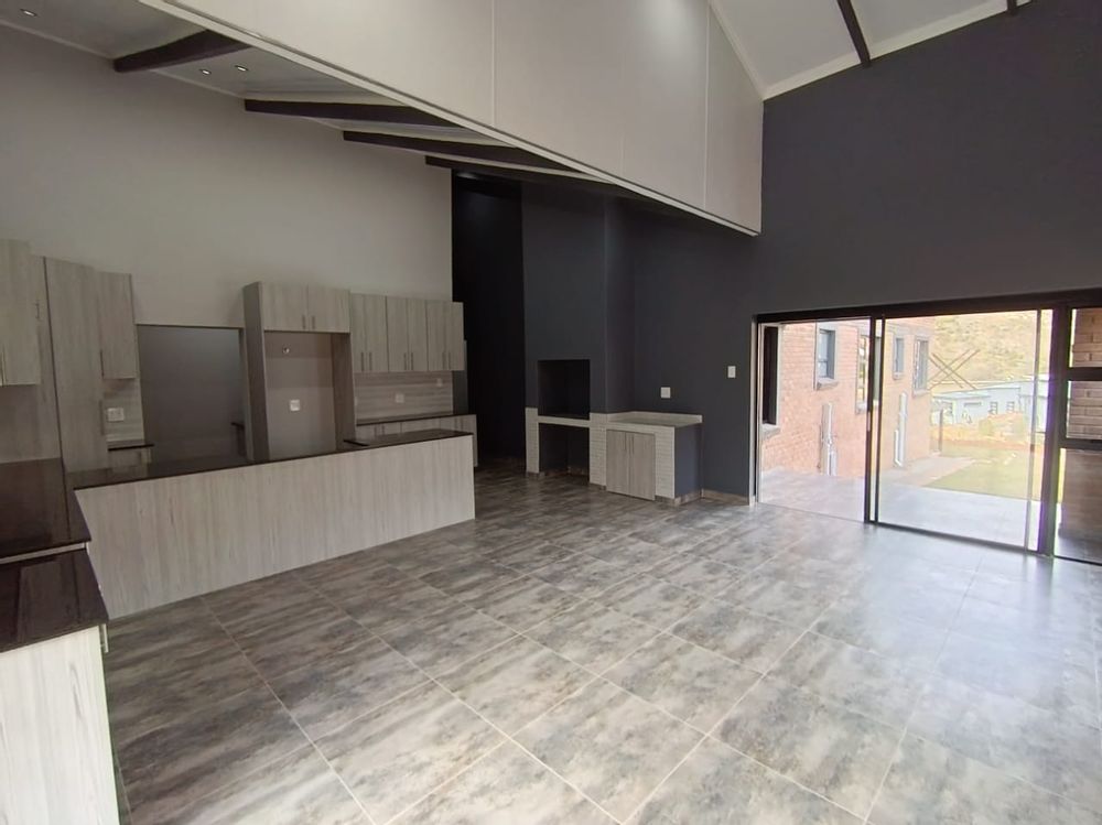 The heart of the home features an inviting open-plan layout, where the lounge, dining area, and kitchen merge into one bright, airy space. High ceilings and tall walls enhance the sense of volume, while a built-in indoor braai/fireplace ensures year-round comfort and gatherings.