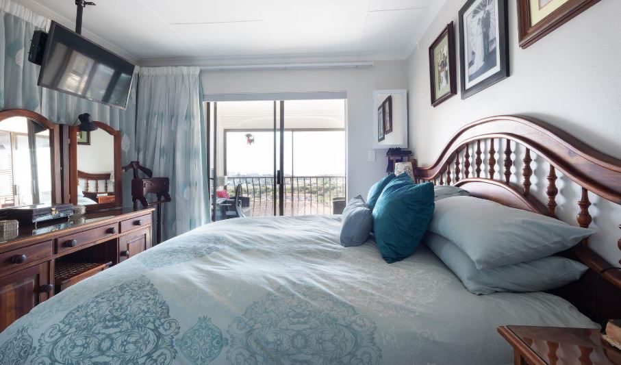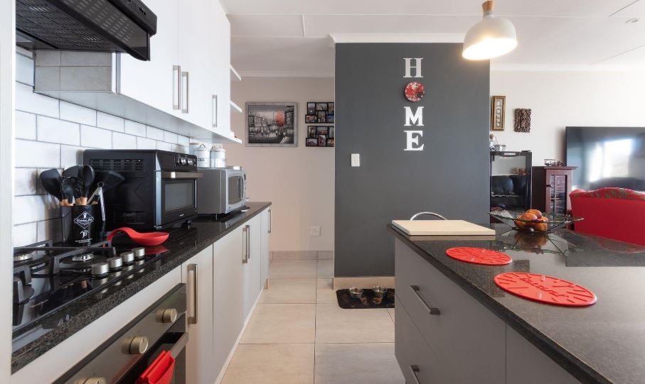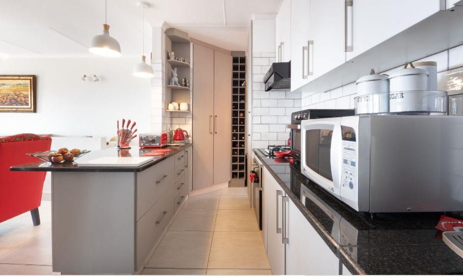 The open-plan design creates an inviting atmosphere, with a tiled lounge seamlessly flowing into the contemporary kitchen. The lounge opens onto a small balcony where you can relax and take in the beautiful sea views. A built-in braai is conveniently located next to the balcony door, making it ideal for entertaining. The kitchen features granite countertops, ample storage, and a separate scullery equipped with all the necessary plumbing for a dishwasher and washing machine.