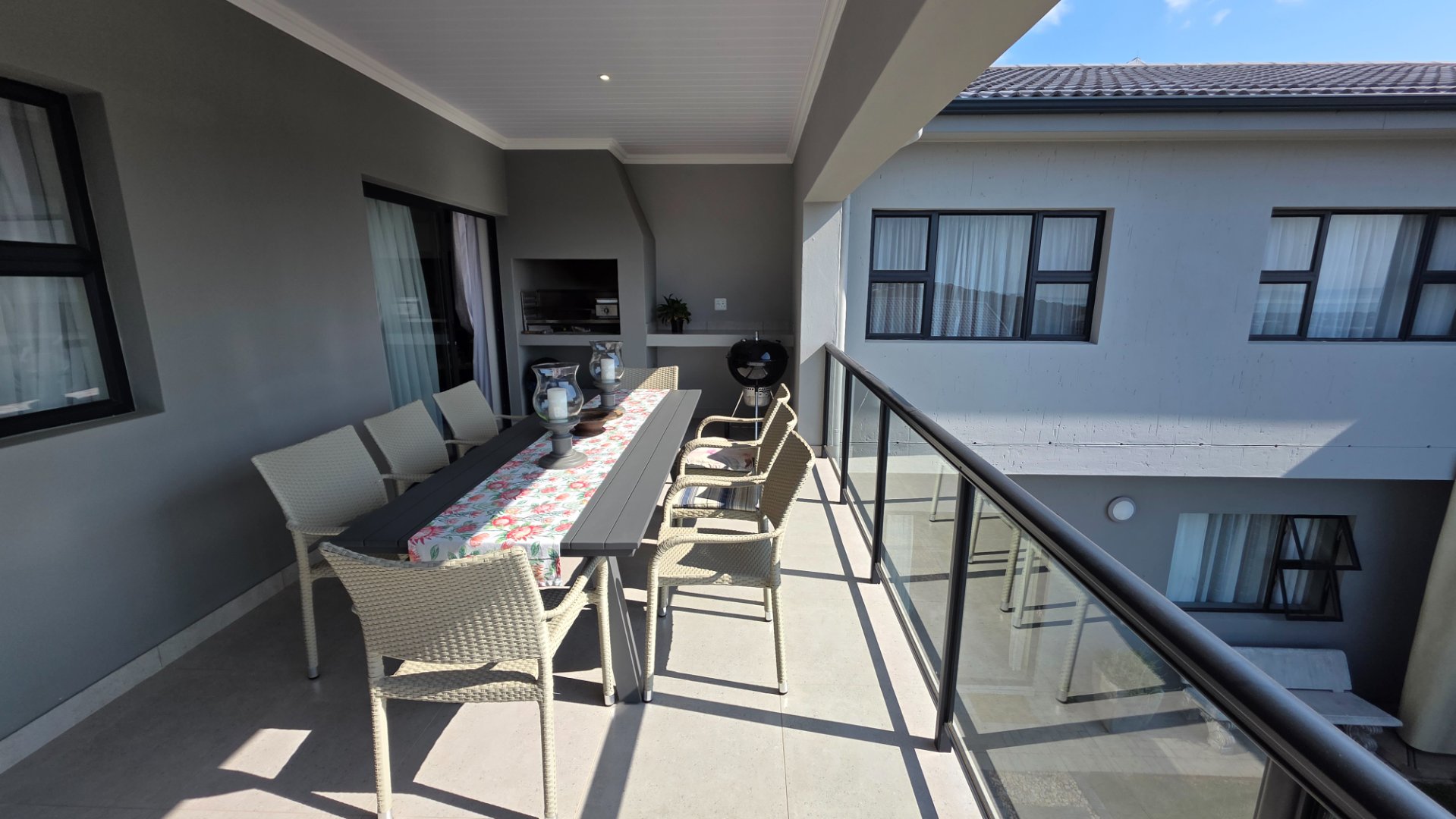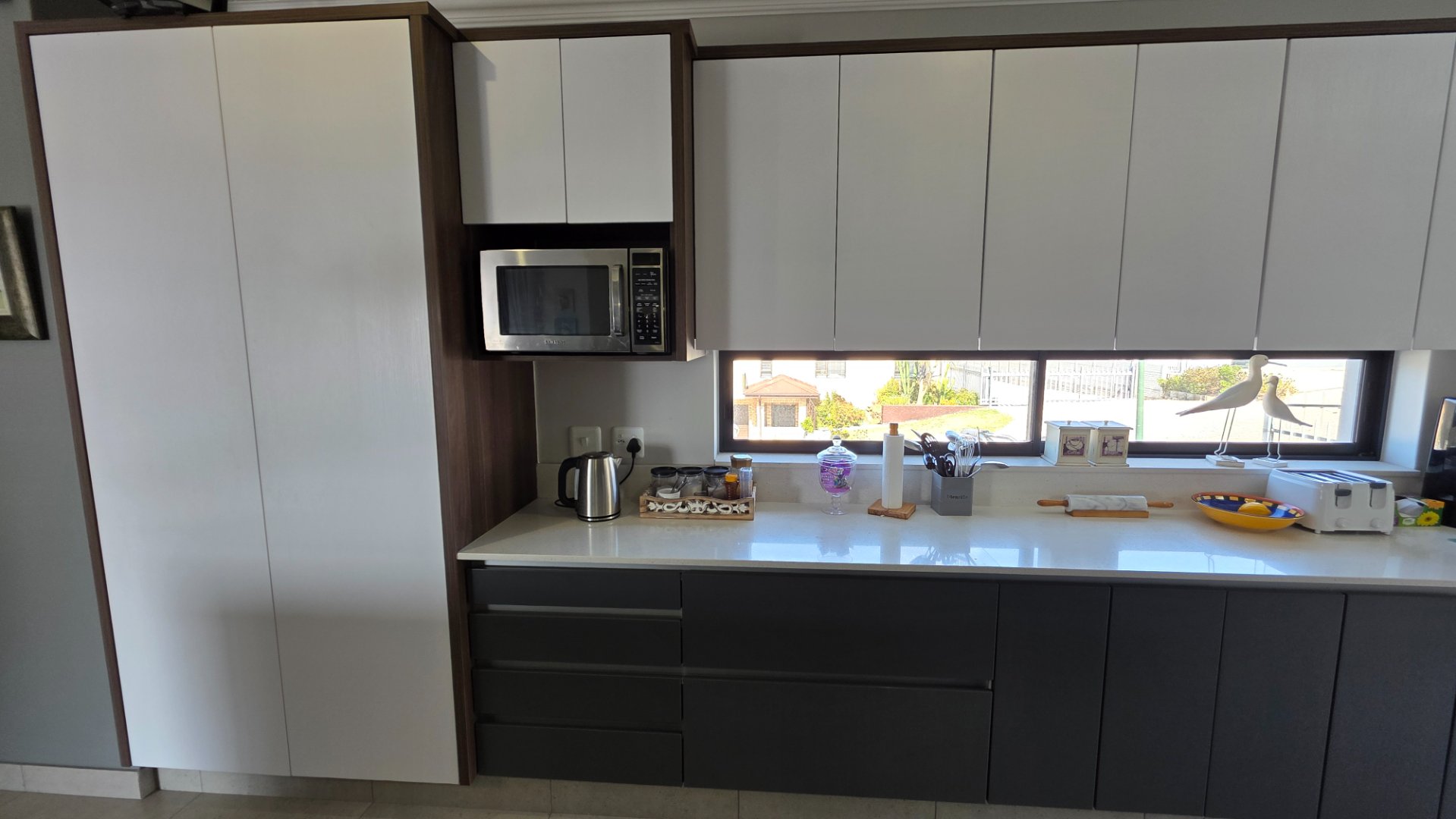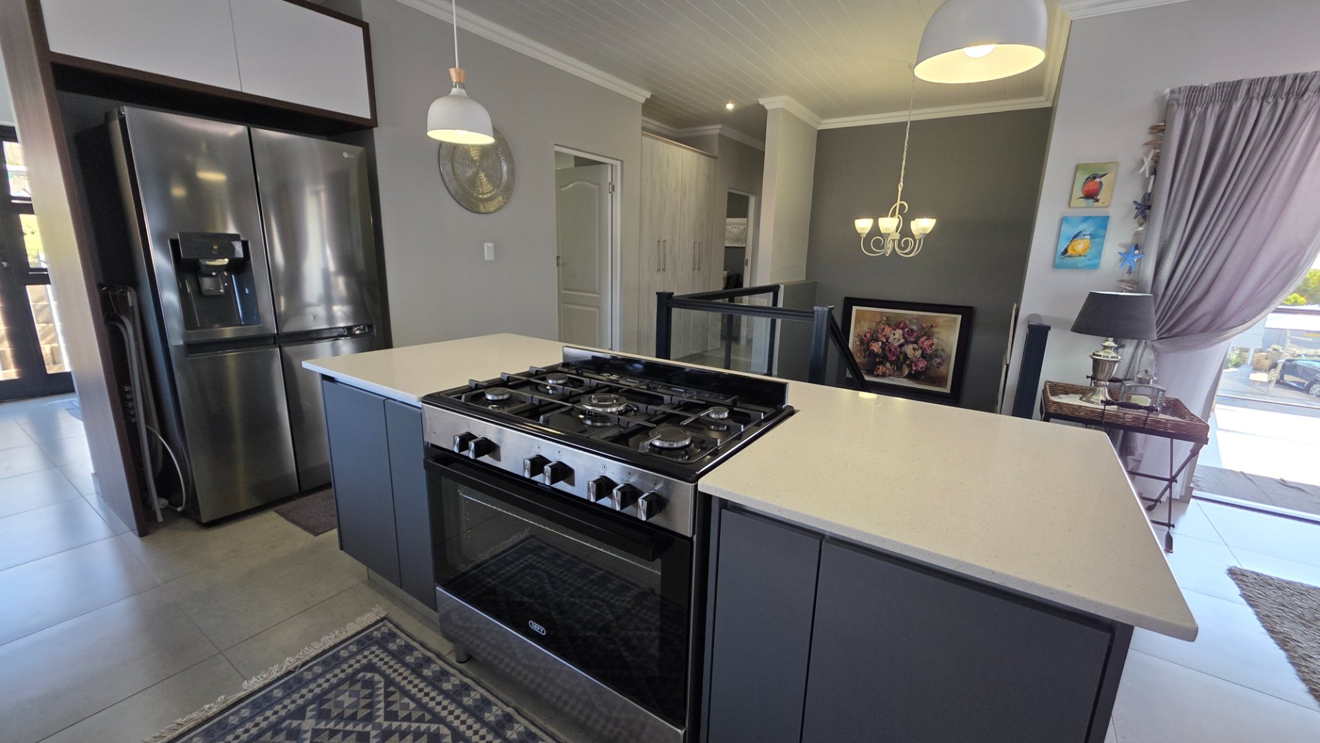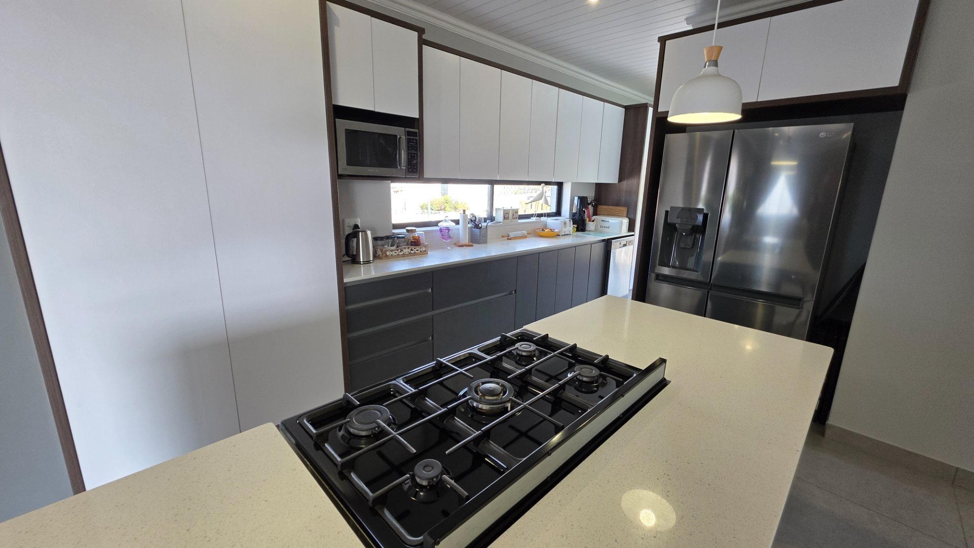 Upper Level: Three bedrooms with two bathrooms (main en suite), spacious open plan living area, beautiful and modern kitchen with separate scullery and island cabinet as well as a large balcony with built in braai and beautiful mountain and sea views in the distance.