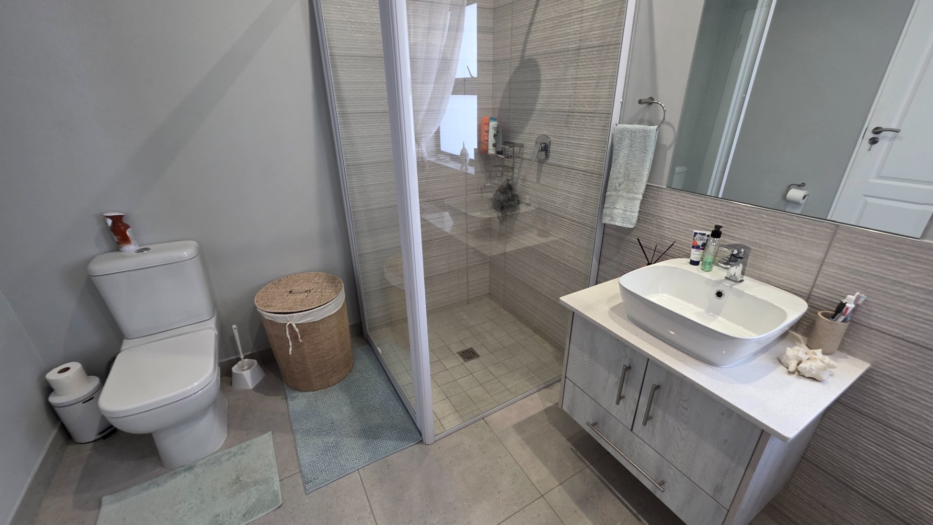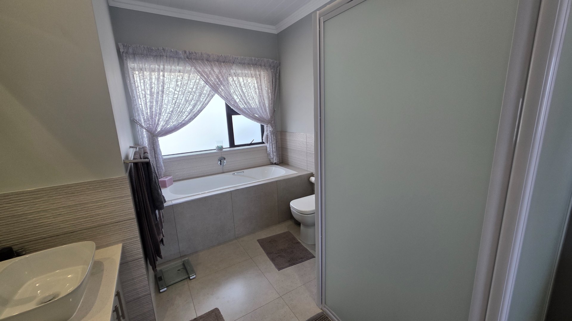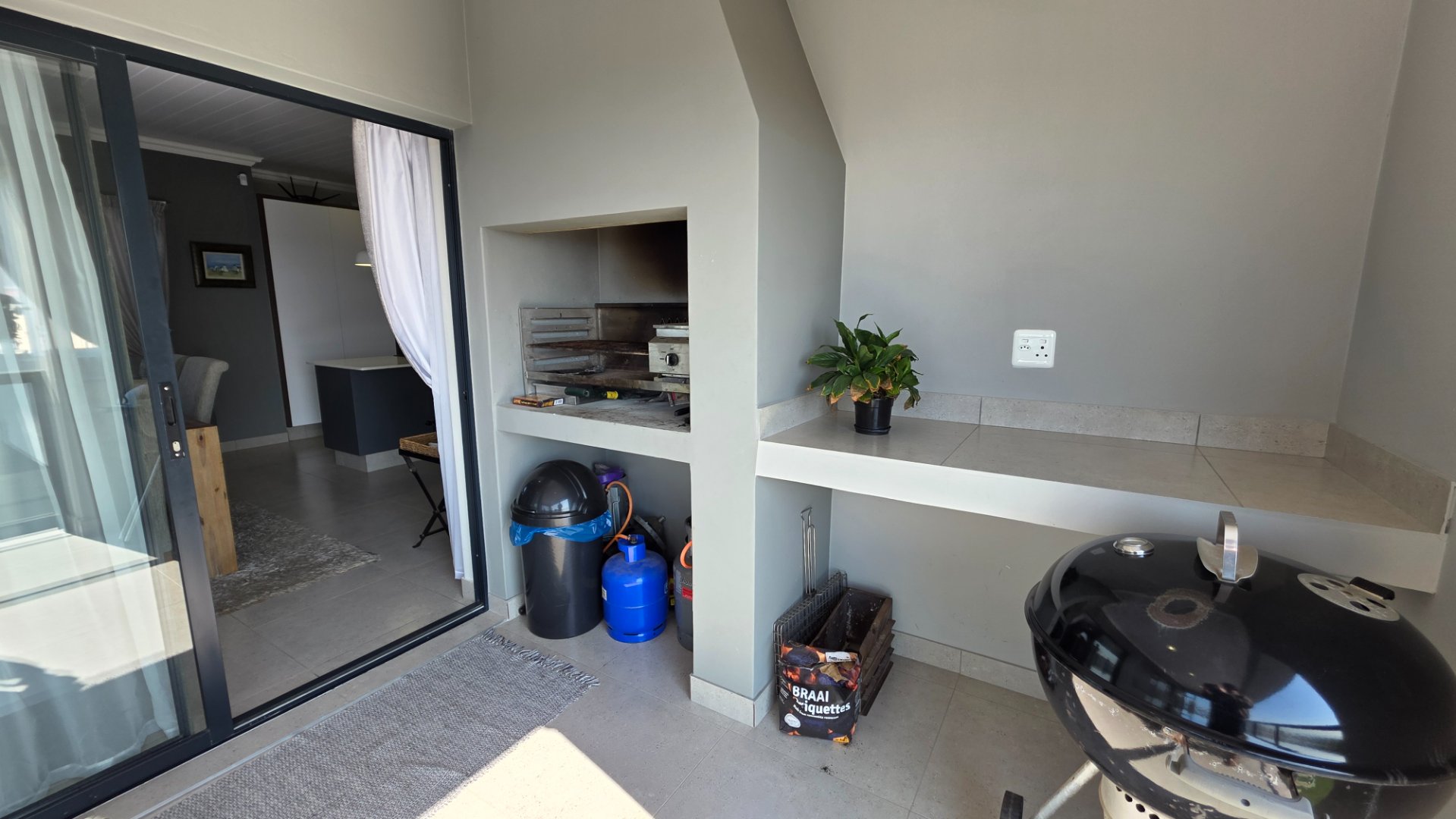 Upper Level: Three bedrooms with two bathrooms (main en suite), spacious open plan living area, beautiful and modern kitchen with separate scullery and island cabinet as well as a large balcony with built in braai and beautiful mountain and sea views in the distance.