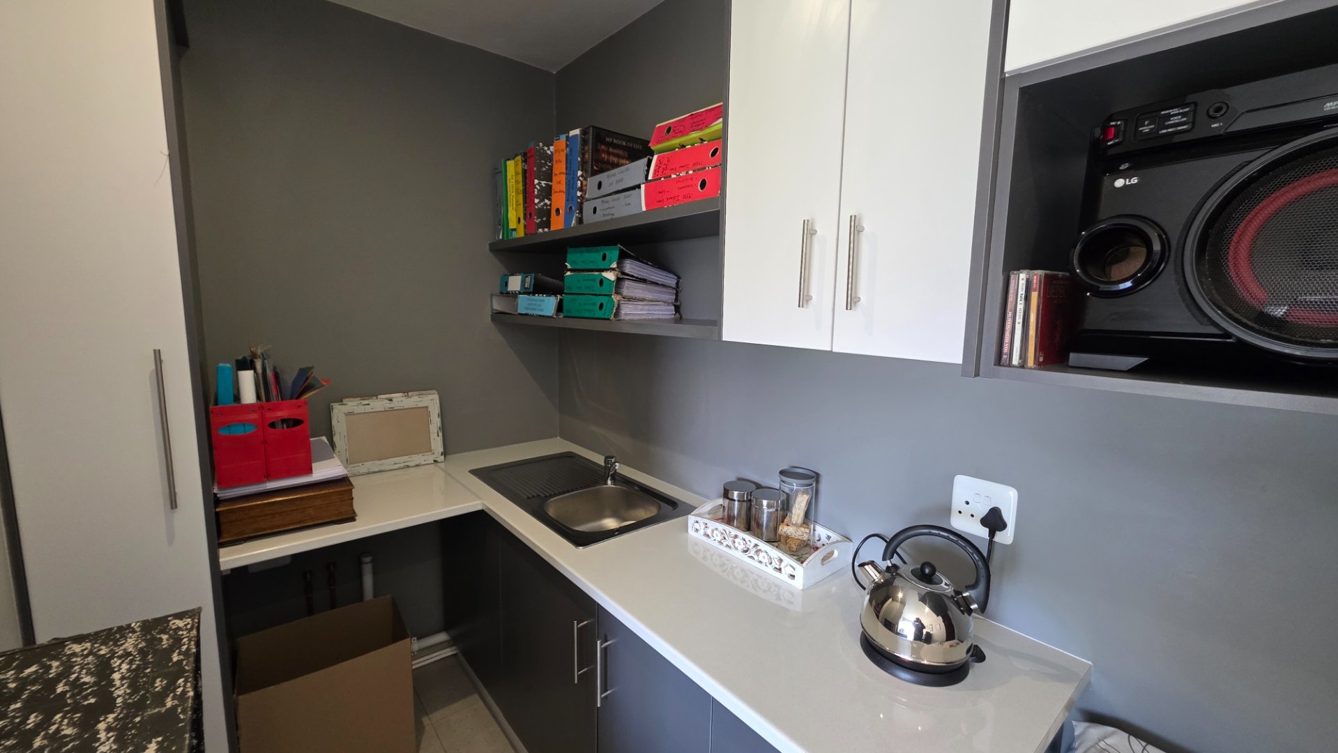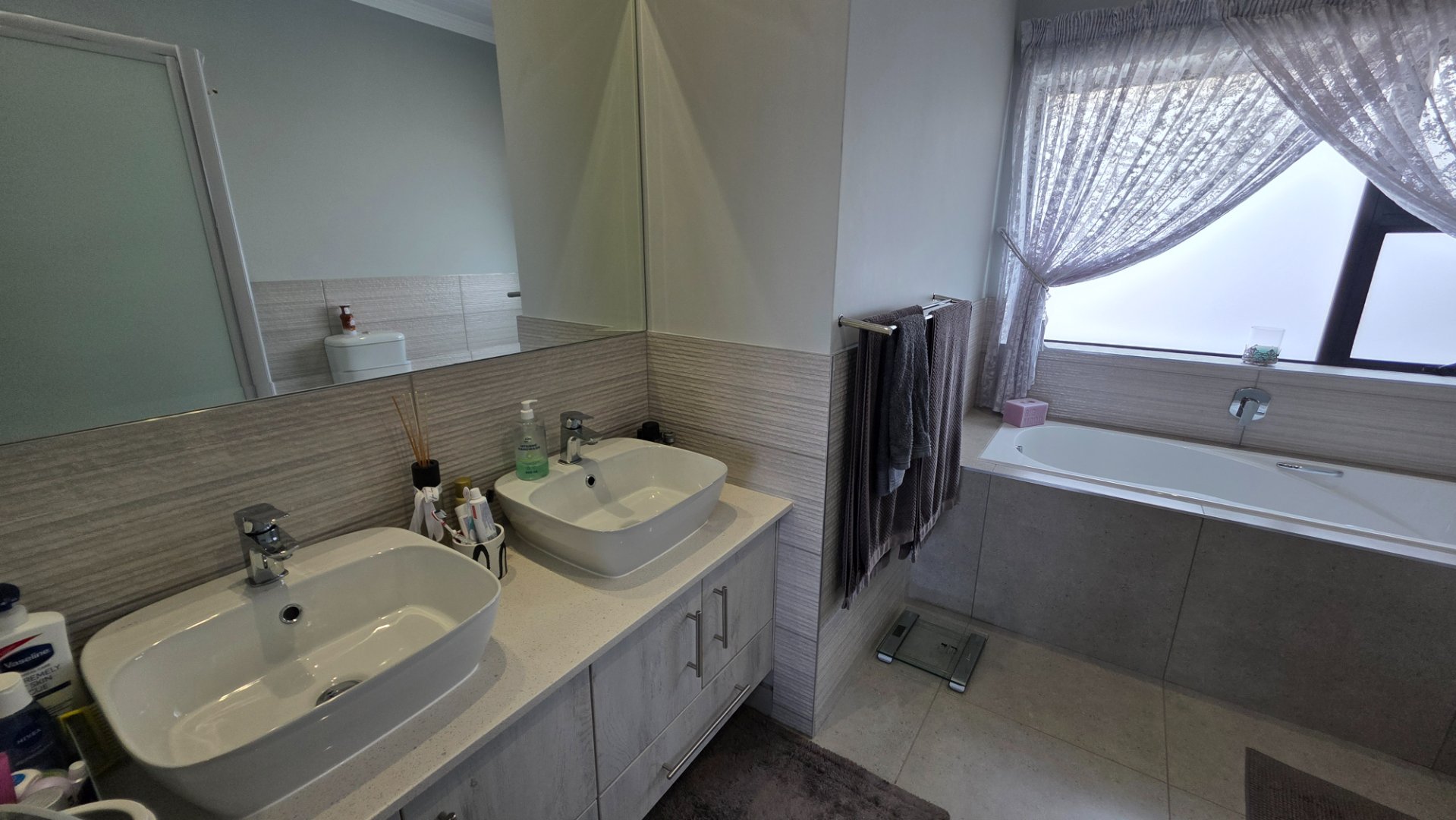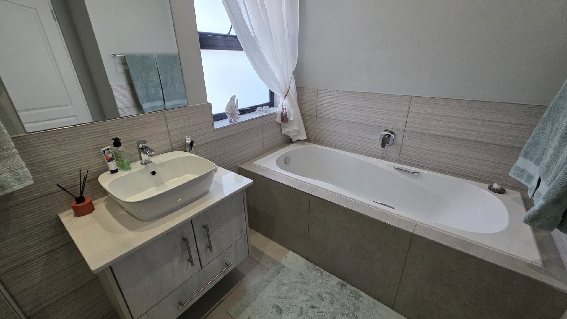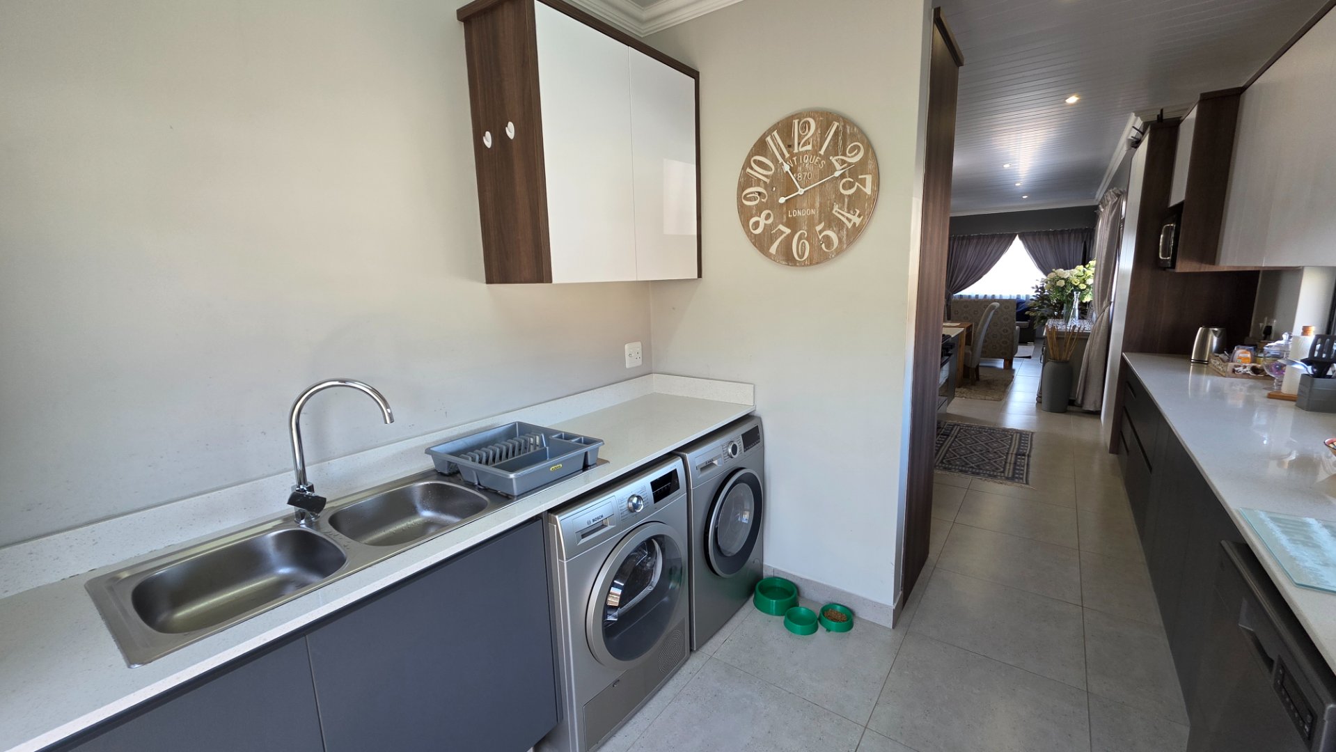Upper Level: Three bedrooms with two bathrooms (main en suite), spacious open plan living area, beautiful and modern kitchen with separate scullery and island cabinet as well as a large balcony with built in braai and beautiful mountain and sea views in the distance.