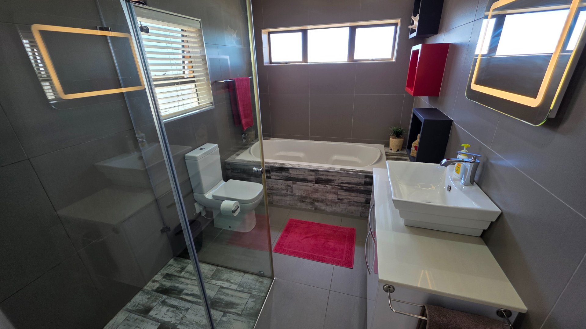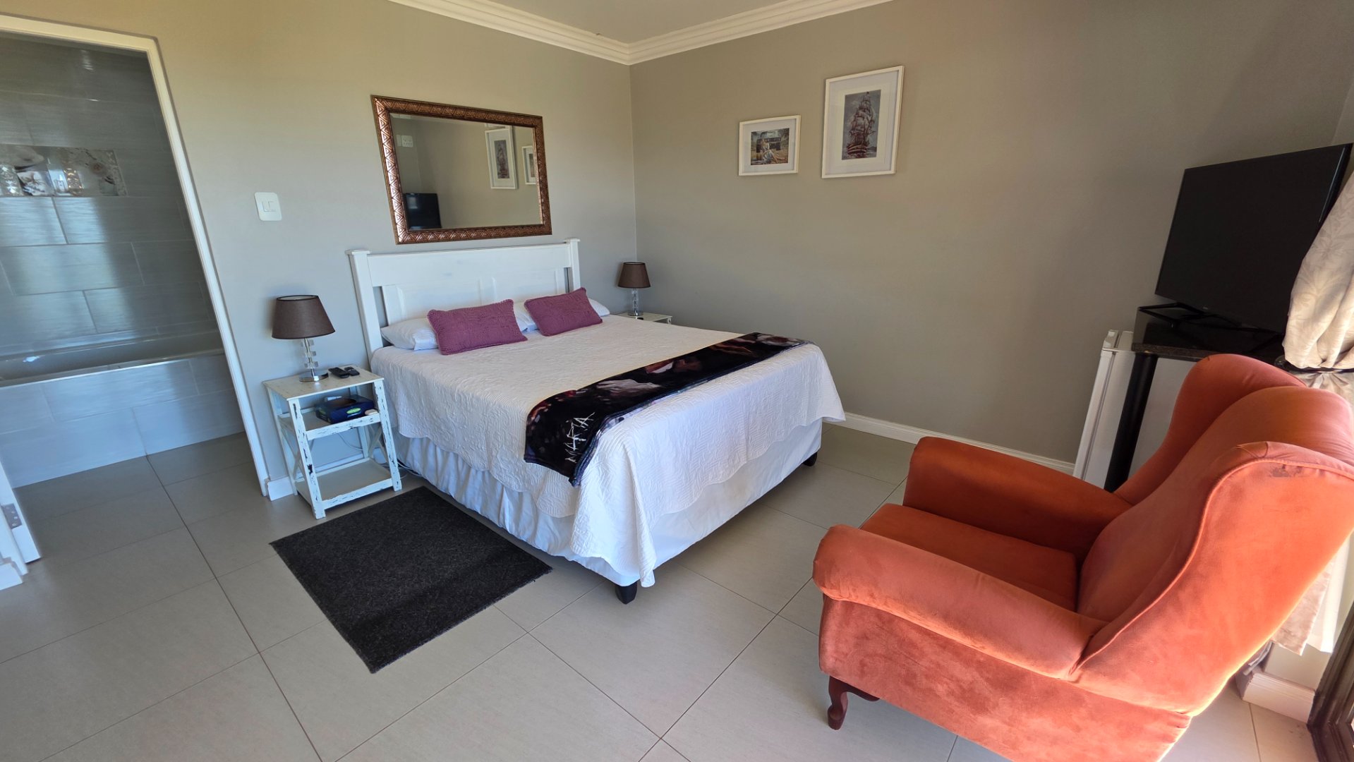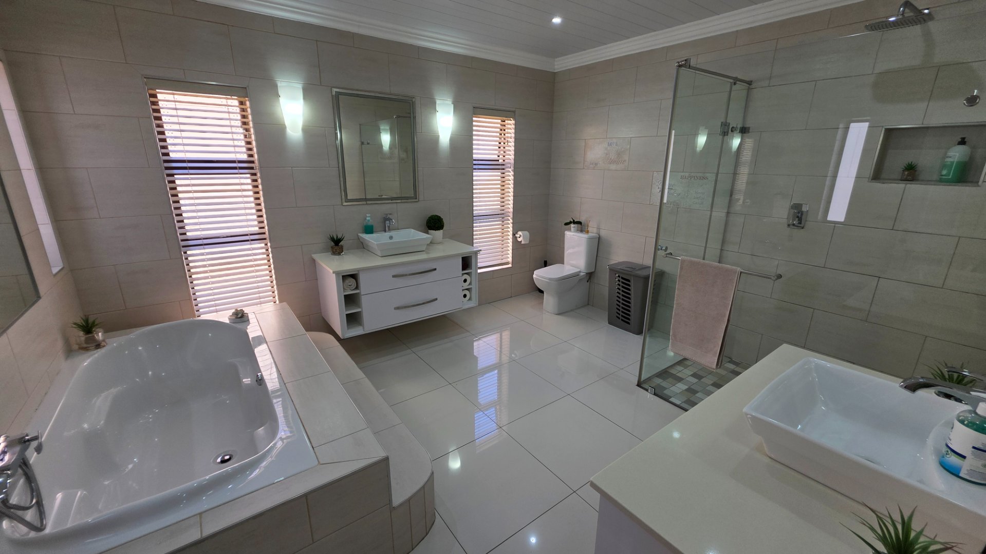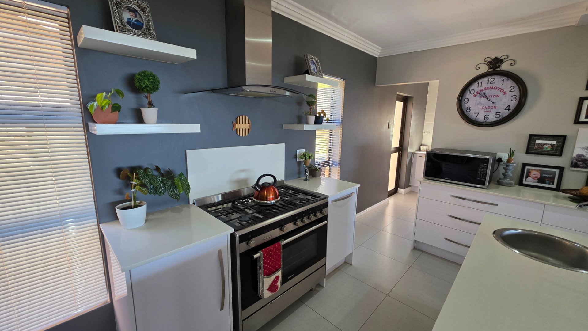This extremely neat house is well designed with ease of living in mind whilst enjoying excellent mountain and ocean views. Situated in a popular neighbourhood between the coastal towns of Hartenbos and Mossel Bay and in close proximity to a large shopping mall as well as easy access to the N2 highway. At lower level the house offers a spacious bedroom with full bathroom en suite as well as an extra large double garage with a third garage adjacent that is perfect for storage of another vehicle or workroom as well as an outside bedroom with bathroom en suite. Upstairs you will find a spacious open plan living area, large balcony with exquisite views, modern kitchen with separate scullery, study room, large main bedroom with walk-in cupboards and full bathroom en suite, large guest bedroom with full bathroom en suite as well as a guest toilet for protection of your privacy and the comfort of your guests. The large bonus for this house is the spacious one bedroom apartment with kitchen, lounge and full bathroom that is completely separate from the main house and can be rented out for additional income if you wish. This well designed and well built house is in a class of its own and deserves to be seen to be appreciated. For more information or appointment to view you are welcome to contact me.