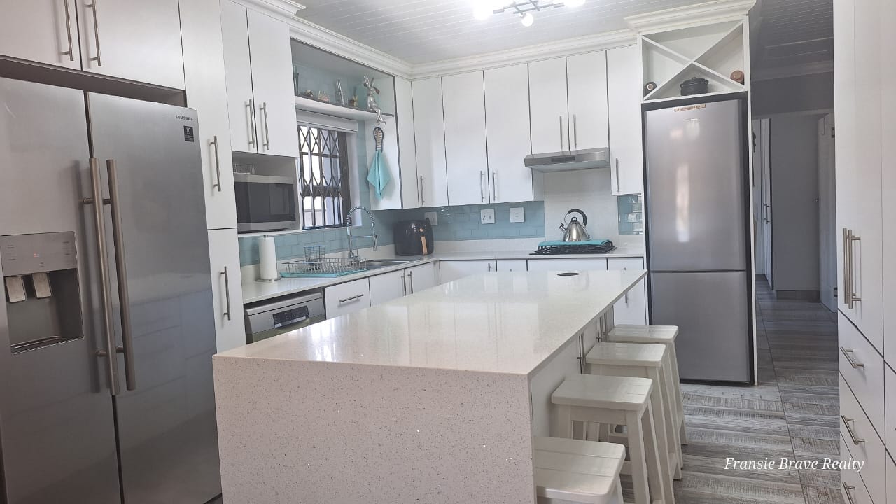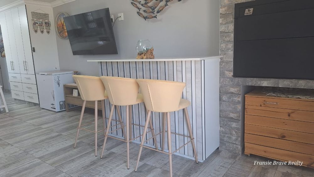 The open plan lounge host a built in braai as well as a bar counter for comfort entertainment. Modern white floor tiles and a air conditioner to keep the property cool. The lounge door leads the verandah overlooking the ocean. All sliding doors and windows are equipped with trelidoor and sieff slides.