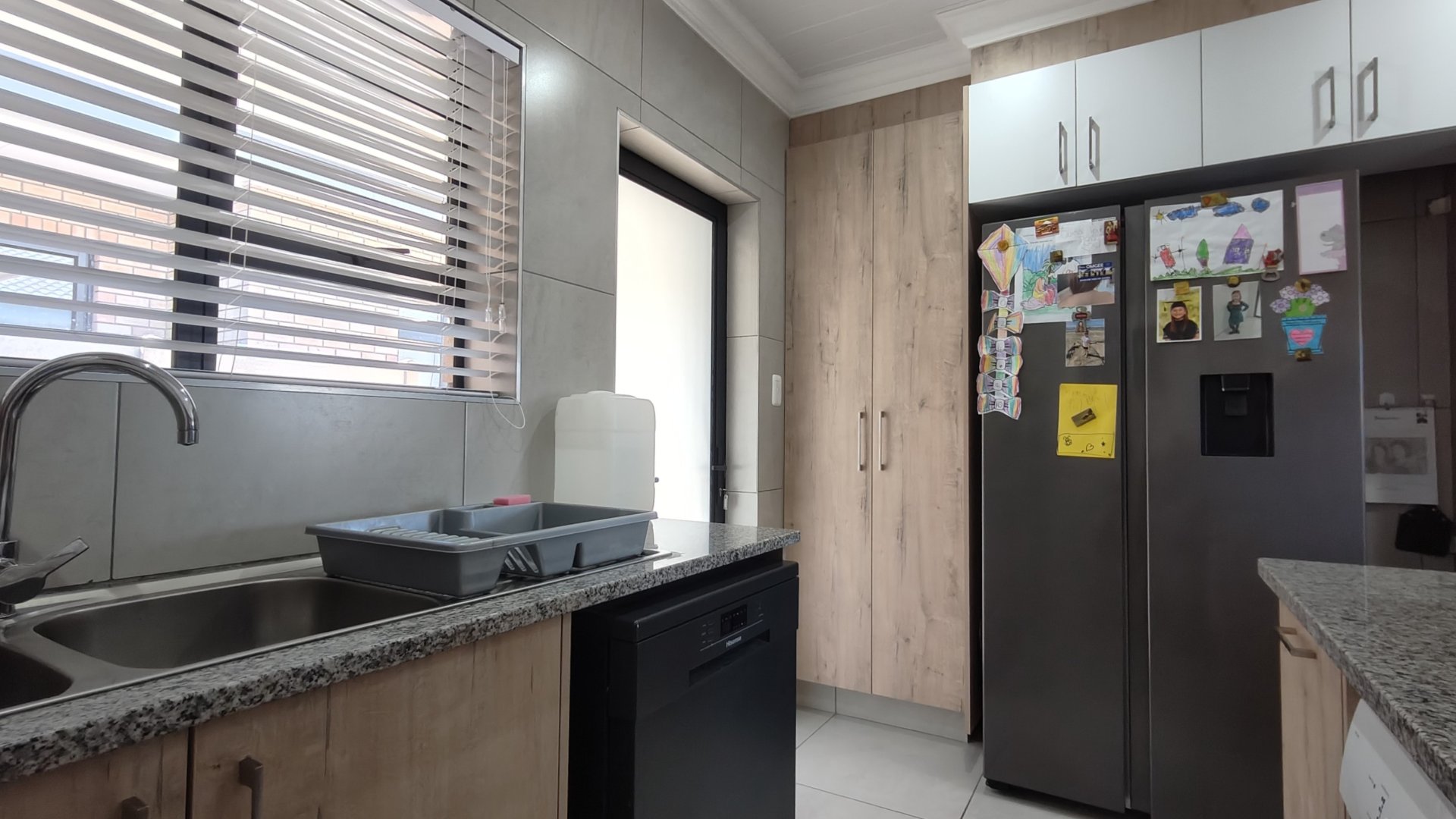 The well-designed kitchen features ample cupboard space, a built-in oven, and a separate scullery with direct access to the double garage and private courtyard.