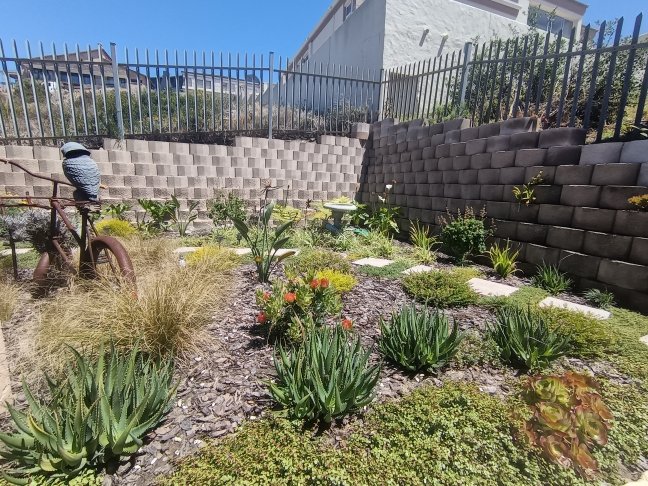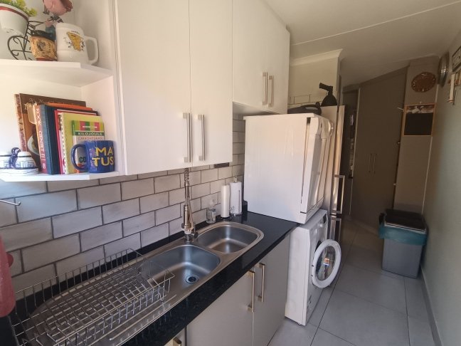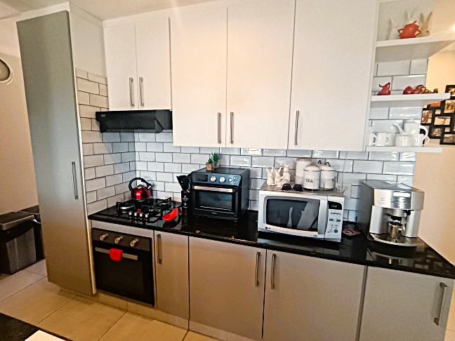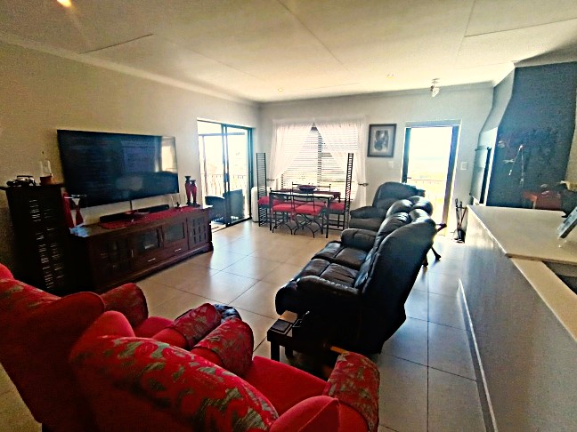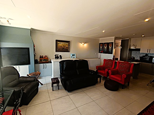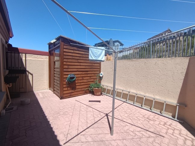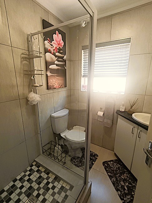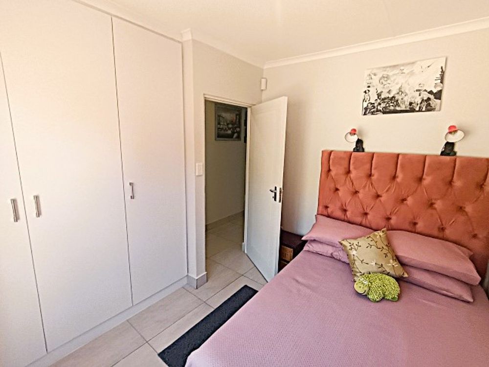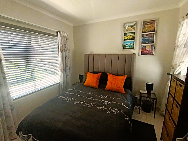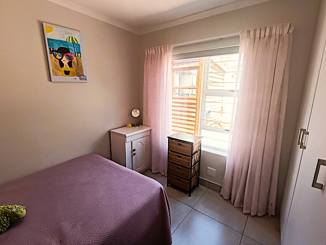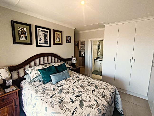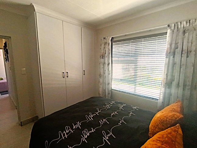 All three bedrooms have built-in cupboards, while the main bedroom offers an en-suite bathroom with a large walk-in shower. A second modern bathroom serves the remaining bedrooms. On the ground floor, the extra-large automated double garage includes direct home access and a professionally installed walk-in safe—an exceptional feature offering both convenience and security. Outside, the landscaped, low-maintenance garden is filled with indigenous plants and includes a Wendy house for additional storage.