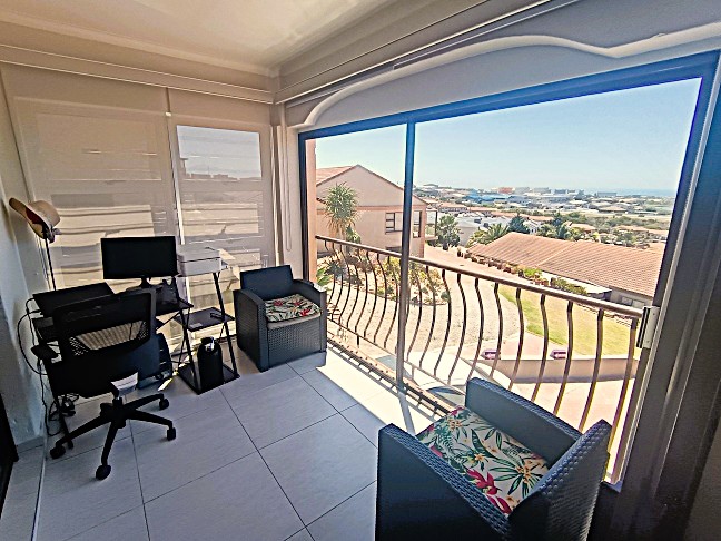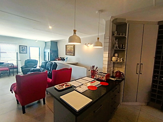 Enter the house through a secure front entrance and make your way to the main living areas with ease, assisted by a convenient stairlift that can be removed if not required. The upper level welcomes you into a bright, open-plan living space featuring a spacious tiled family room with a built-in braai and door to a small balcony where you can soak in sweeping ocean vistas. Through a sliding door enter the versatile sunroom or study, framed by large windows and fitted with roll-down blinds, providing the perfect spot to work, read, or unwind while gazing out over the sea.