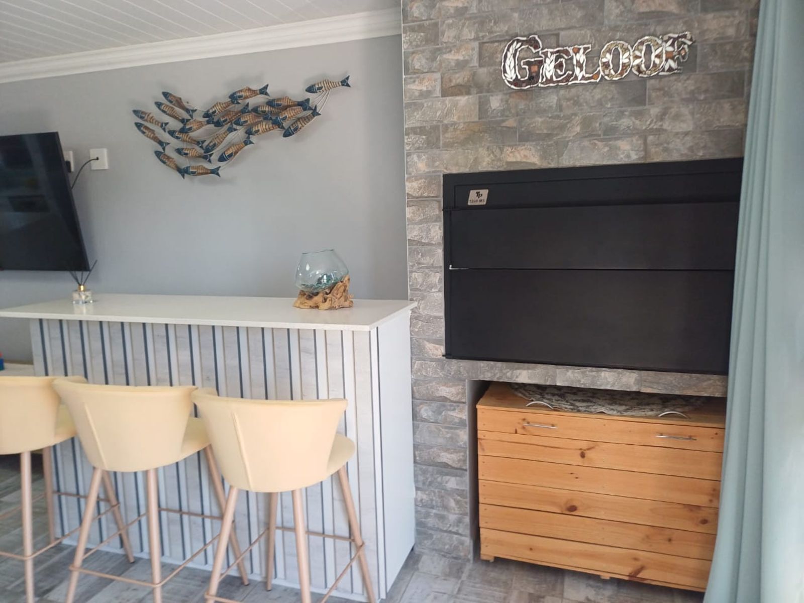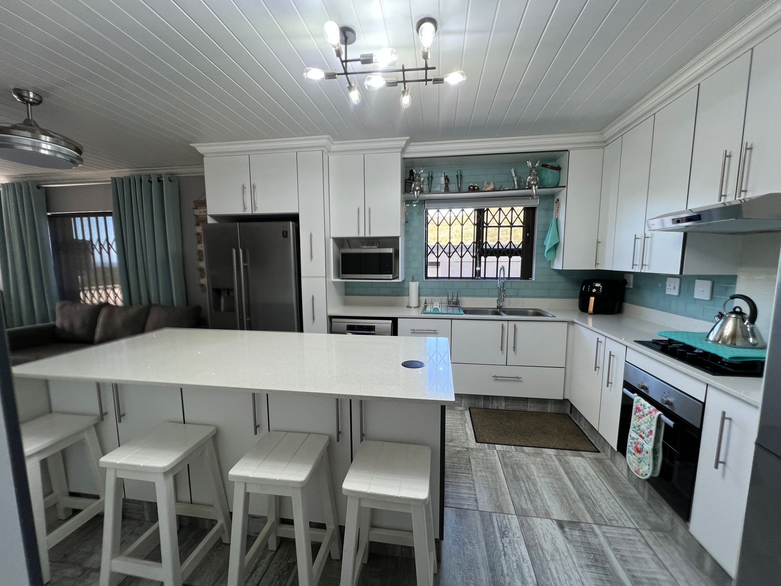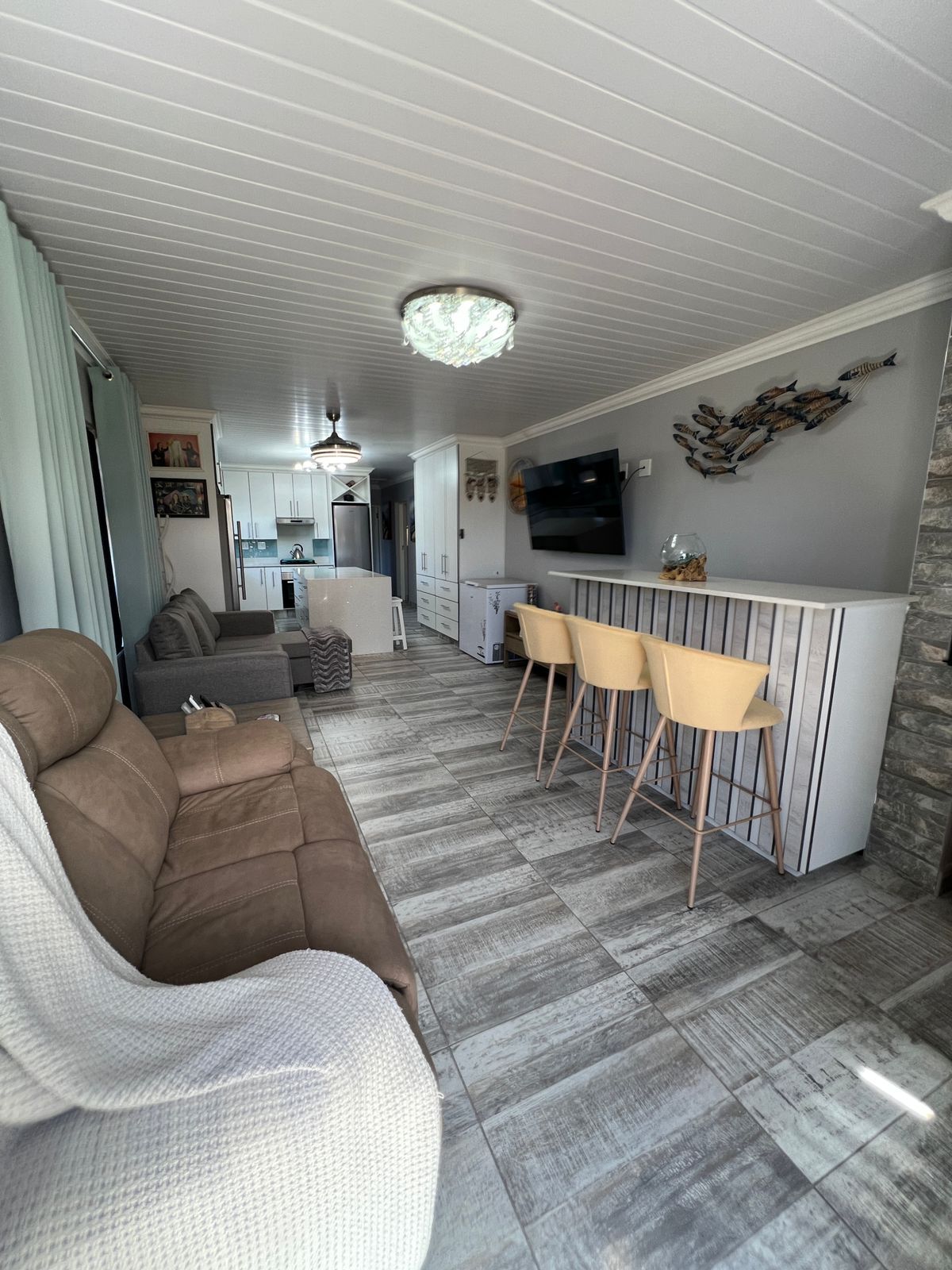 Step inside to an inviting open-plan living area featuring a built-in indoor braai, ideal for year-round entertaining. The sleek kitchen flows seamlessly into the lounge, offering easy access to all living spaces. Both bathrooms are stylishly fitted and include extractor fans for added freshness and comfort.
