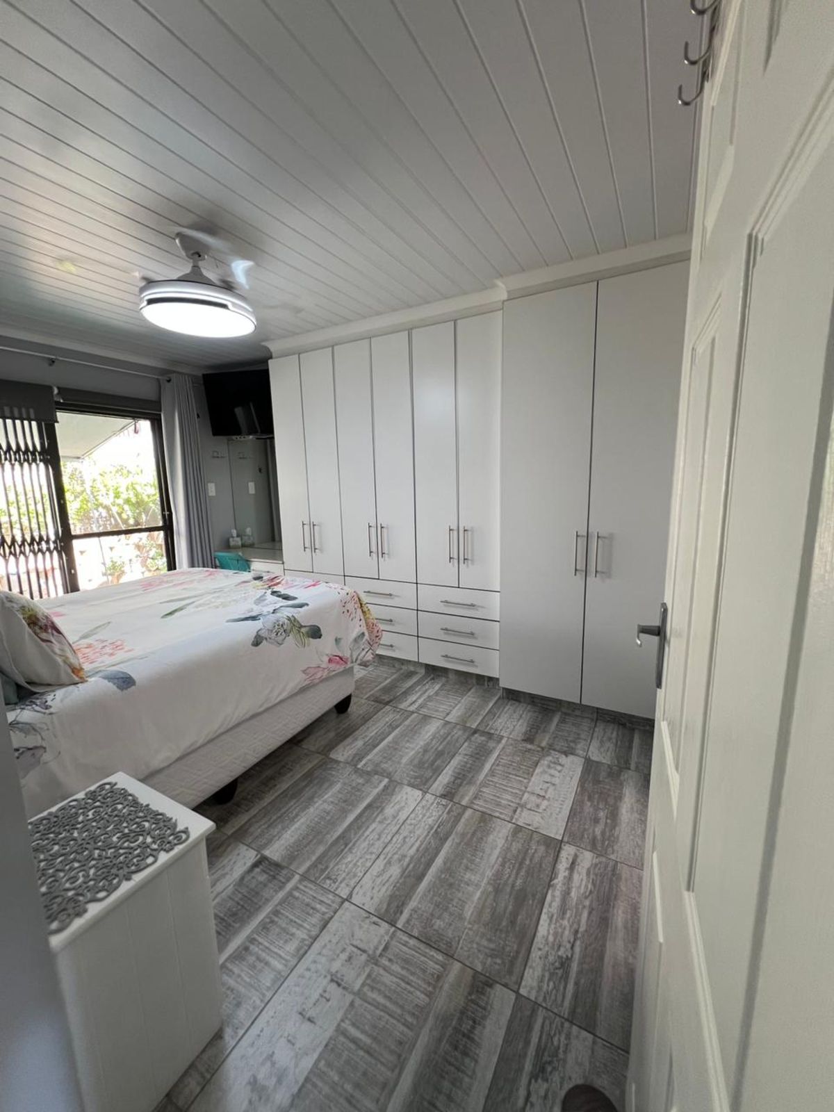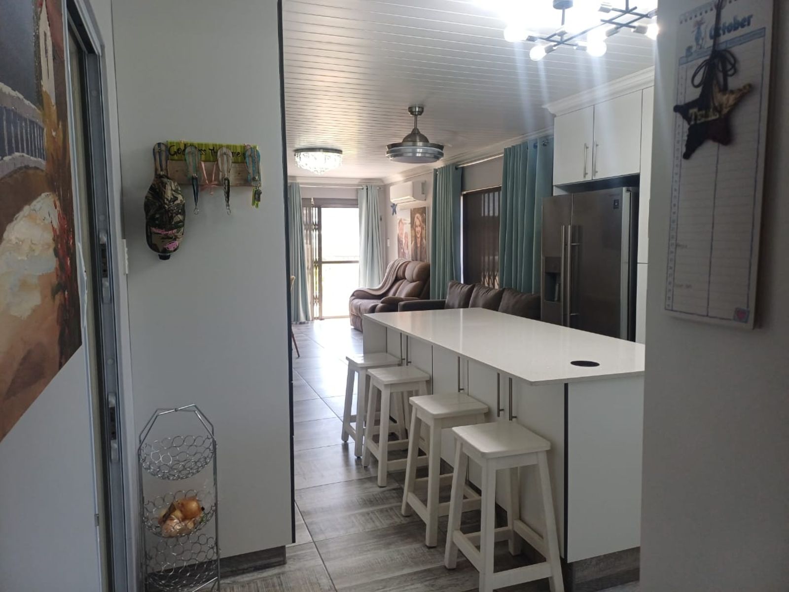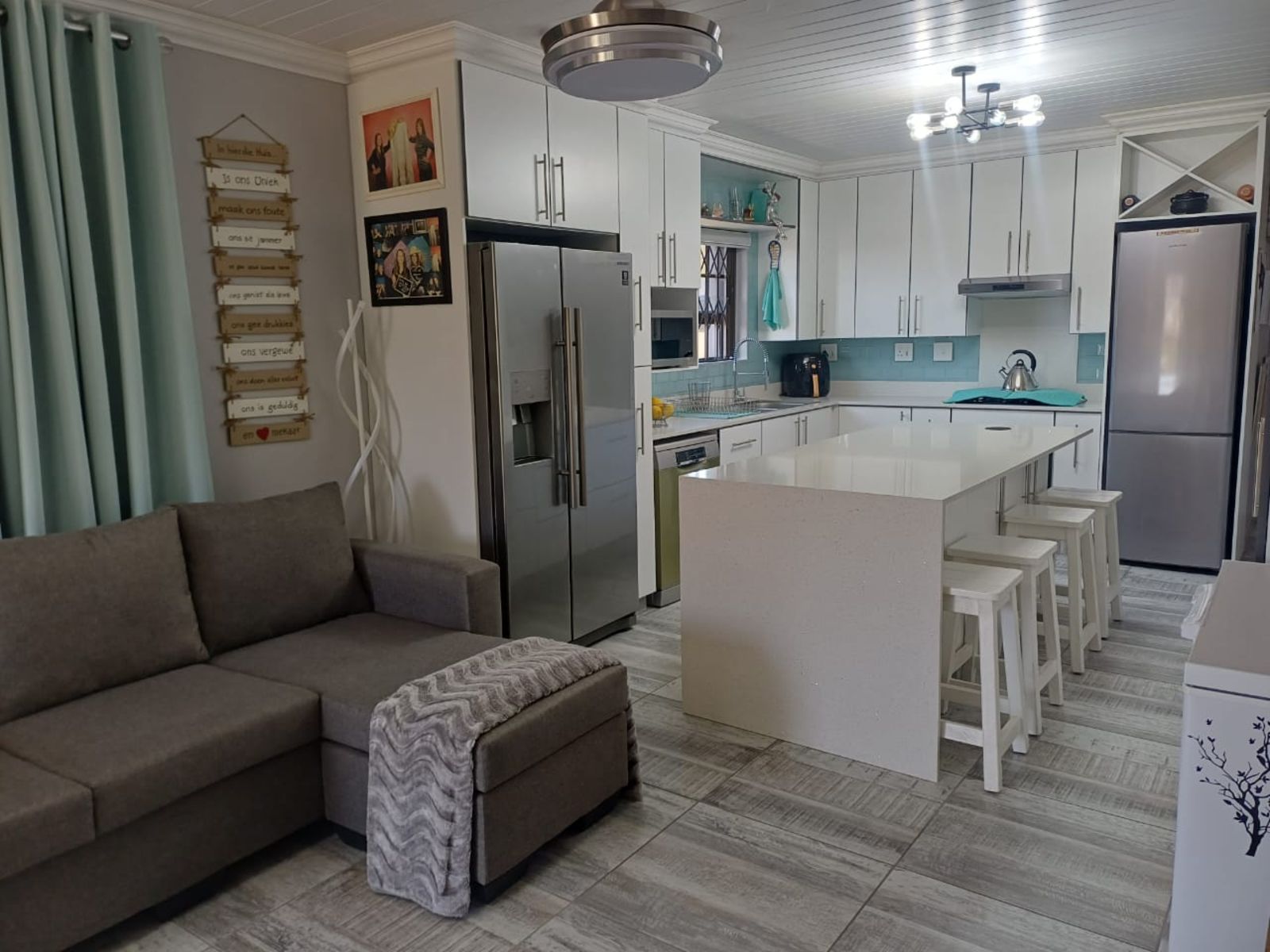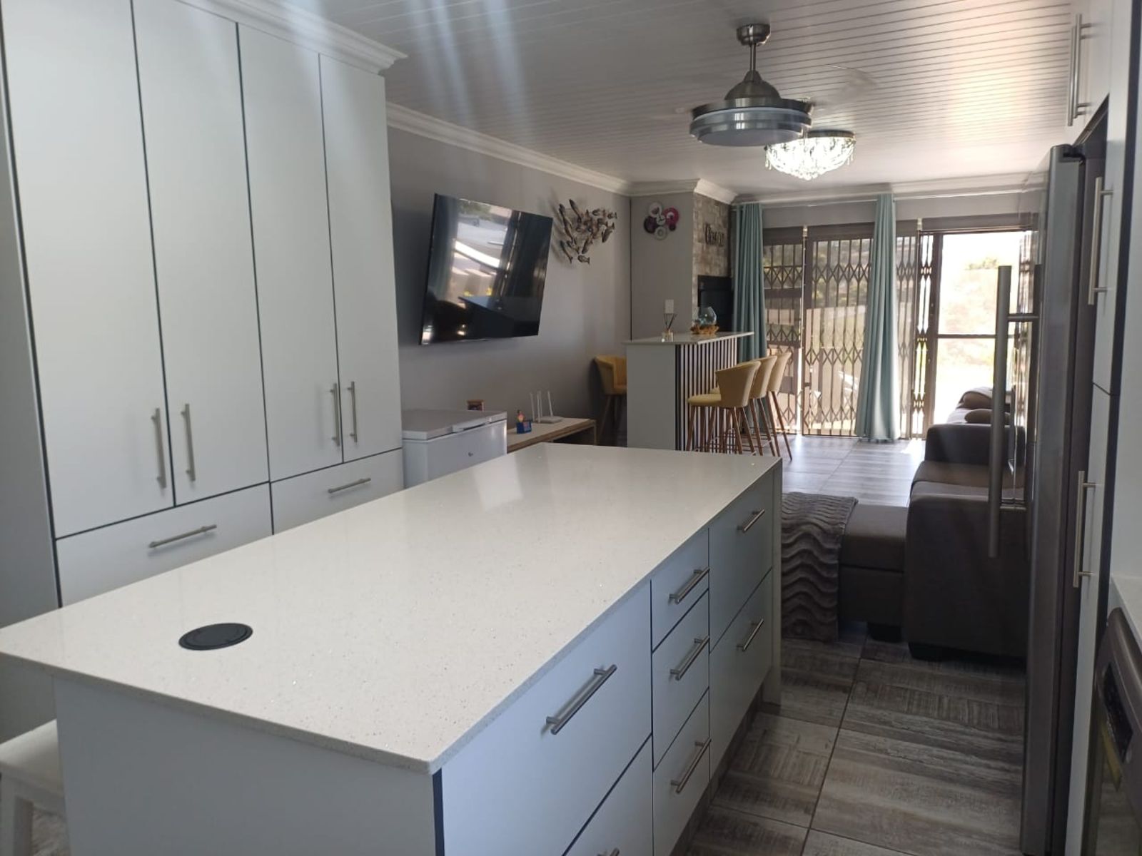 Step inside to an inviting open-plan living area featuring a built-in indoor braai, ideal for year-round entertaining. The sleek kitchen flows seamlessly into the lounge, offering easy access to all living spaces. Both bathrooms are stylishly fitted and include extractor fans for added freshness and comfort.