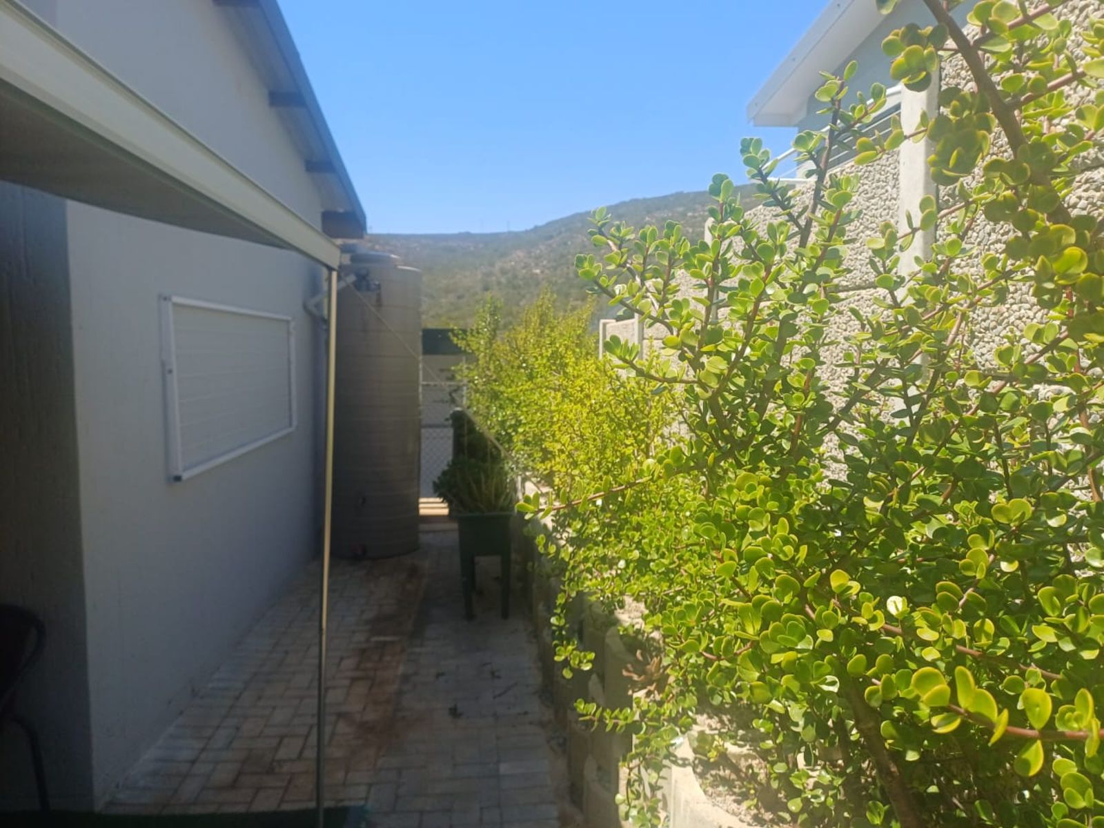 A single garage provides secure parking, while outside, you’ll find a water tank for sustainable water use — a feature increasingly valuable in the Western Cape climate.