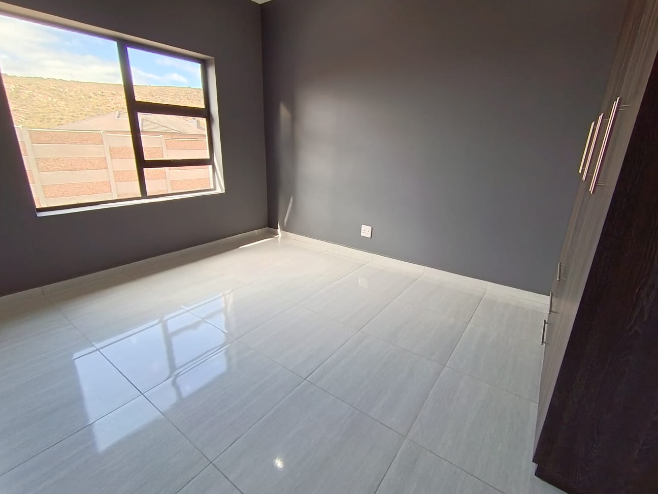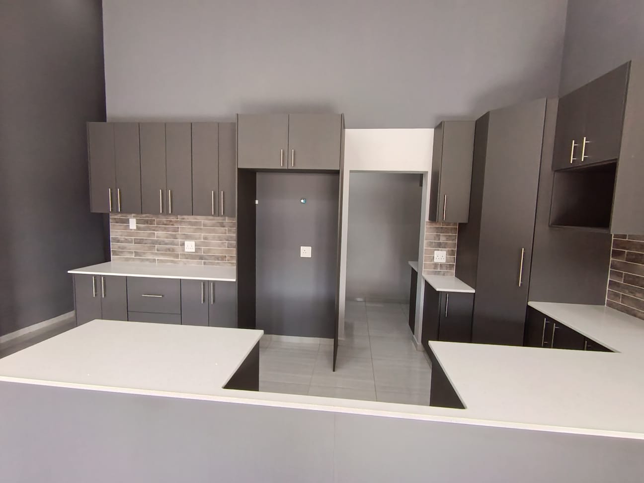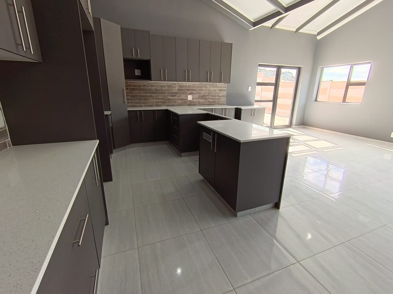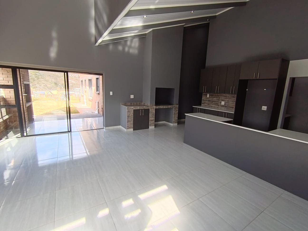 The heart of the home features an inviting open-plan layout, where the lounge, dining area, and kitchen merge into one bright, airy space. High ceilings and tall walls enhance the sense of volume, while a built-in indoor braai/fireplace ensures year-round comfort and gatherings.