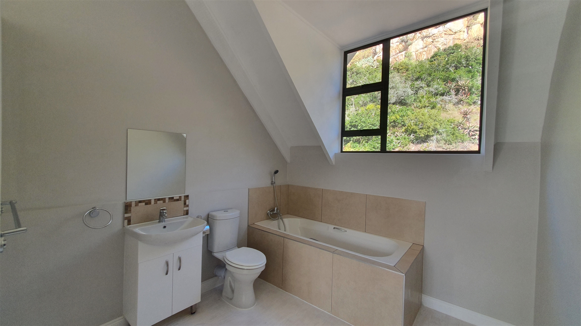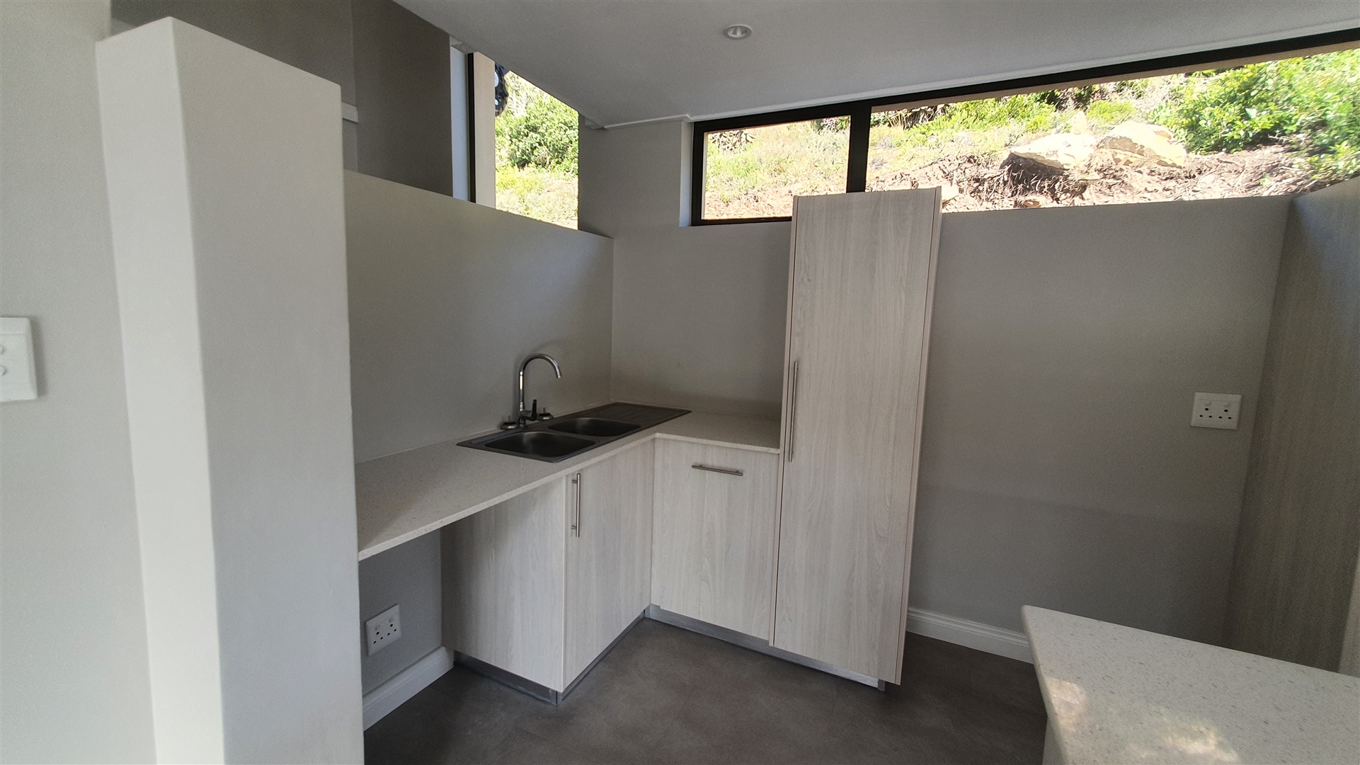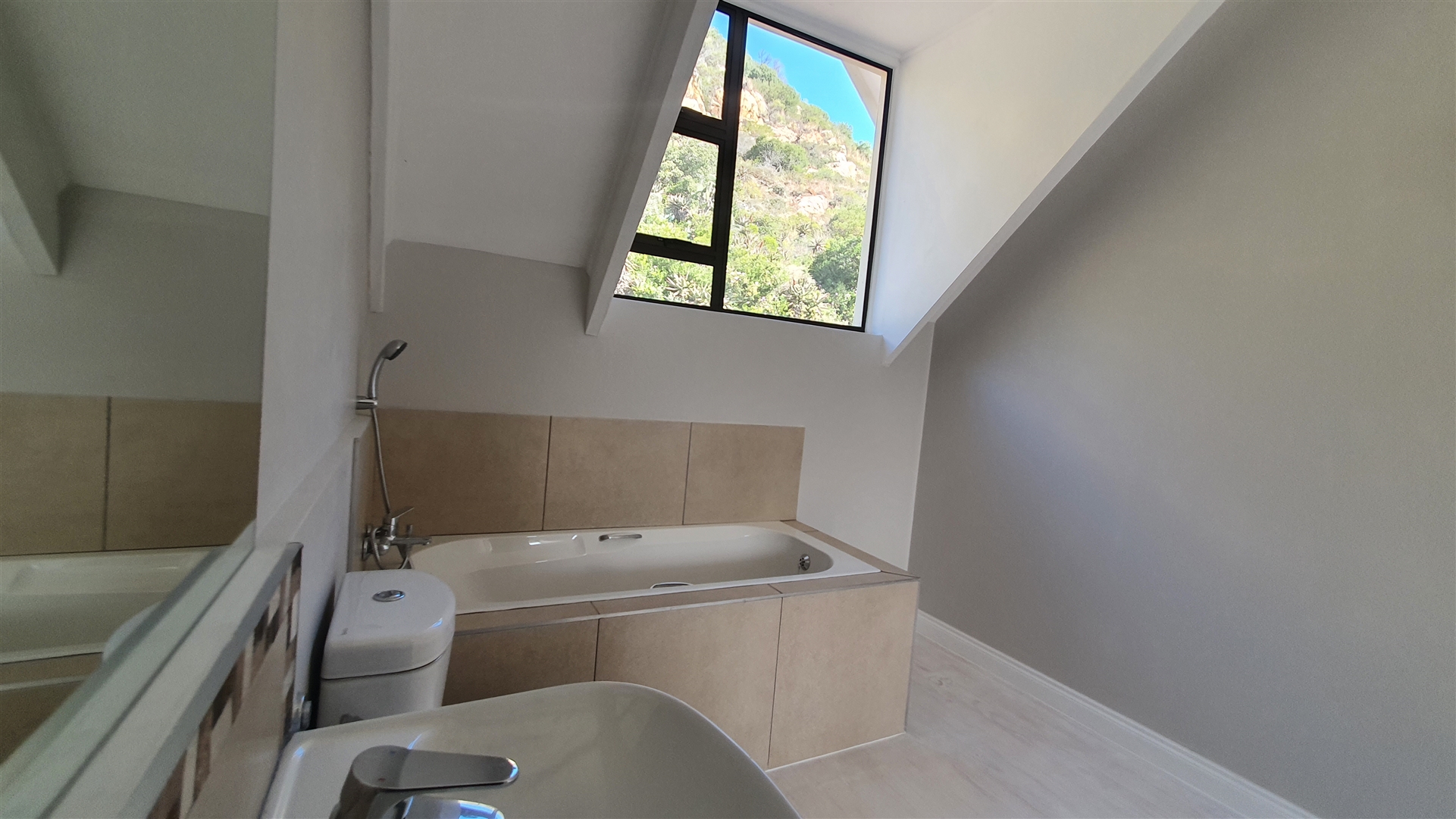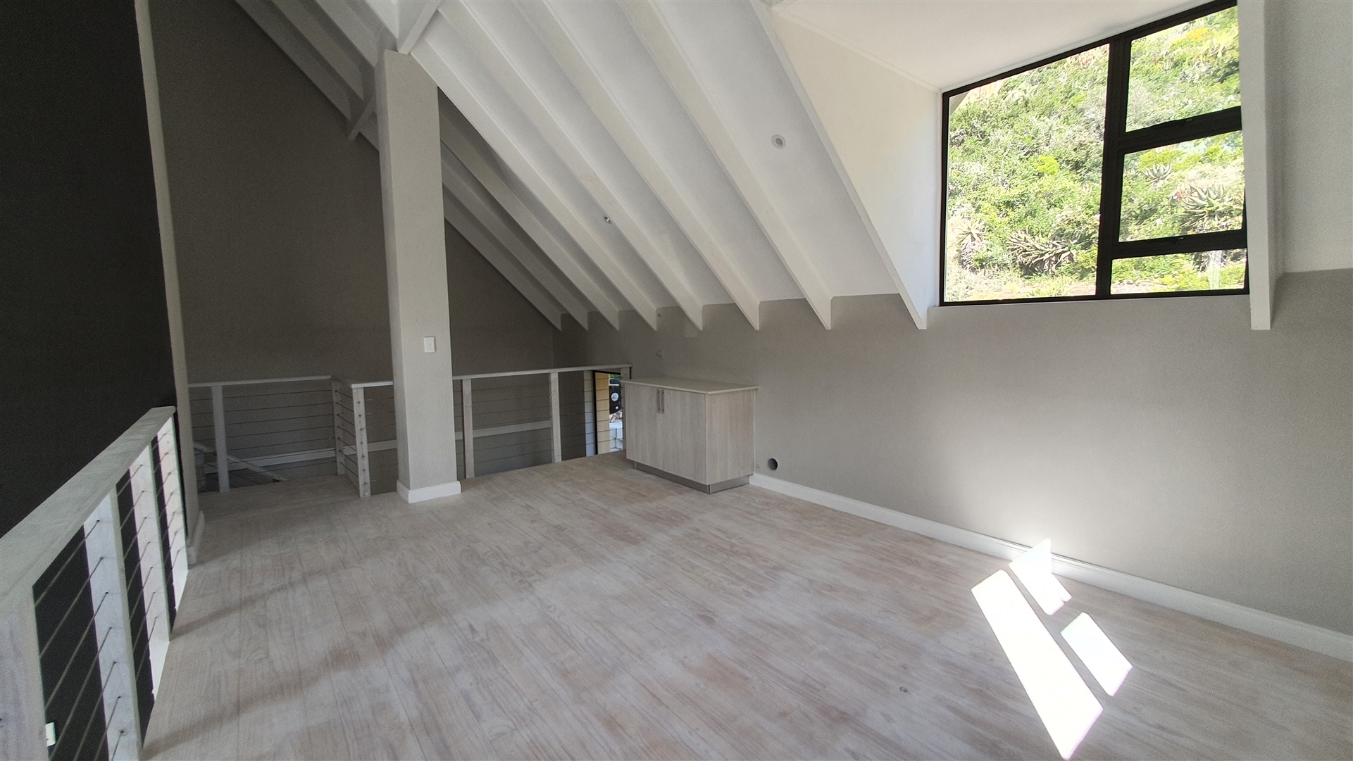 The family room will not disappoint you. With a cosy braai/fireplace, stacking doors opening onto a deck. While standing on this deck, you can just picture family and friends spending quality time together while enjoying the beautiful kloof and sea surroundings.