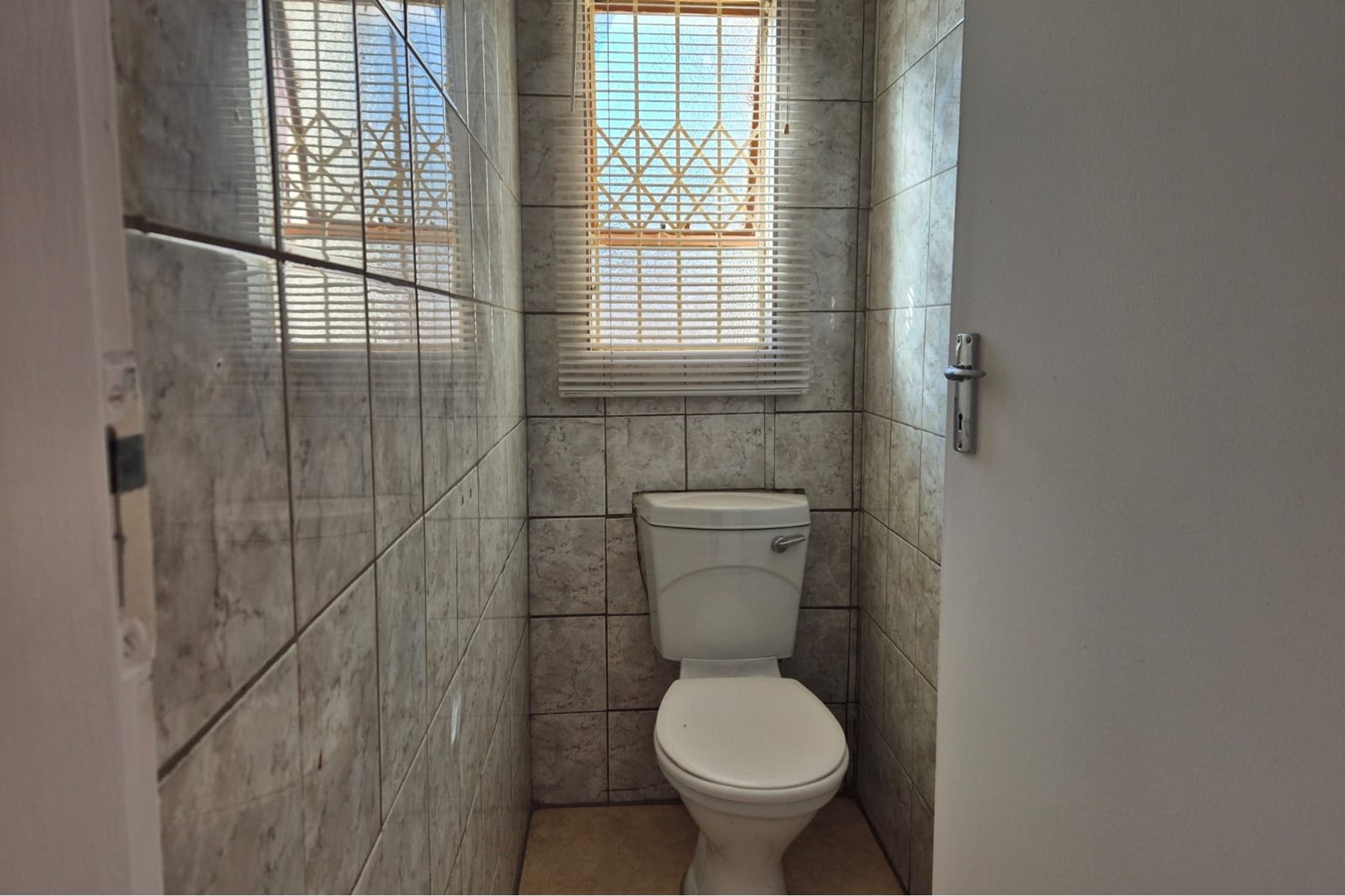 The interior is fully tiled and features a kitchen with fitted cupboards,