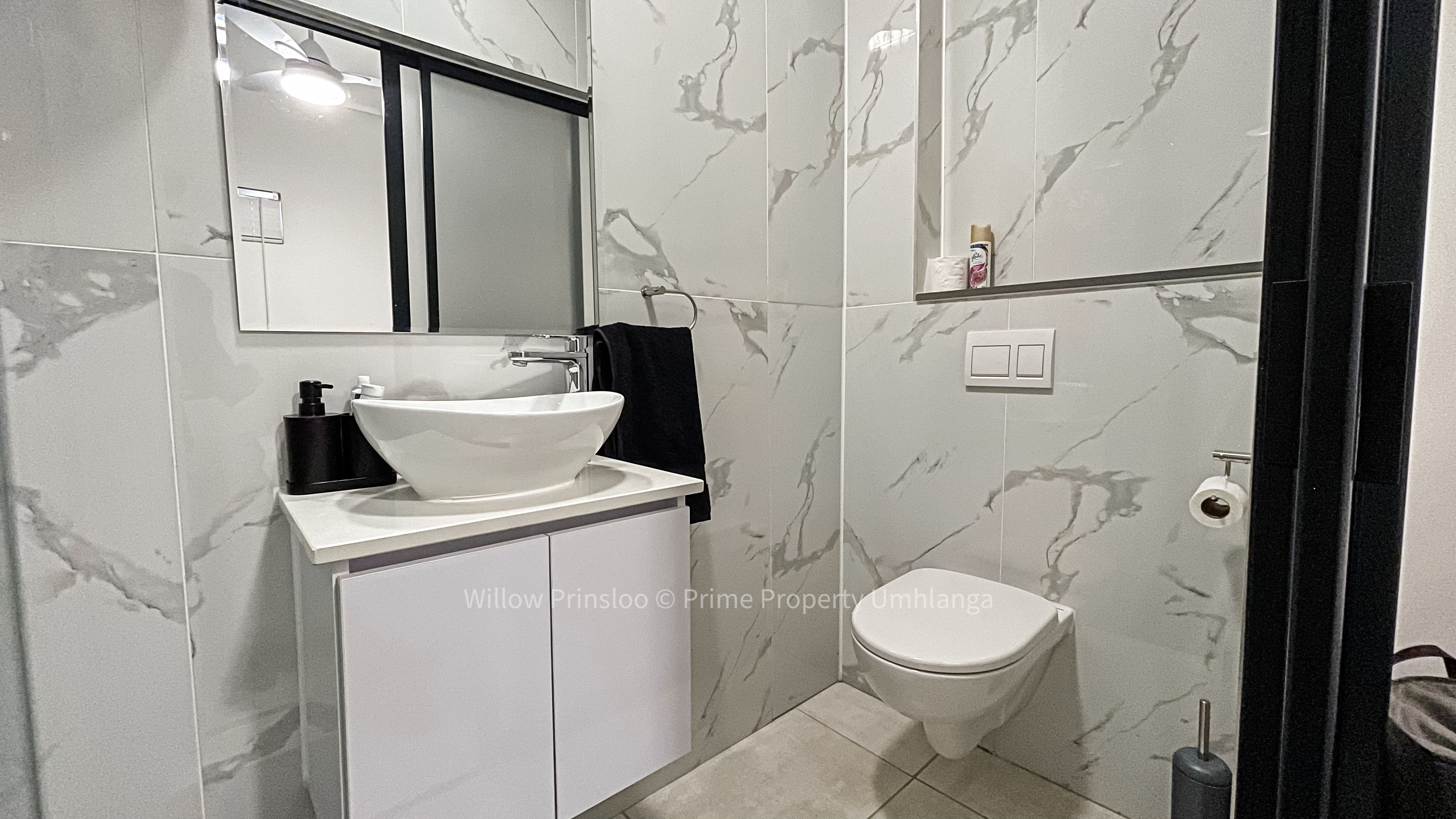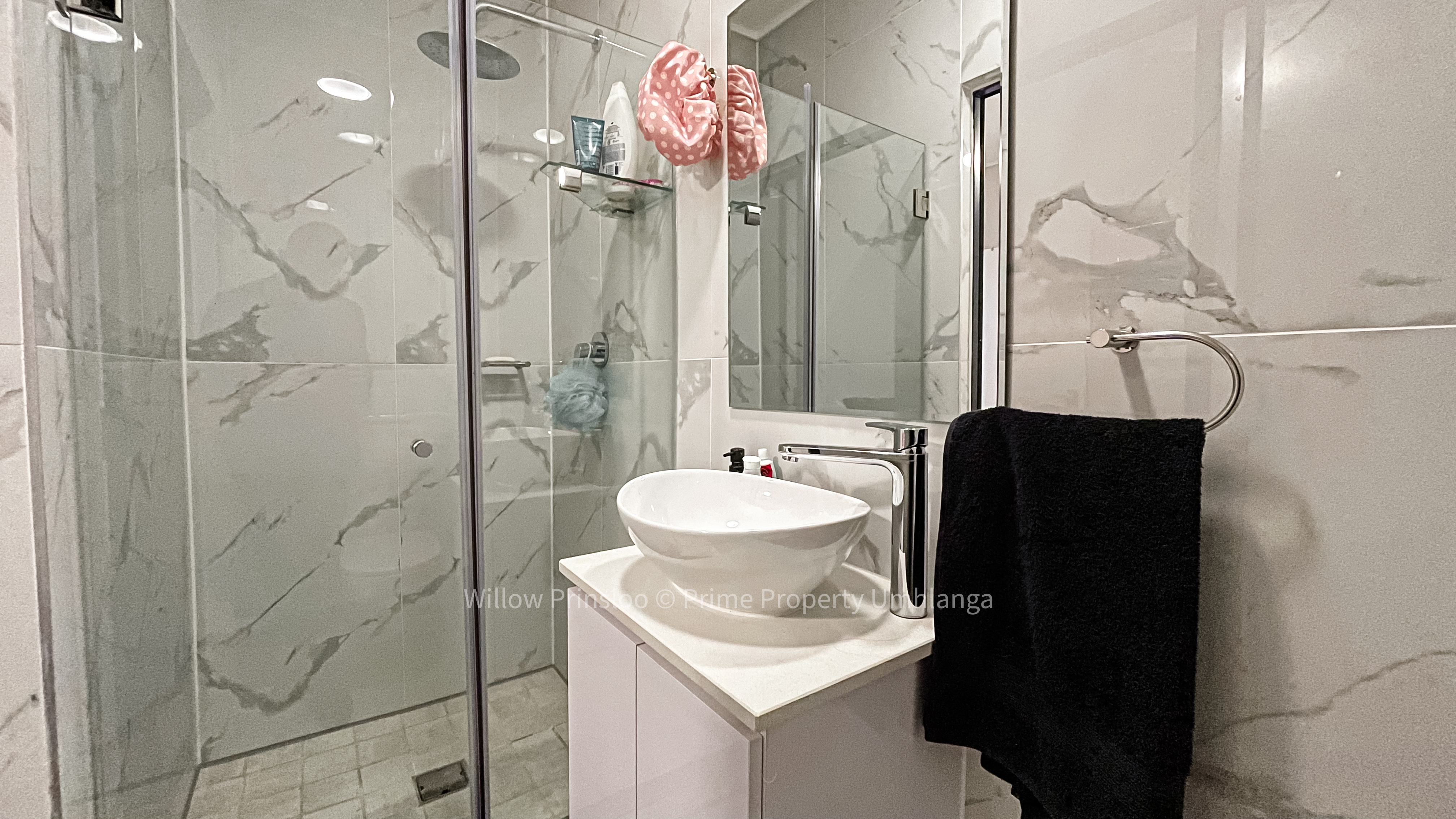 This apartment hosts 1 spacious bedroom and 1 modern bathroom with an additional basement storage unit.