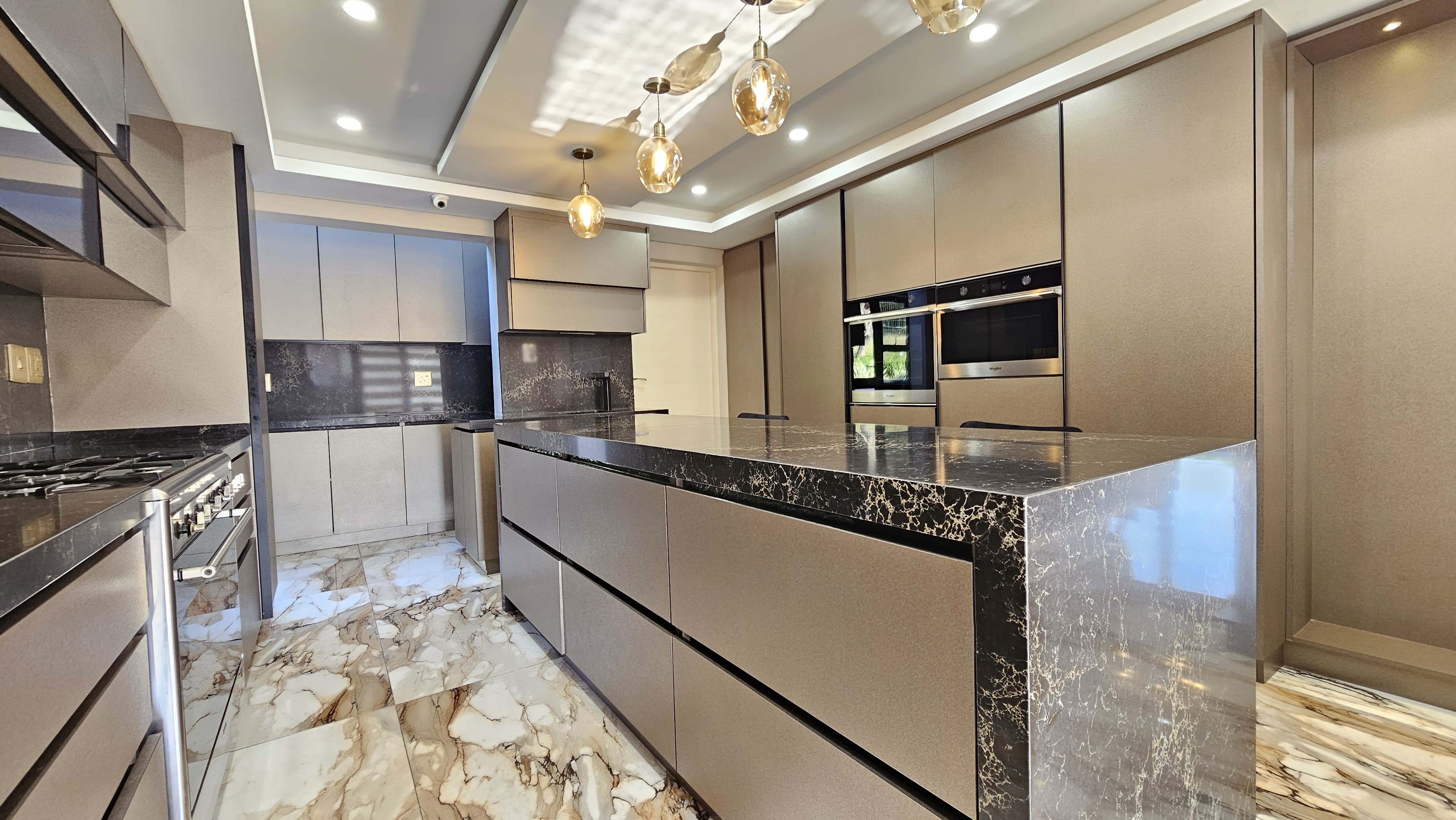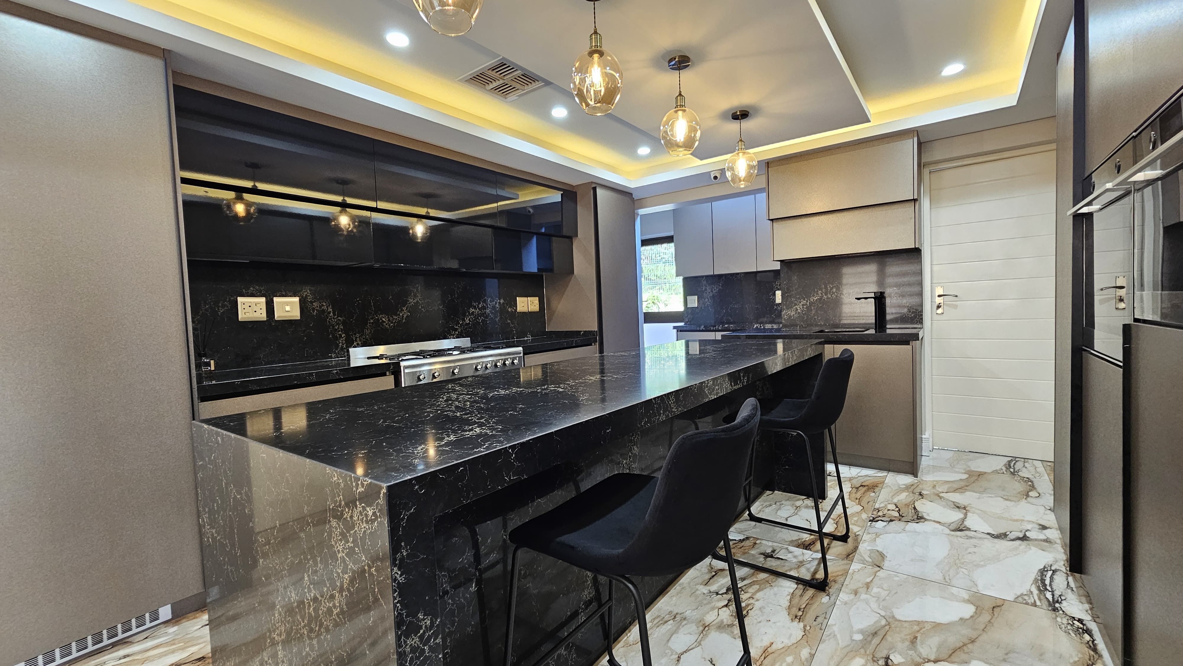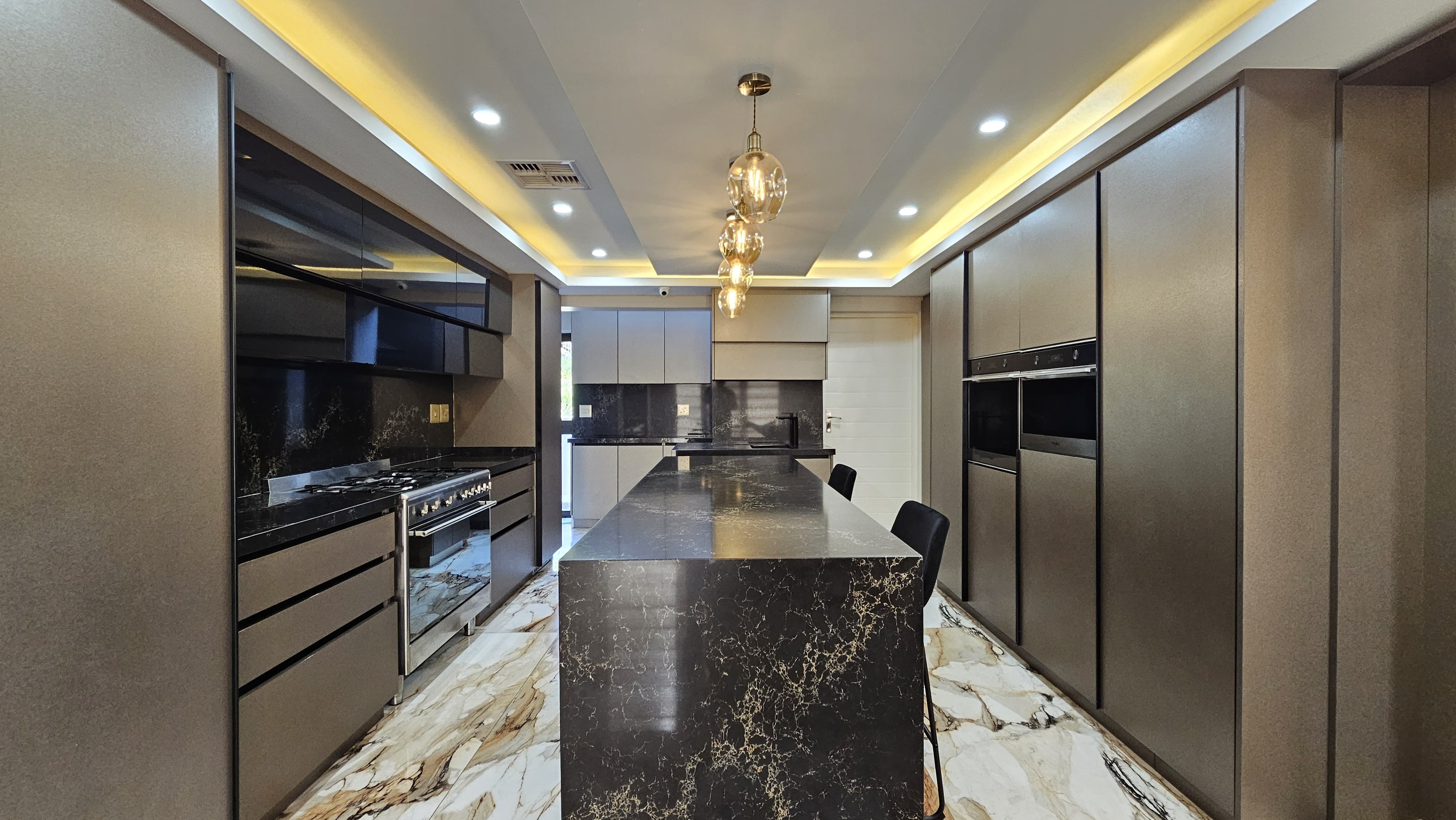The kitchen features high-quality finishes, a stylish centre island, and a stunning skylight that floods the space with natural light.