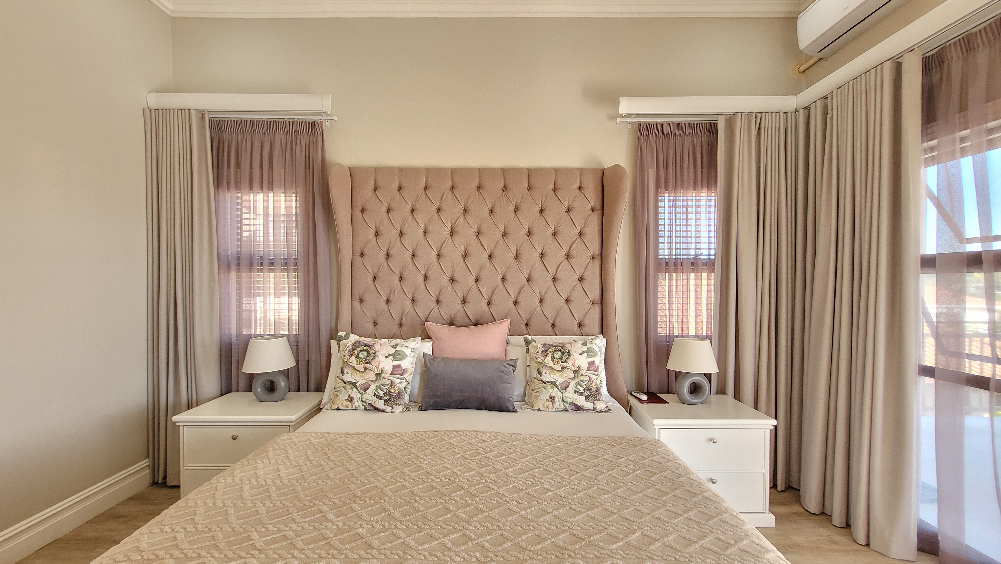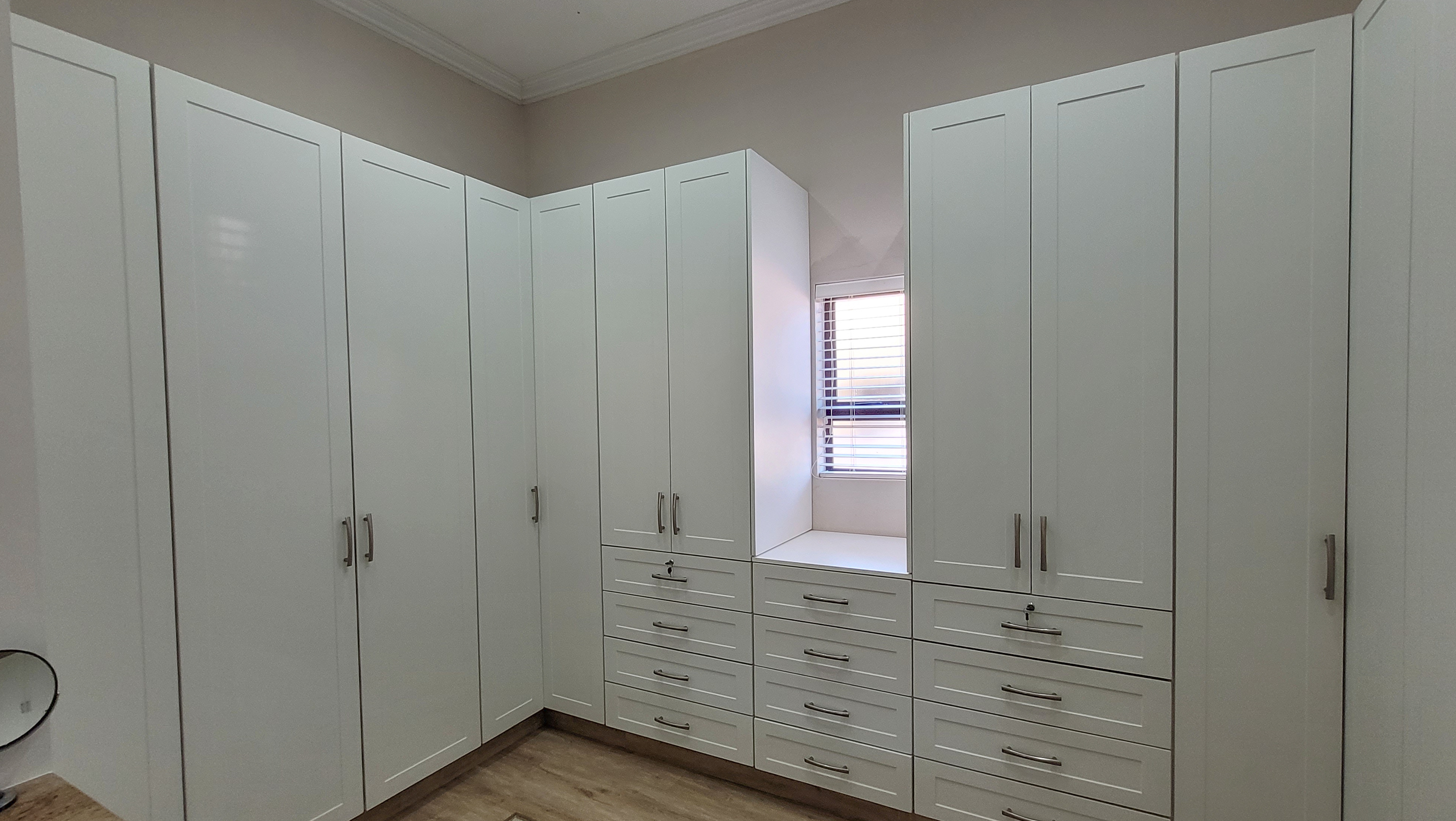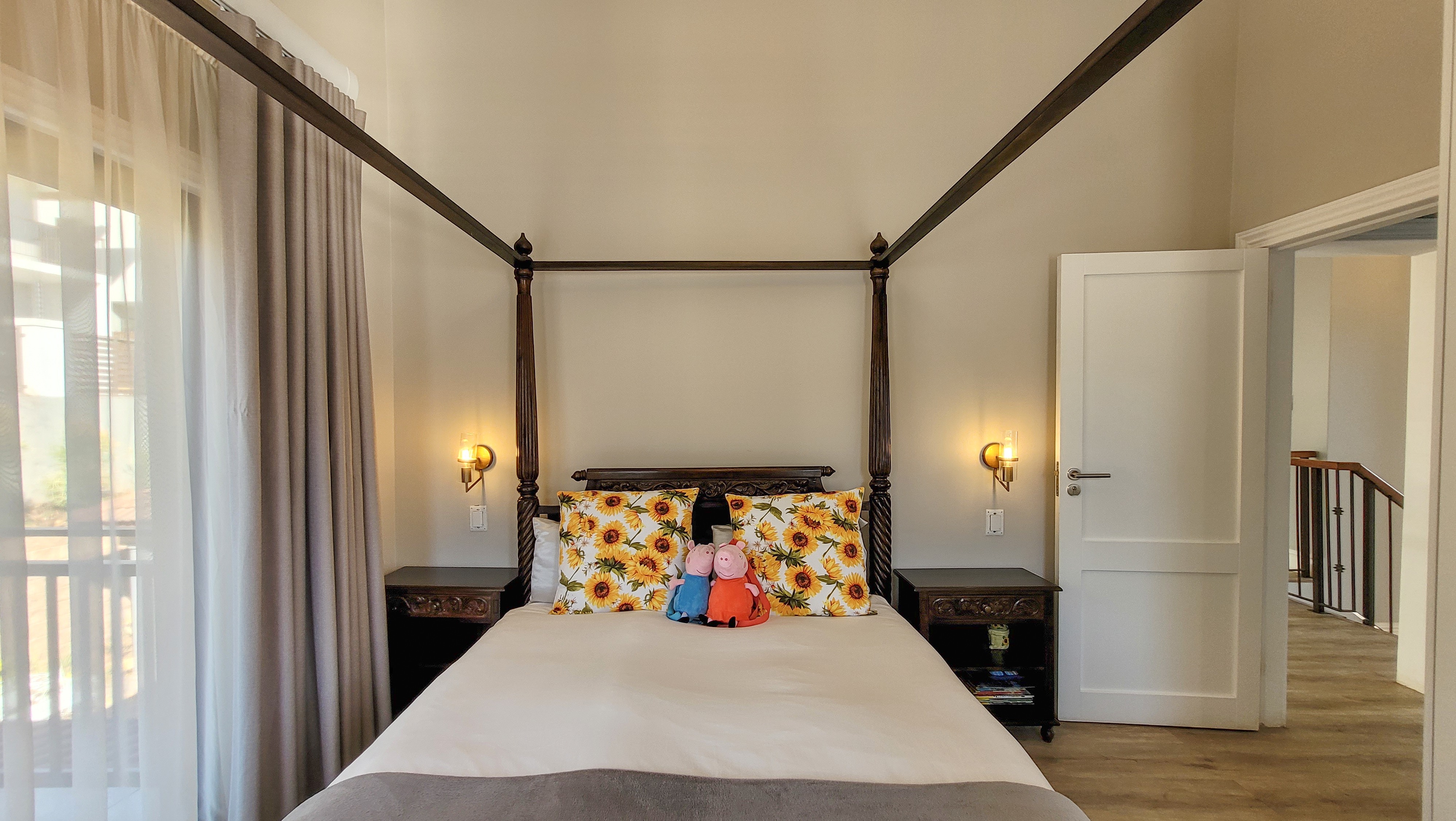 On the left wing, the main bedroom suite offers a private retreat featuring a walk-in closet, spa-inspired en-suite bathroom, and serene ambiance. A fully fitted home office opens onto a veranda, perfectly balancing work and relaxation. The three additional bedrooms are generously sized, each finished with built-in storage, natural light, and contemporary touches. With three full bathrooms plus a guest cloakroom, the home blends comfort with practicality.