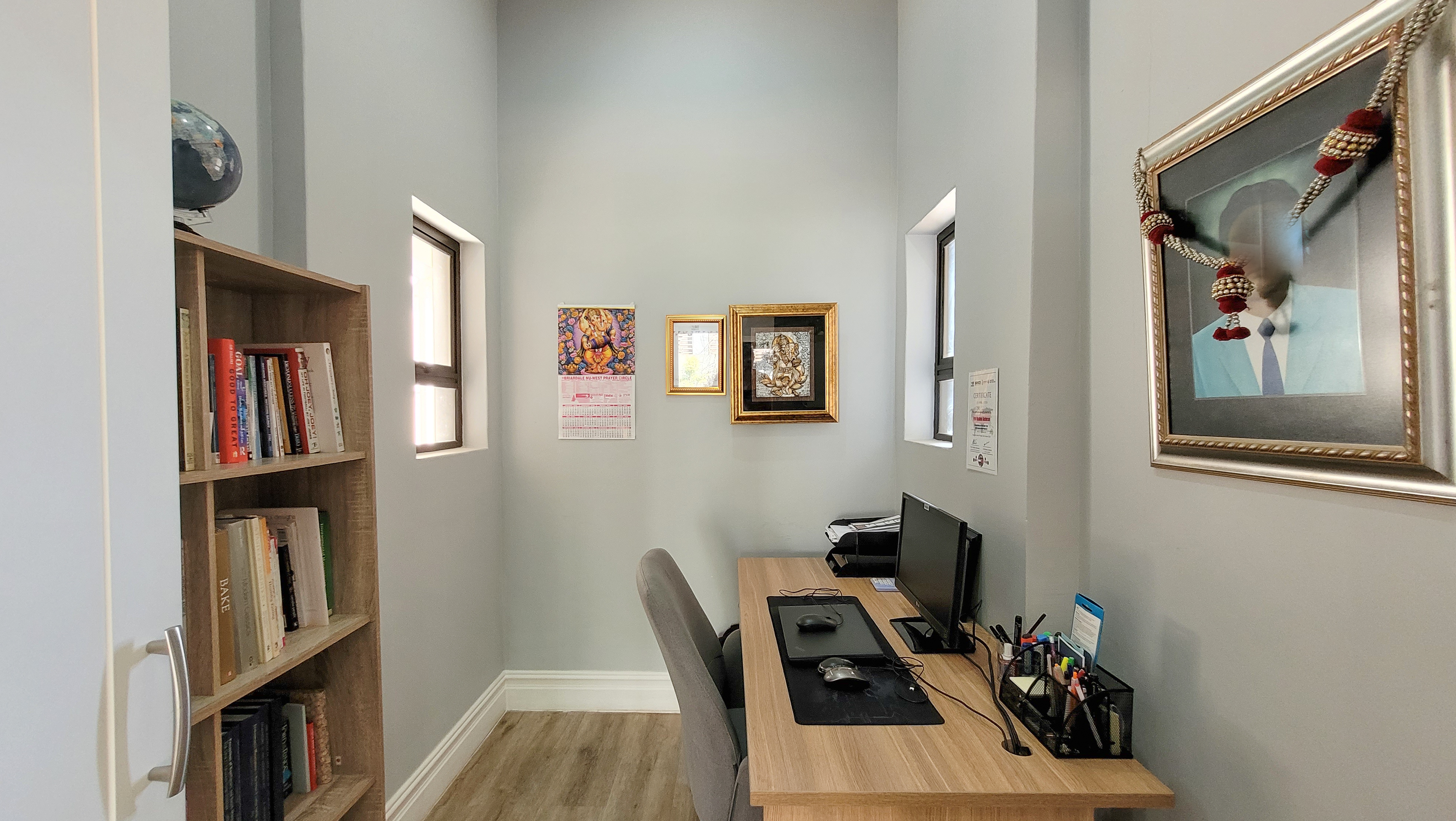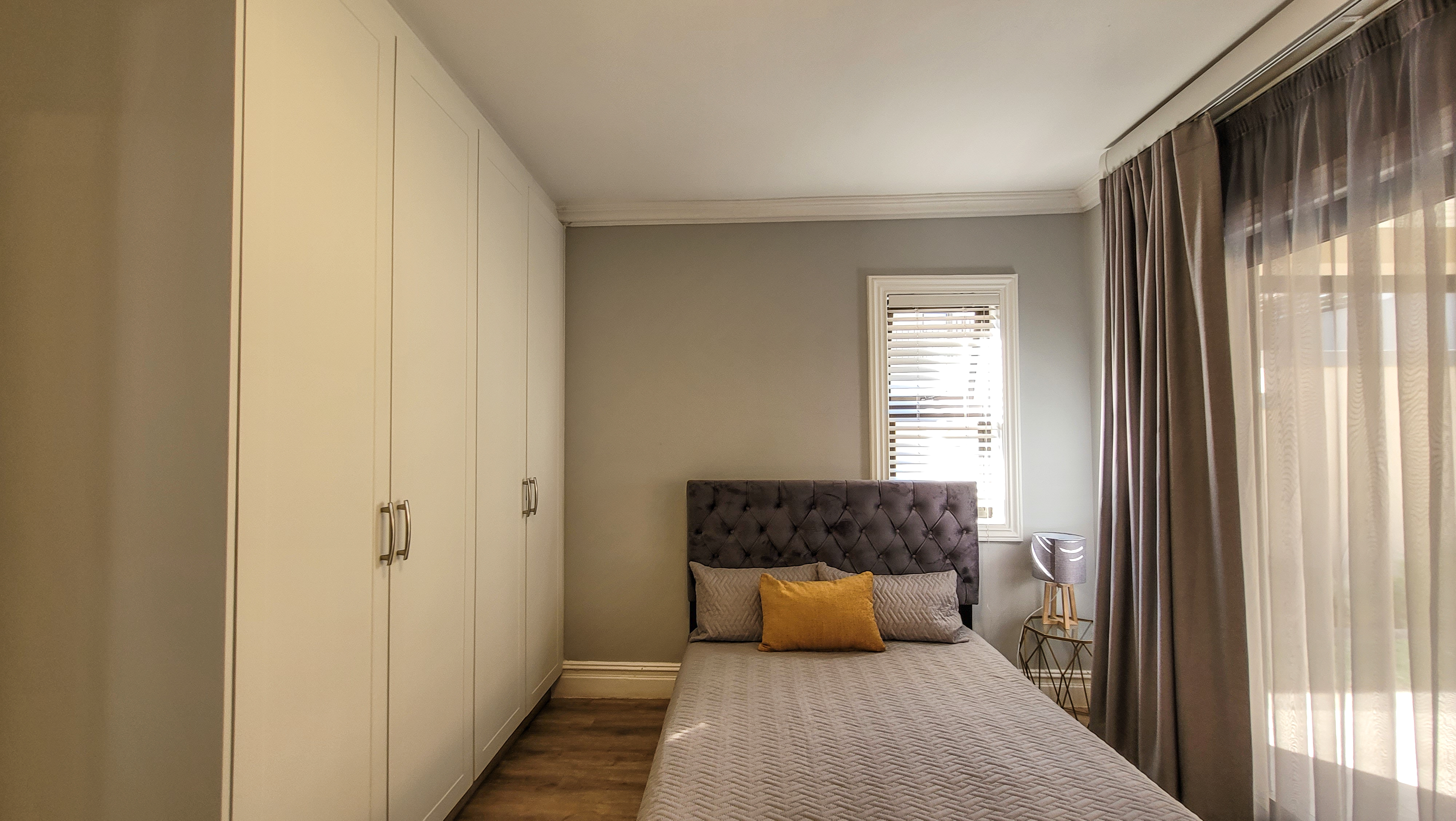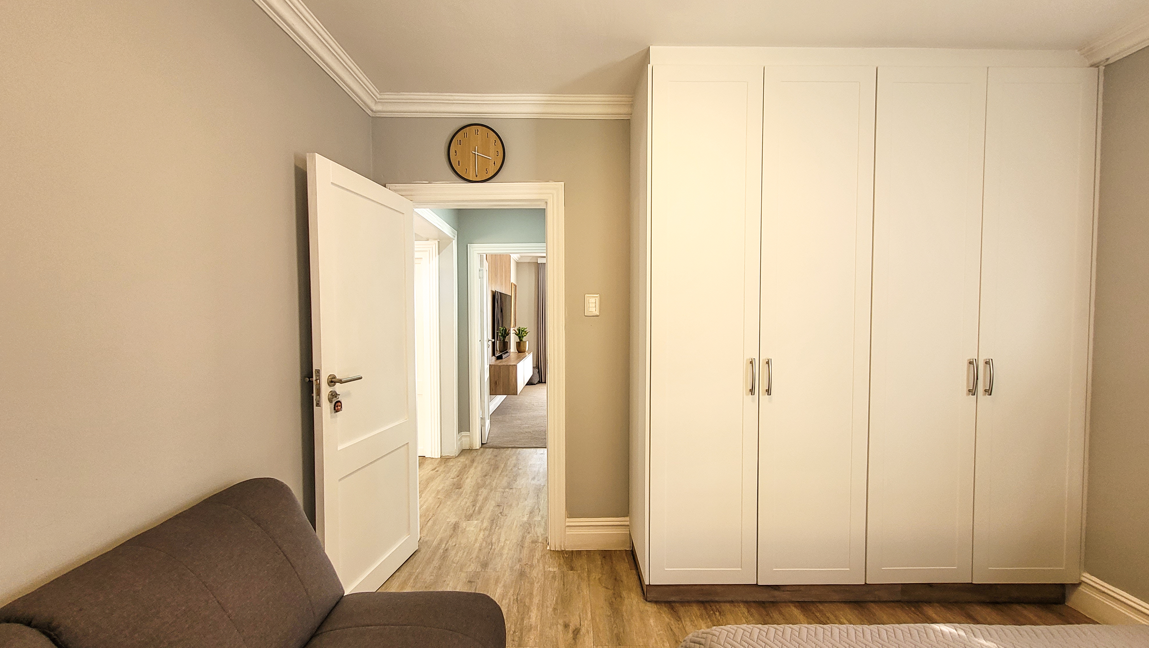 On the left wing, the main bedroom suite offers a private retreat featuring a walk-in closet, spa-inspired en-suite bathroom, and serene ambiance. A fully fitted home office opens onto a veranda, perfectly balancing work and relaxation. The three additional bedrooms are generously sized, each finished with built-in storage, natural light, and contemporary touches. With three full bathrooms plus a guest cloakroom, the home blends comfort with practicality.