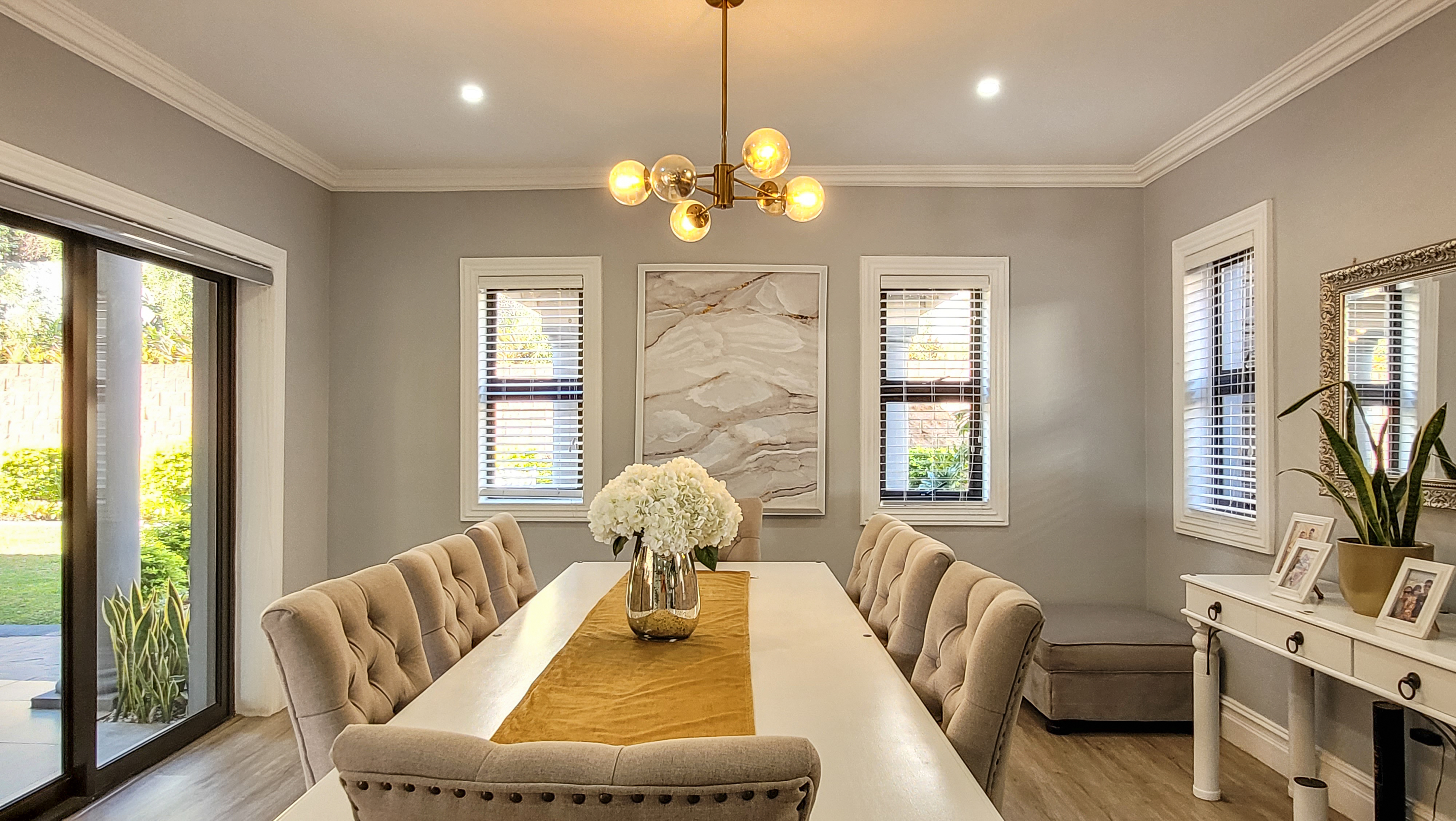 At its heart lies a chef’s kitchen, complete with a scullery, breakfast nook, and premium appliances. This culinary hub flows seamlessly into the dining area and out to a covered patio. Here, you’ll find a manicured garden and jacuzzi – ideal for entertaining or unwinding in tranquility.