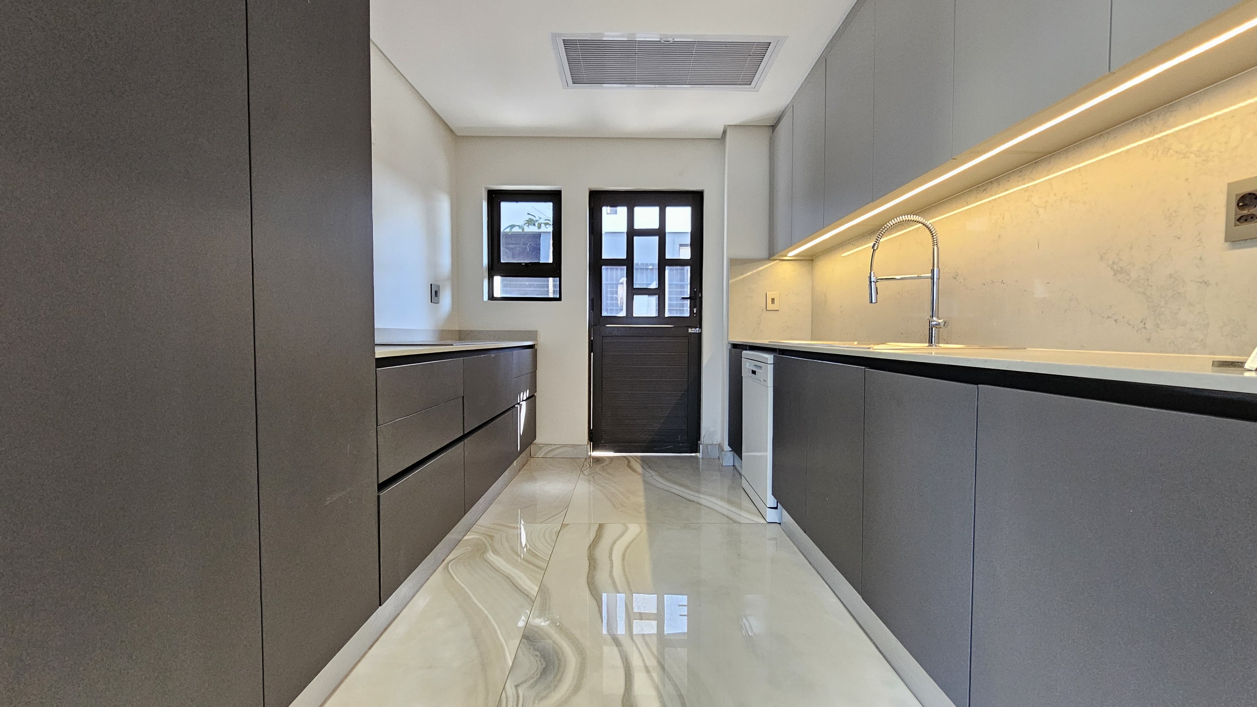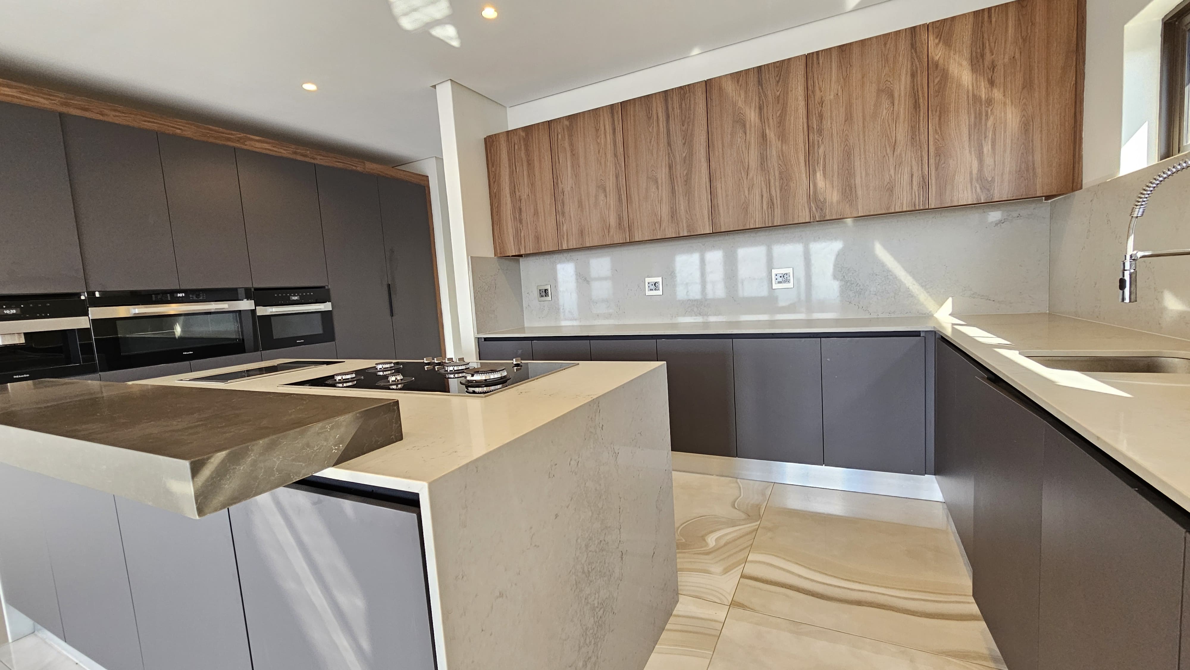 Open-Plan Luxury: A modern layout with top-drawer appliances, sleek finishes, and a seamless connection to the adjacent dining and scullery areas.