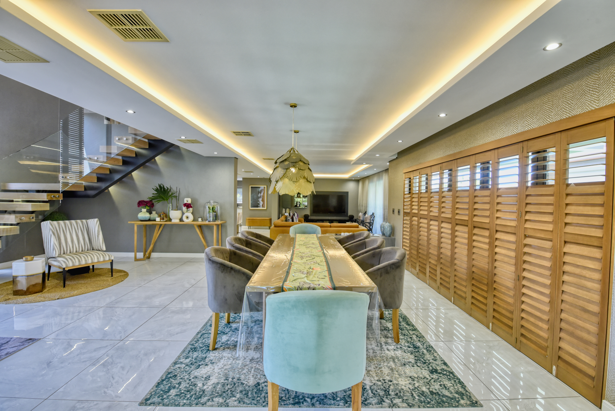 The home welcomes you with an elegant entrance hall featuring a striking staircase with feature lighting, setting the tone for the contemporary finishes found throughout the property.