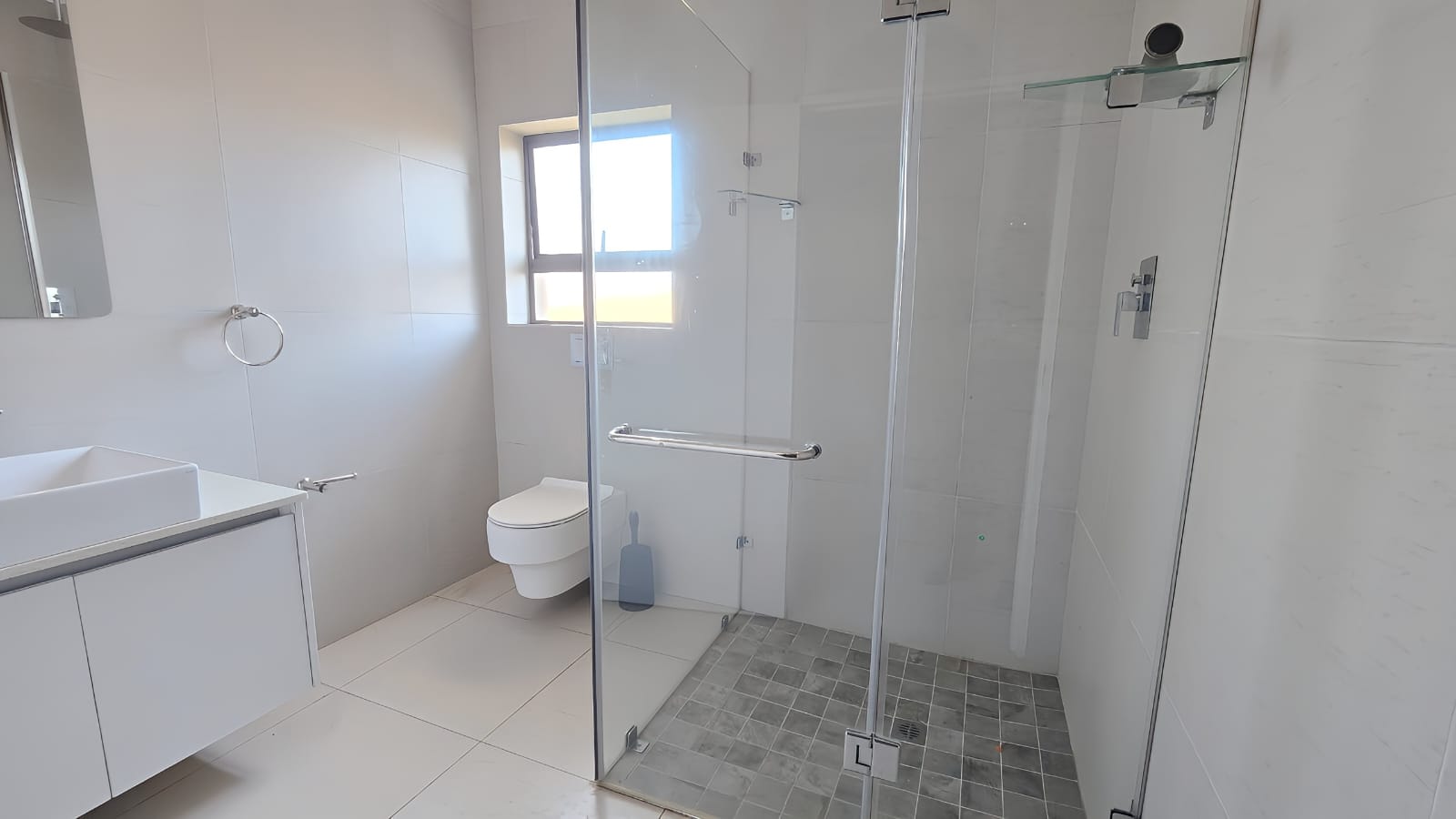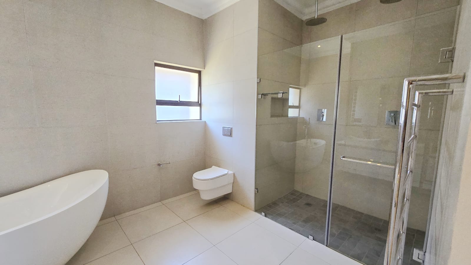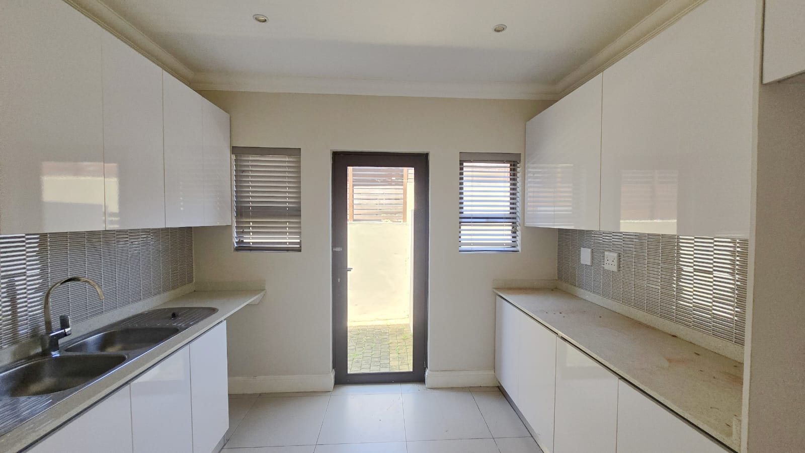 The ground floor welcomes you with an open-plan lounge, dining room, and kitchen that exude contemporary charm. The lounge effortlessly flows onto a covered patio, creating an ideal space for entertaining. Complete with a built-in braai and overlooking a sparkling swimming pool, the outdoor area is designed to impress. The sleek kitchen is complemented by a separate scullery, ensuring practicality meets aesthetics. This level also includes a guest bedroom with built-in cupboards and a guest bathroom, along with a private courtyard and convenient storage under the staircase.