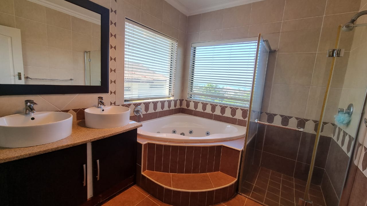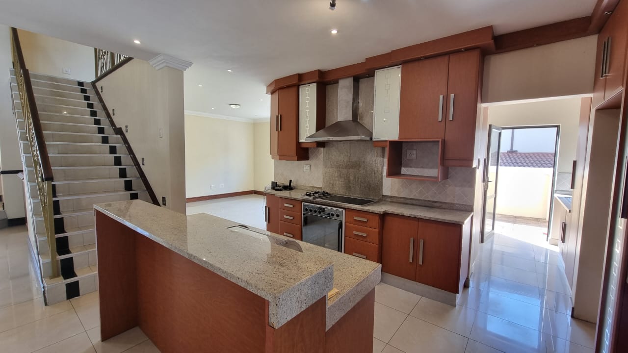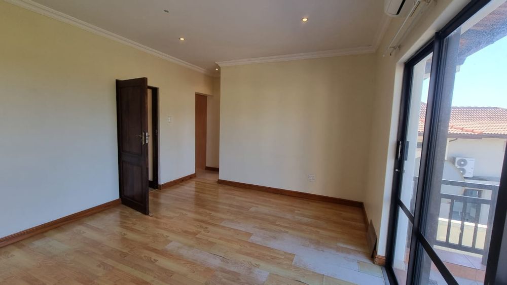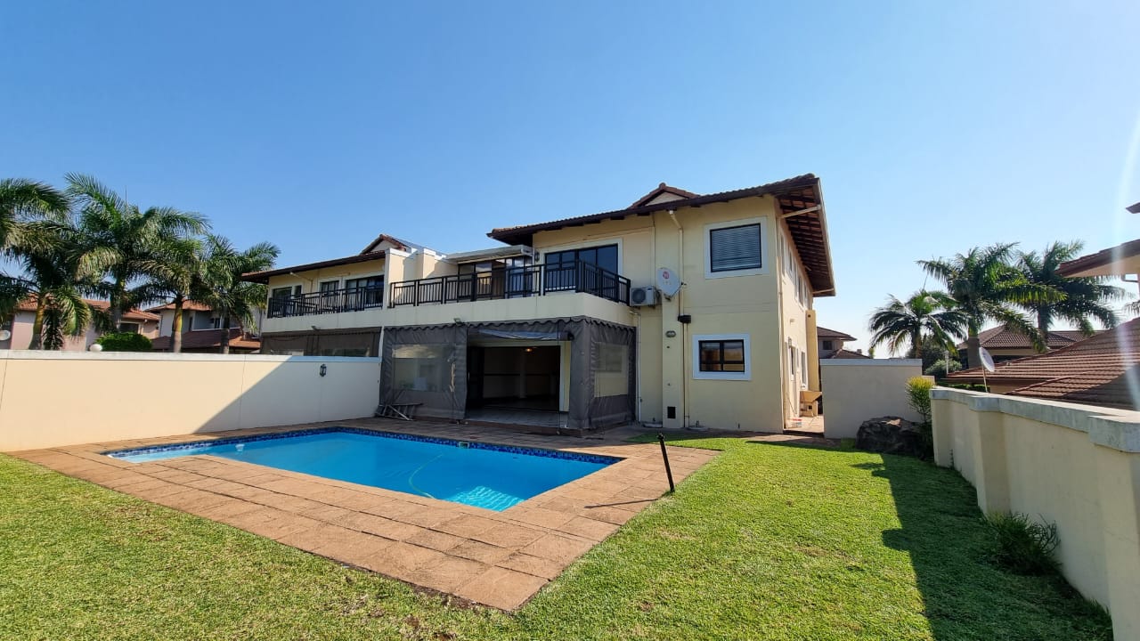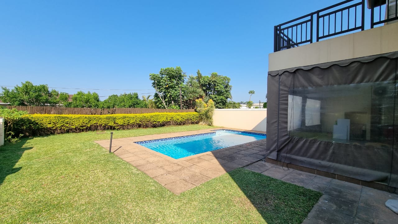 A beautiful double storey duet located in Izinga Ridge offers you luxury and security. 4 spacious en suite bedrooms with balconies and a large open plan living area with built in bar allows one space to enjoy life. A sunroom/office is also located on the first floor. The kitchen is fitted with a gas hob, is plumbed for a double door fridge and has a separate scullery/laundry. A patio which can be enclosed looks out over the private pool and garden area.