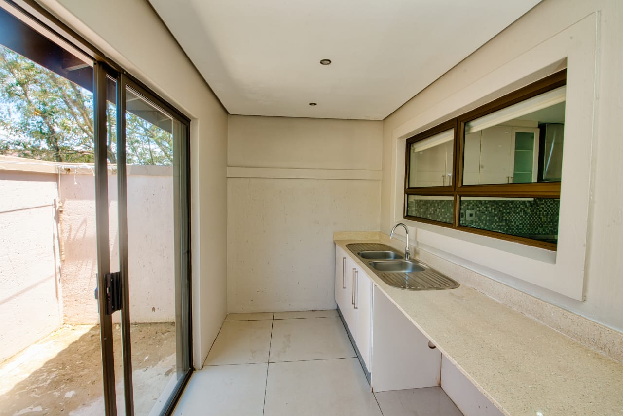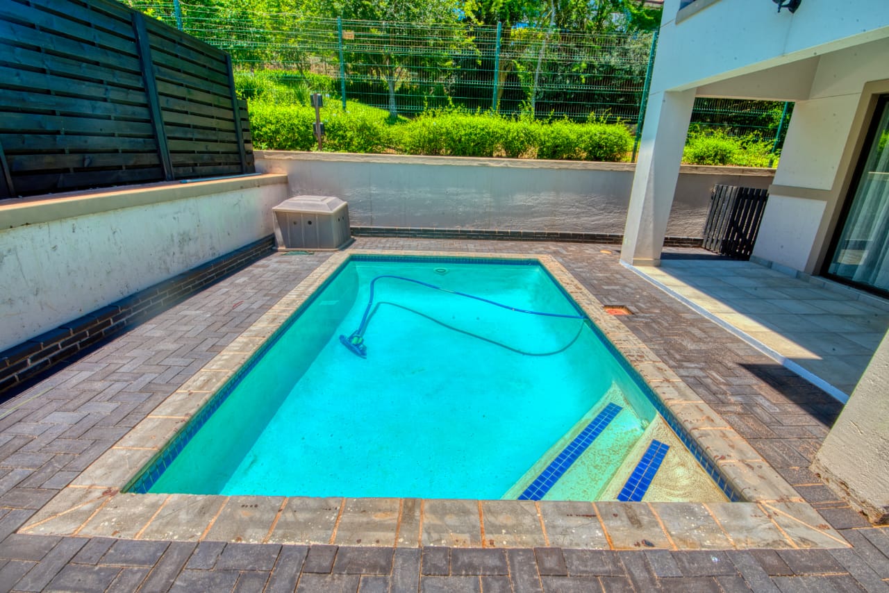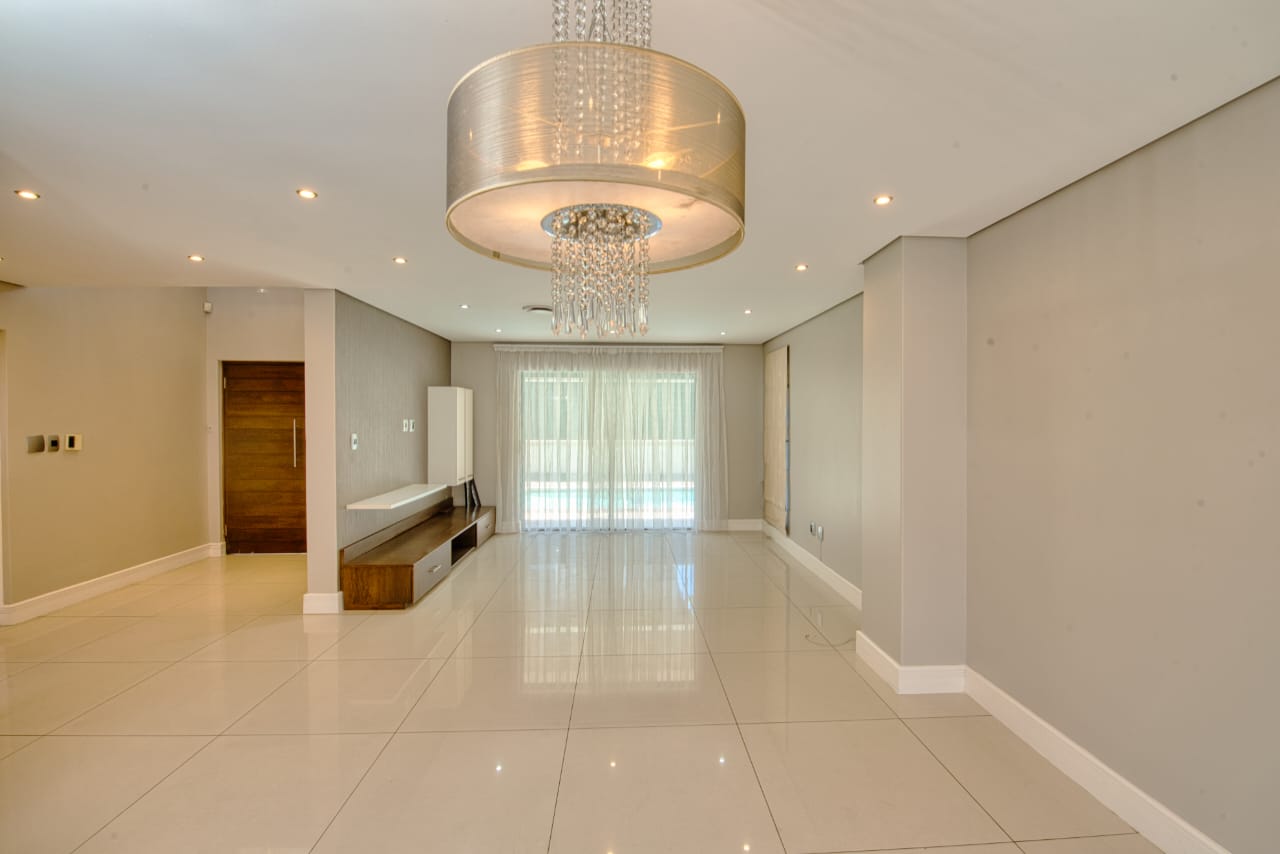 The open-plan layout creates a bright and spacious living and dining area that flows seamlessly into a contemporary kitchen, complete with high-end finishes, ample cabinetry, and a separate scullery for added practicality. Large glass doors open onto a private patio overlooking a sparkling swimming pool—perfect for entertaining or relaxing in a tranquil outdoor setting.
