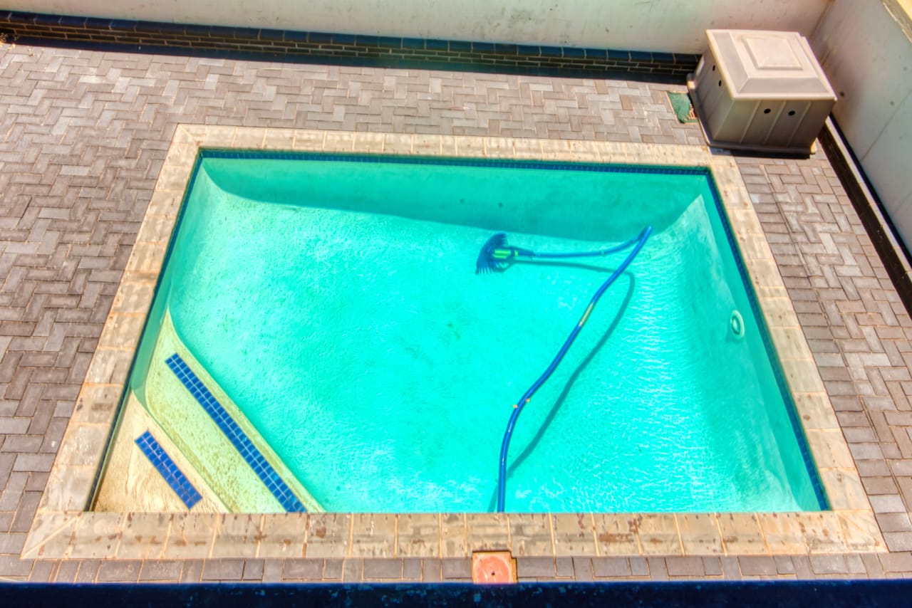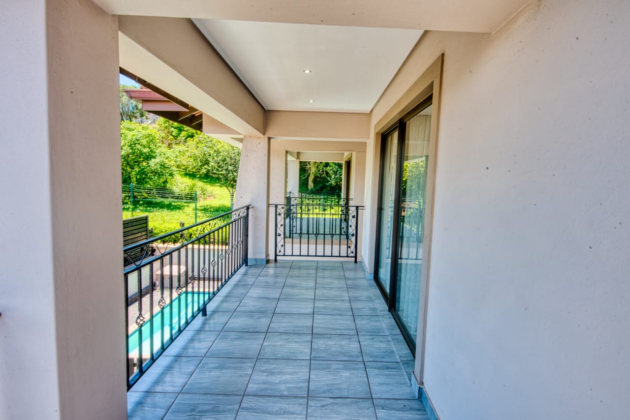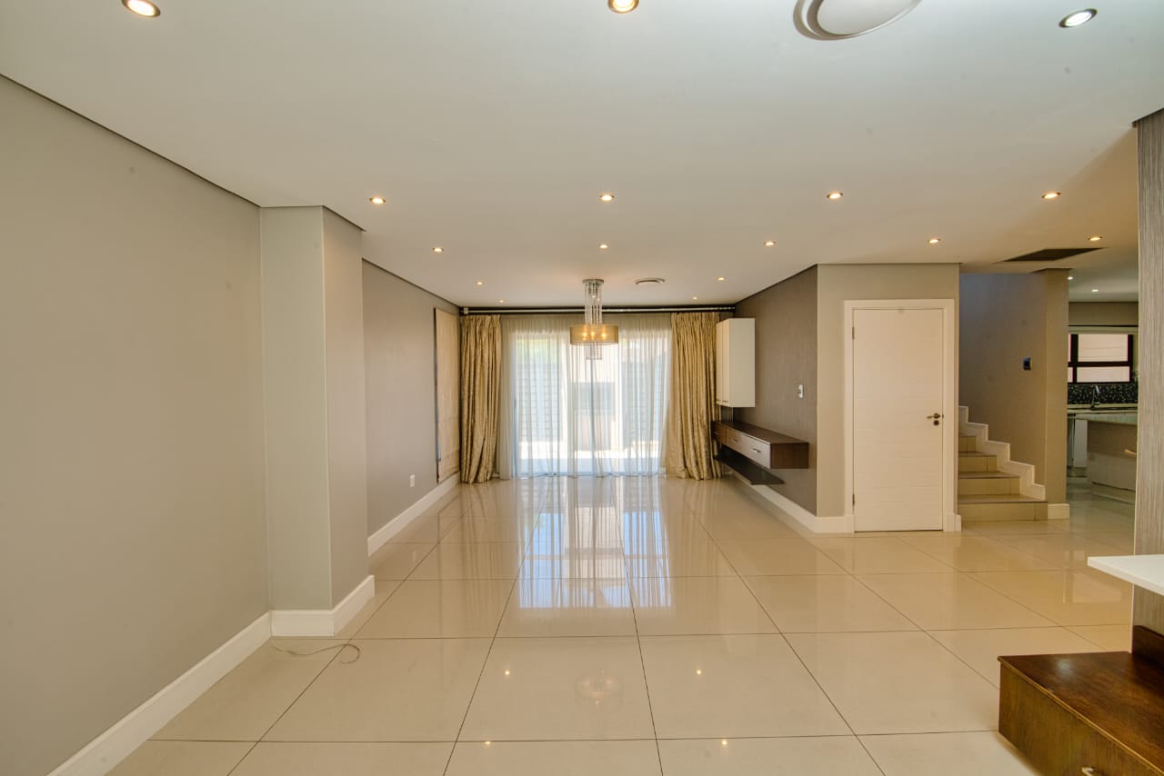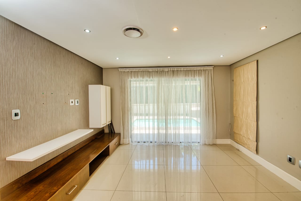 The open-plan layout creates a bright and spacious living and dining area that flows seamlessly into a contemporary kitchen, complete with high-end finishes, ample cabinetry, and a separate scullery for added practicality. Large glass doors open onto a private patio overlooking a sparkling swimming pool—perfect for entertaining or relaxing in a tranquil outdoor setting.