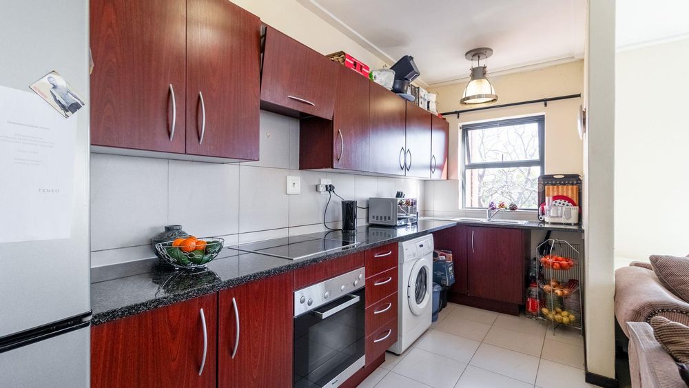 The Reception room is light and bright and has space for a 6 seater dining room table as well as a spacious lounge area. Tiled floors add distinction and style to this area which is open plan to the kitchen with space for 2 wet appliances and fridge. Lovely Mahogany finish veneer cabinets with granite tops to match and an under counter oven & hob finish the kitchen nicely.