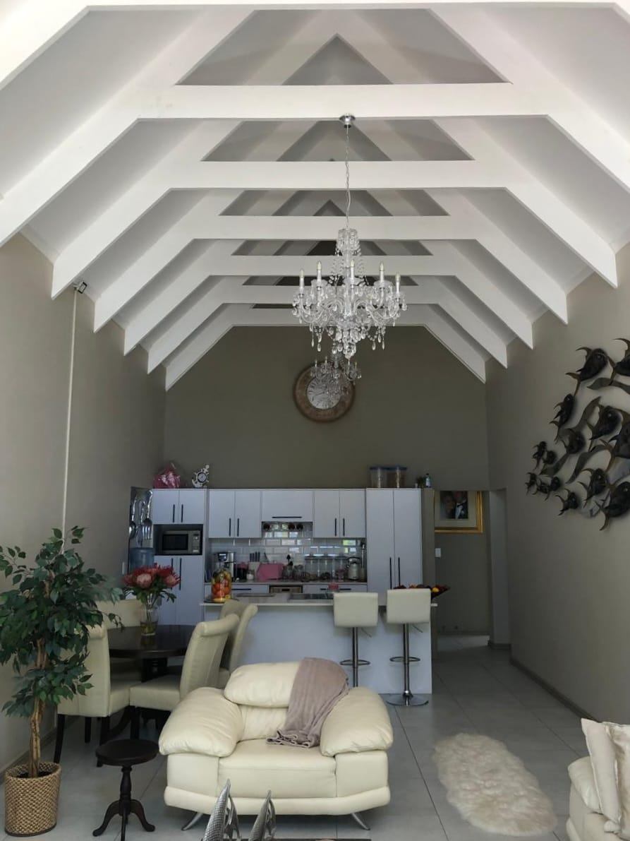 Enjoy bright open-plan living with high exposed trusses, quality finishes throughout, and a spacious enclosed braai room ideal for year-round entertaining. The kitchen features ample cupboards, an electric hob and oven, plus a separate scullery. The main bedroom includes an en-suite, while two additional bedrooms share a full second bathroom.