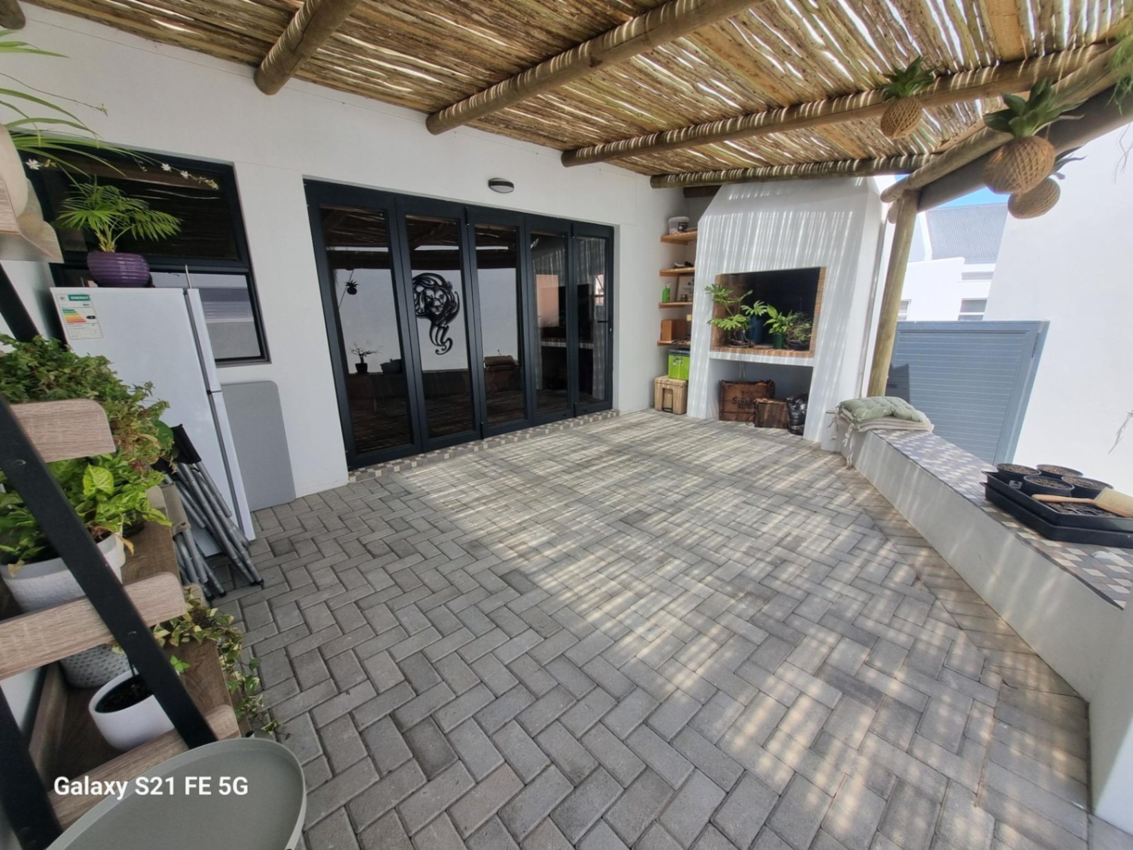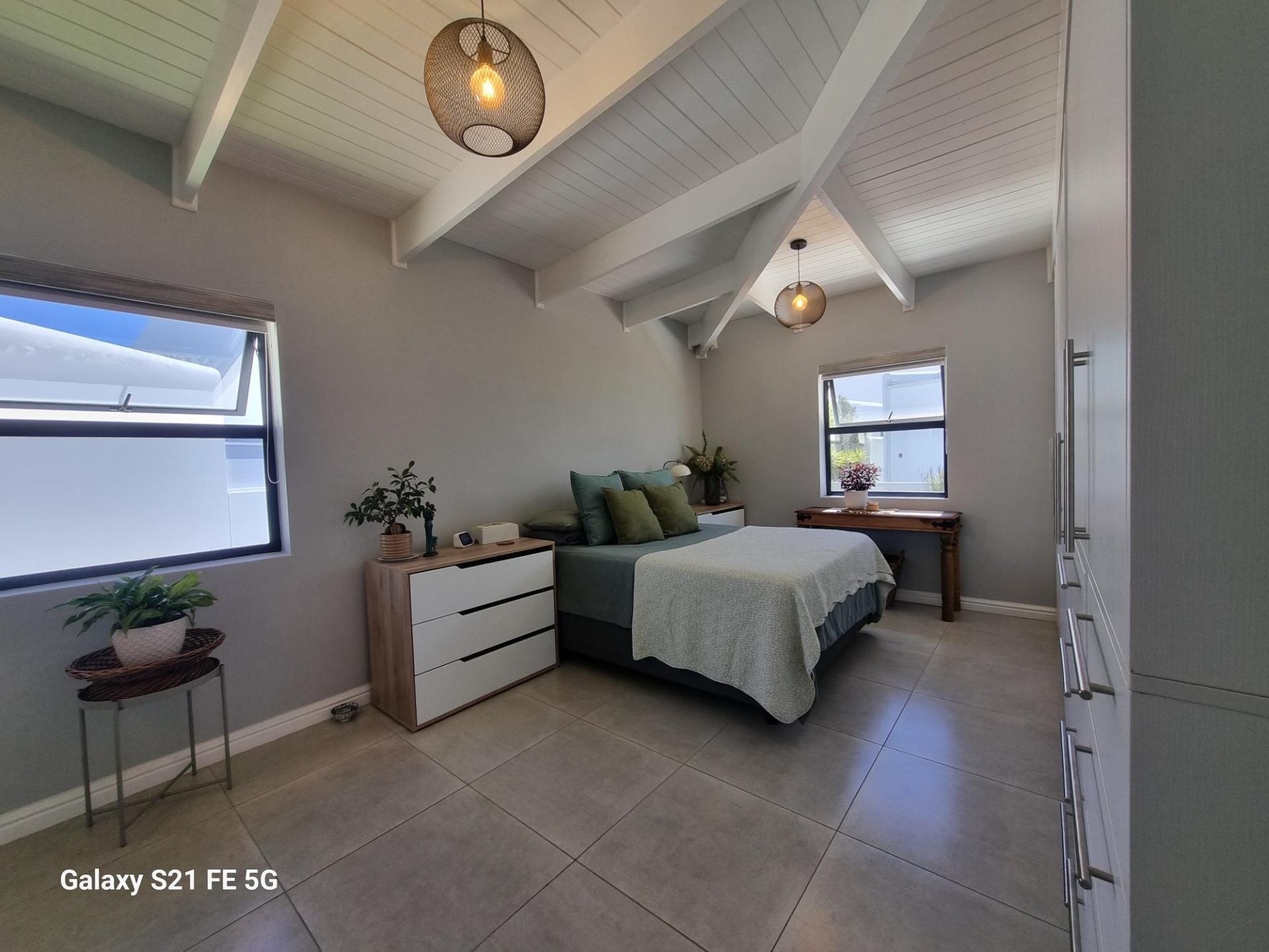 Bordering a tranquil green belt, the residence enjoys exceptional privacy and a seamless indoor-outdoor flow. Double-volume ceilings with exposed trusses enhance the sense of space, while the open-plan living area extends to a covered patio with braai and canvas shutters — ideal for relaxed entertaining.