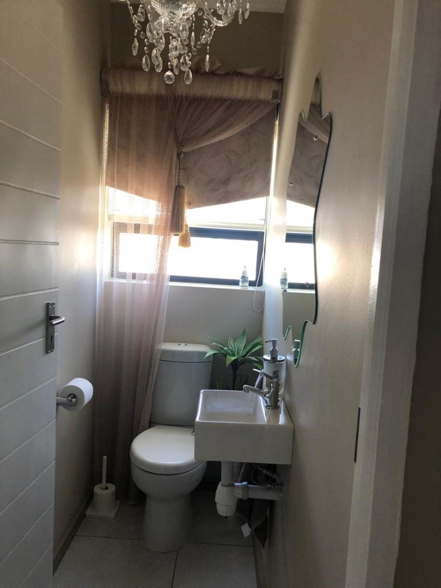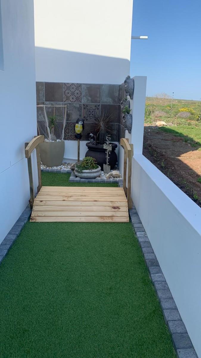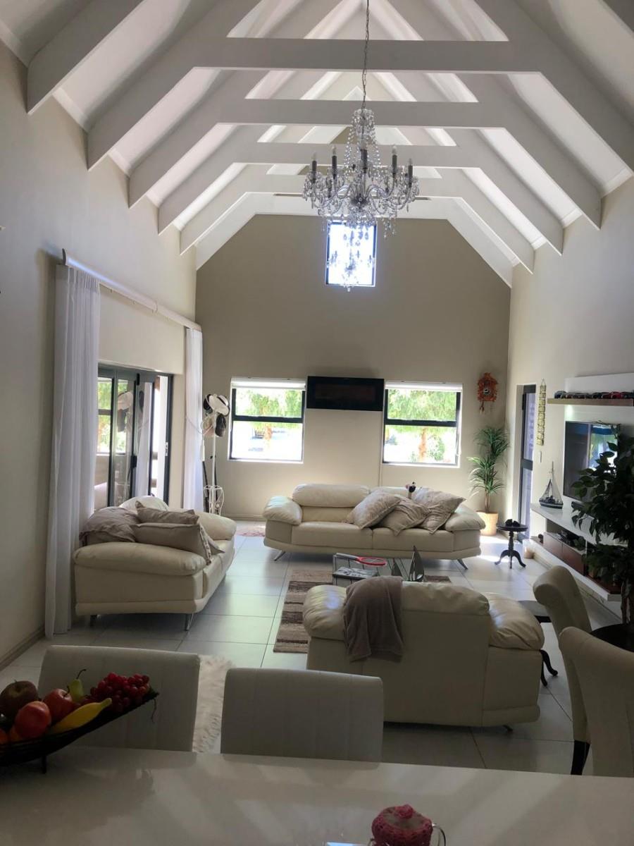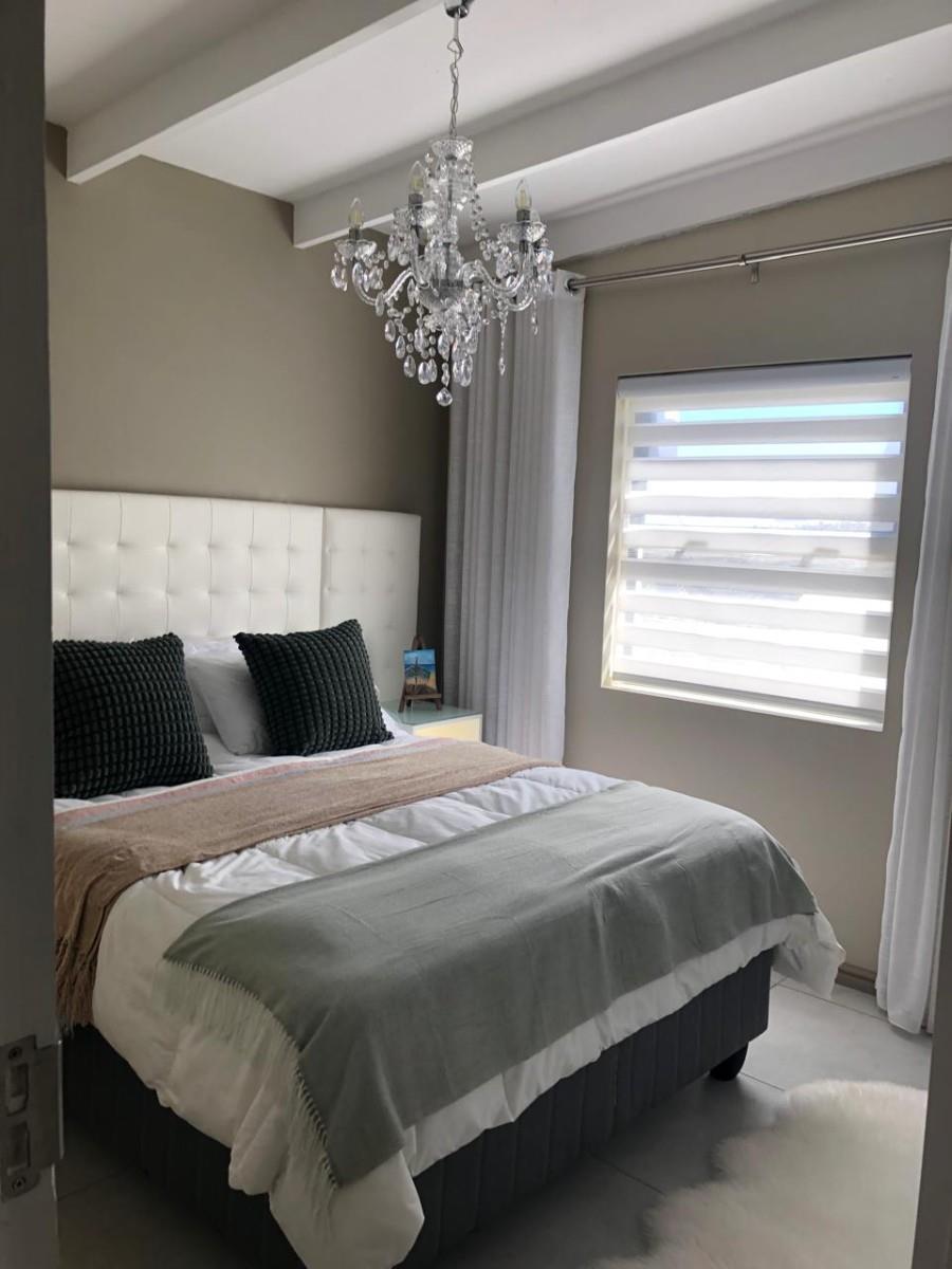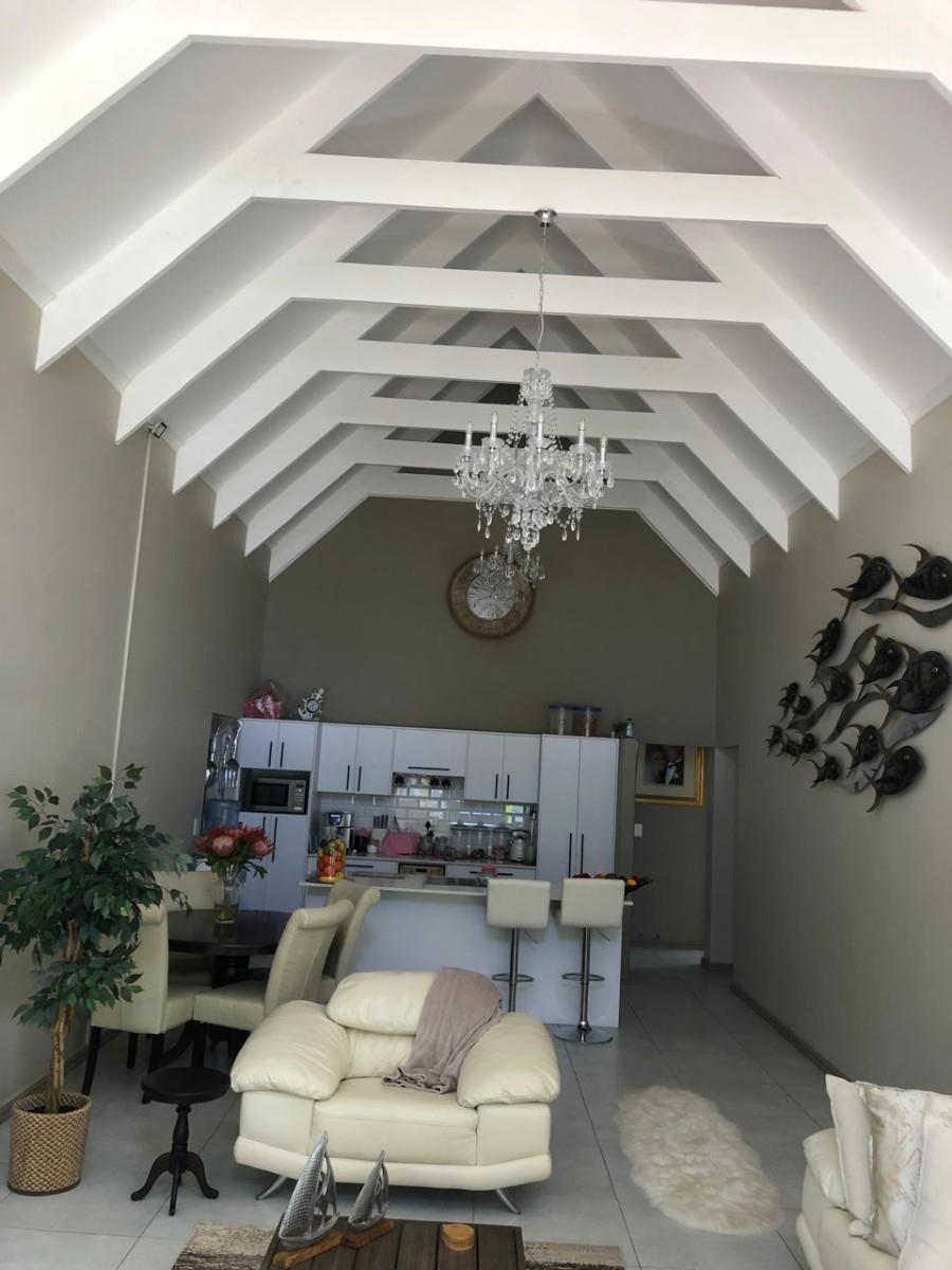 Step inside and you’ll find a bright open-plan living area with high exposed trusses, giving it a spacious and airy feel. The finishes are top-quality, from the tiled floors, light fittings to the built-in cupboards throughout. There’s also a spacious enclosed braai area – ideal for those cooler West Coast evenings.
