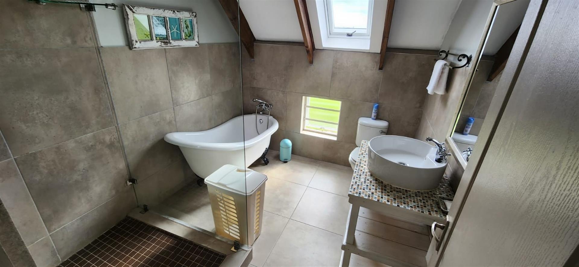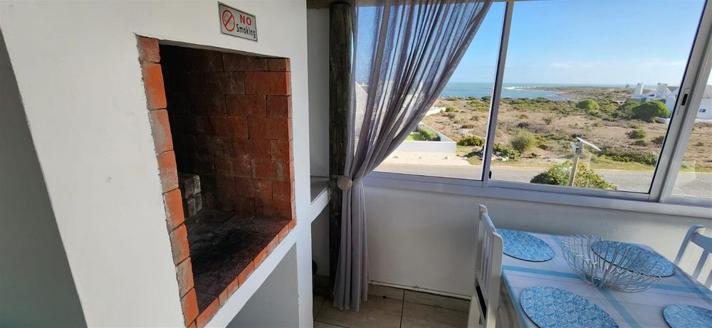 This upstairs unit includes 1 bedroom, a full bathroom, a kitchen with a dishwasher, and an indoor braai with sea views.
