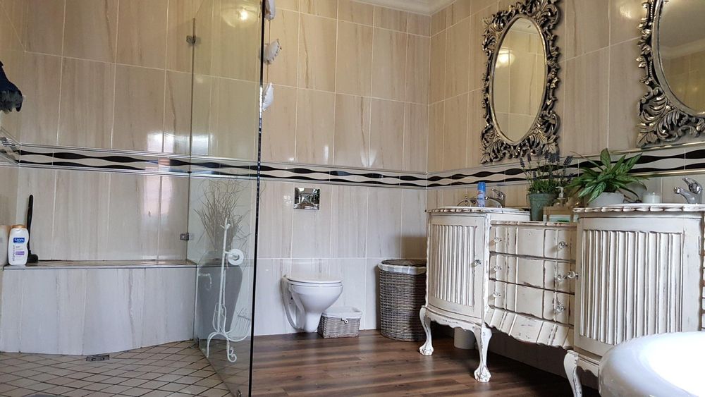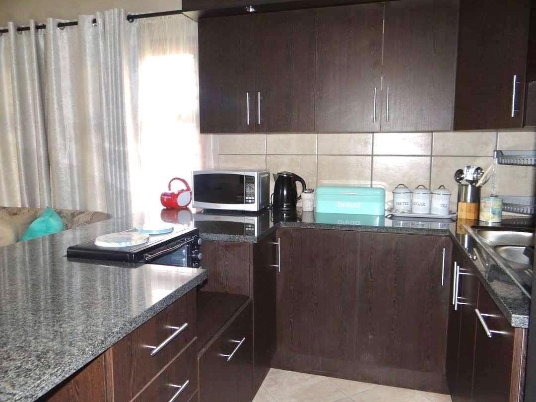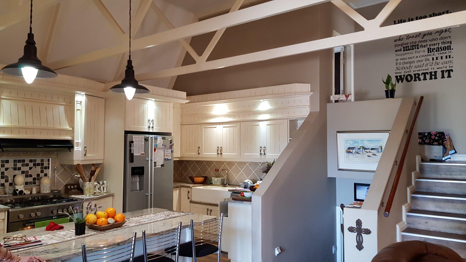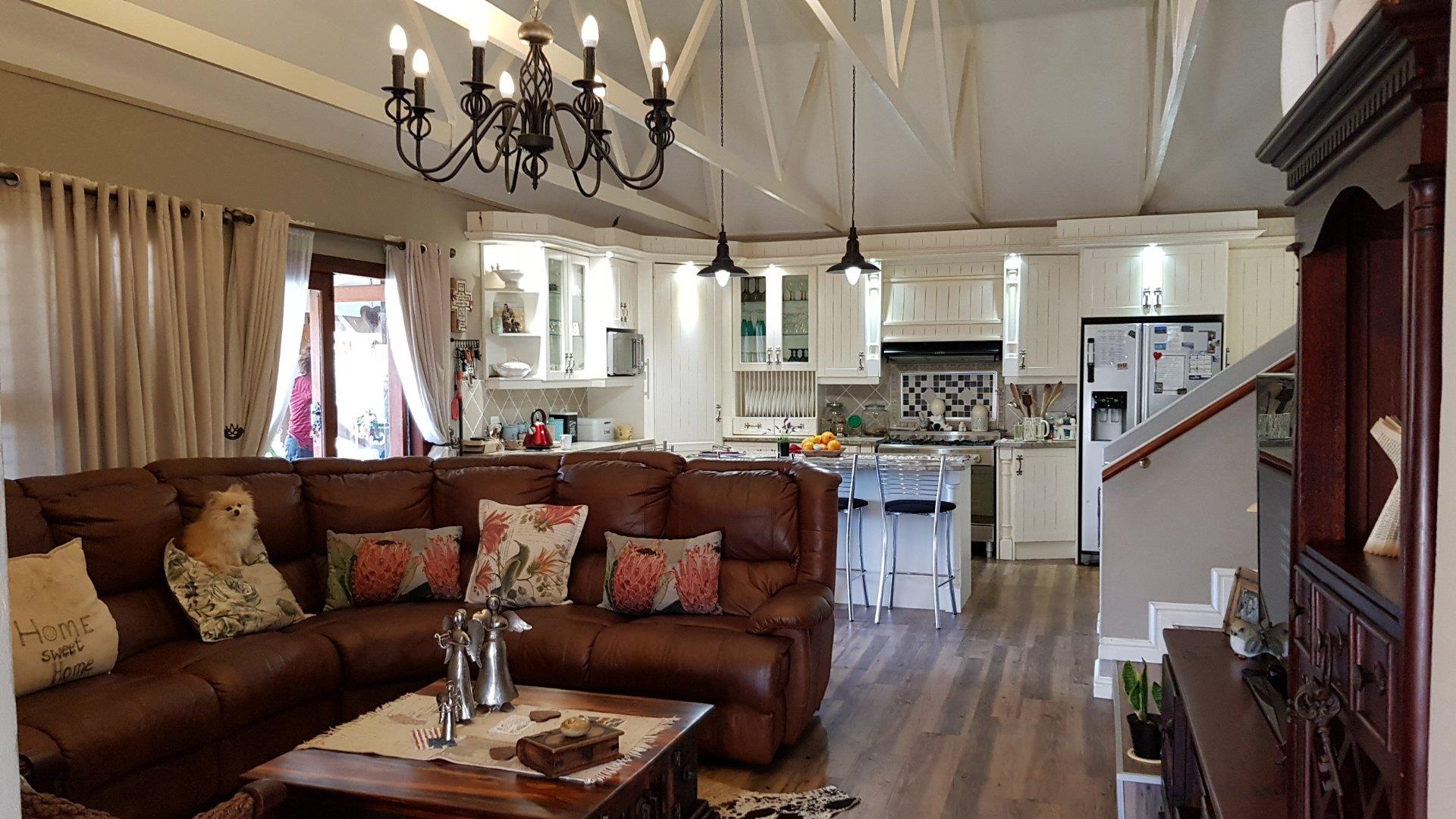 The house has an entrance hall flowing onto the open plan lounge and kitchen area with center island. The three bedrooms are divided on a split level with the two guest rooms and separate full bathroom on the top level. The master bedroom is on the lower level and has a spacious full en-suite bathroom, small lounge area and good size bedroom area.