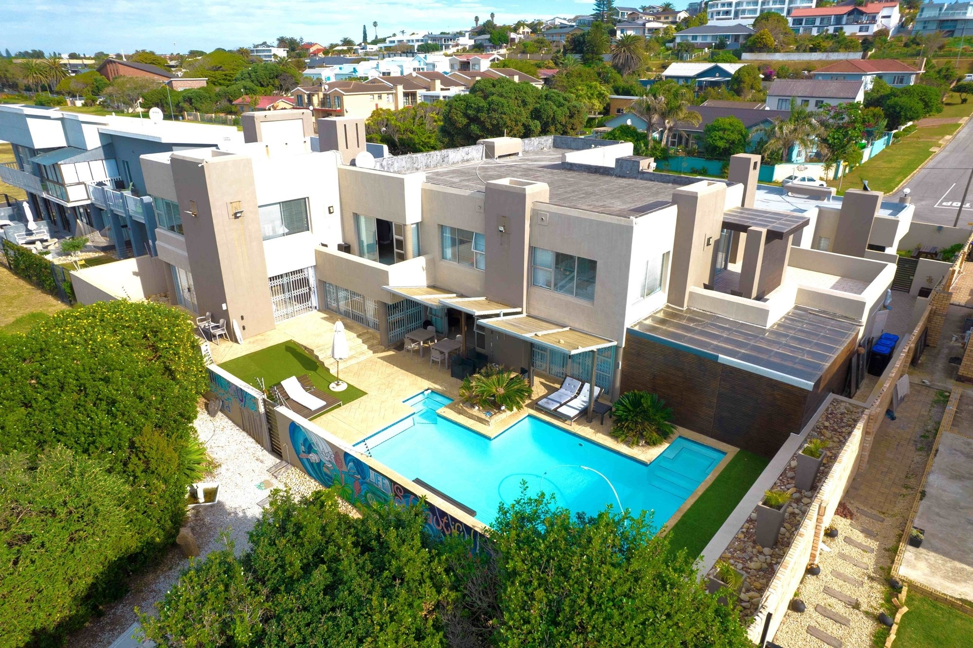 Experience the pinnacle of refined coastal living in this distinguished 8-bedroom, 8-bathroom residence, perfectly positioned along the pristine shoreline of Jeffreys Bay Central with direct private access to the beach. Encompassing an impressive 880 square metres of contemporary architecture, this exceptional home epitomises modern elegance, combining sophistication, comfort, and the serenity of seaside living.