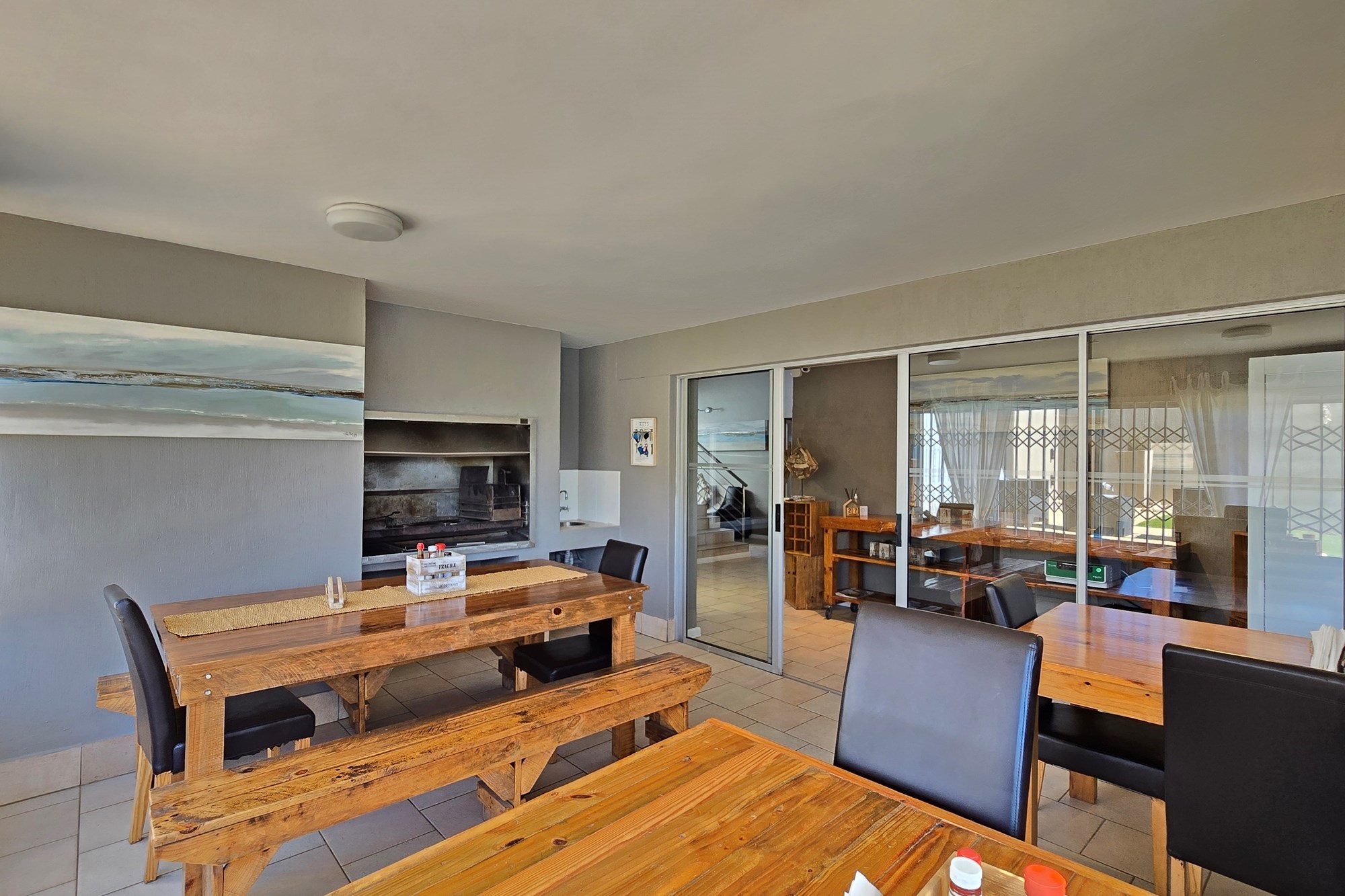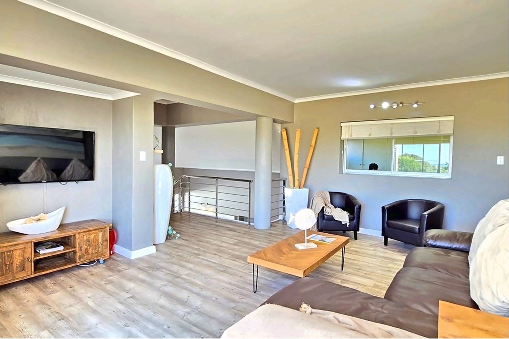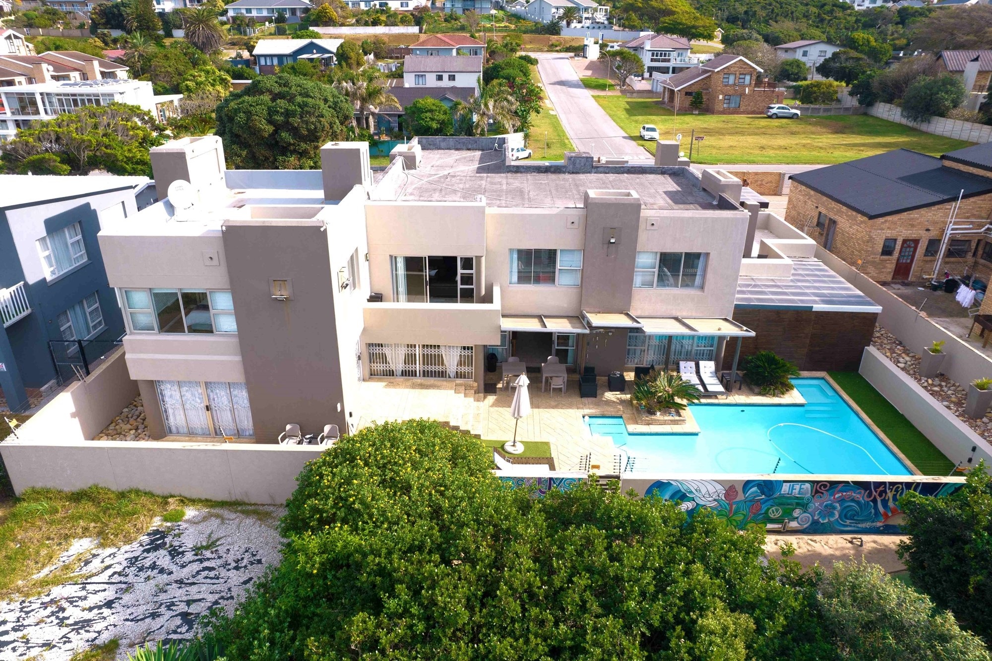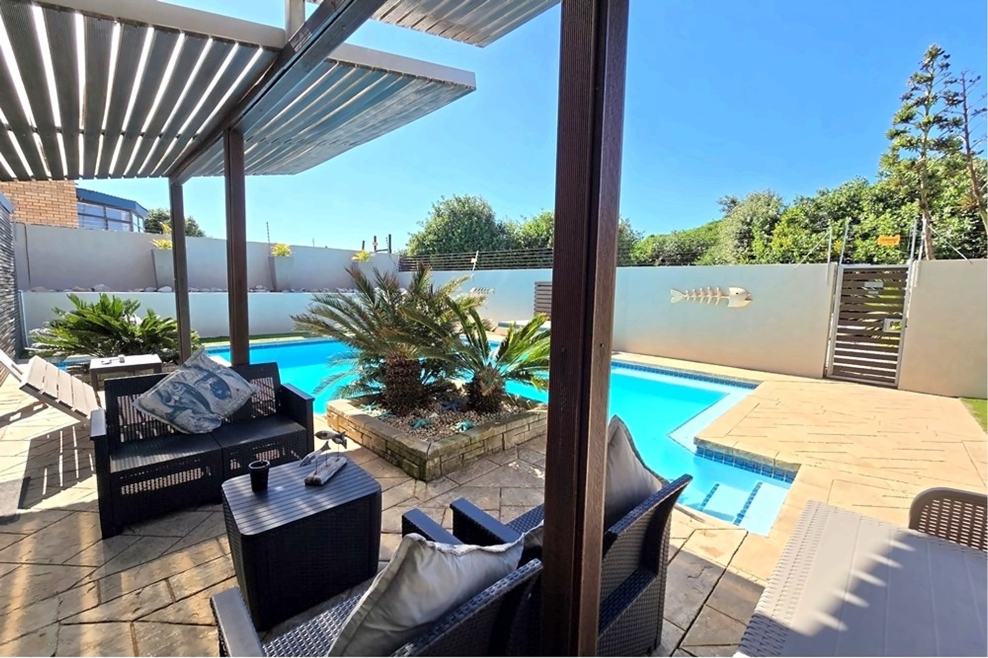 Designed with meticulous attention to detail, the residence is offered fully furnished, showcasing bespoke interiors, luxurious finishes, and designer décor throughout. Expansive open-plan living areas flow effortlessly to a generous entertainment terrace, featuring a private swimming pool, manicured gardens, and outdoor braai facilities — all harmoniously integrated with the surrounding coastal landscape.