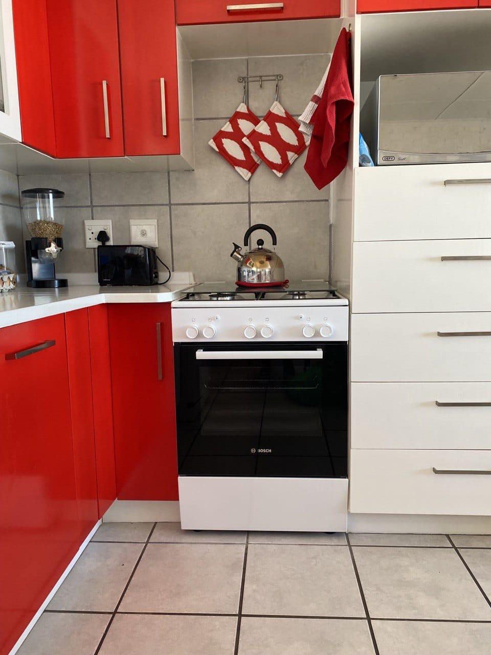 The home features a spacious open-plan lounge, dining room and kitchen, designed for easy living and effortless entertaining. The kitchen is fitted with a gas stove and oven, ideal for both everyday cooking and load-shedding convenience.