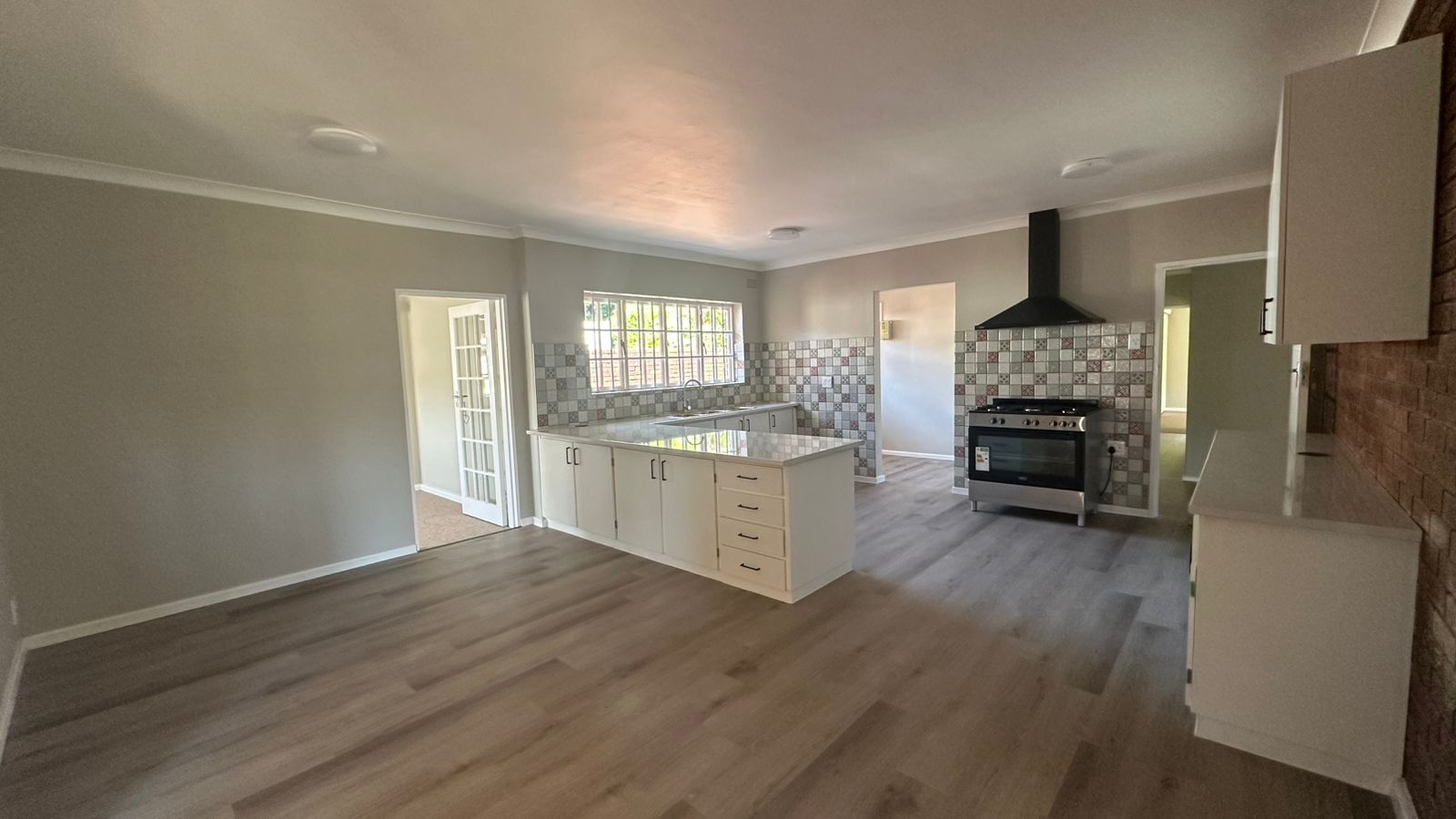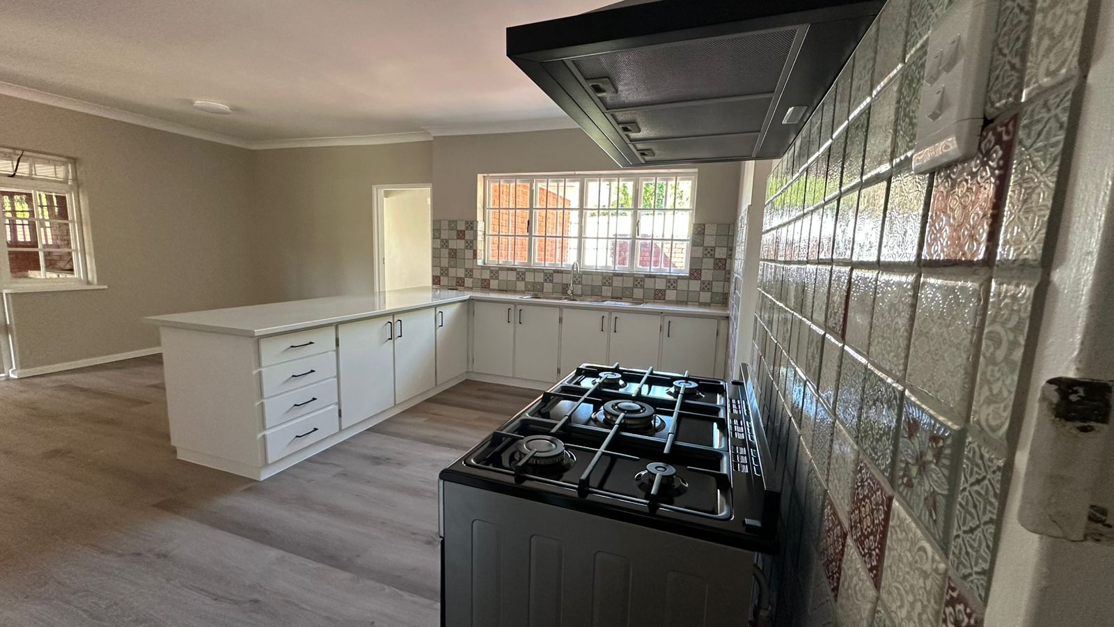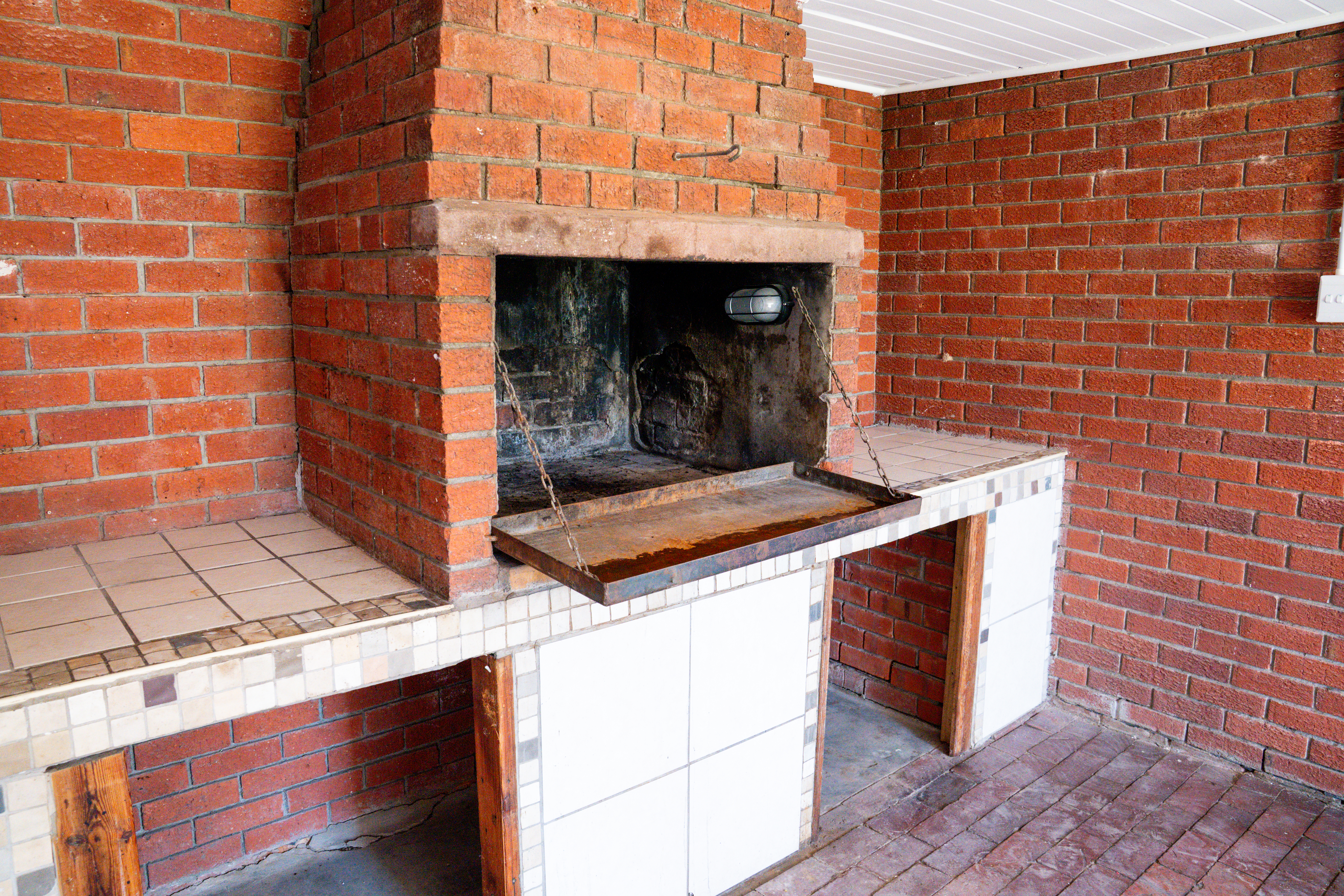The open-plan kitchen and dining area include ample cupboard space, a 5-plate gas hob with a modern extractor, and a separate scullery plumbed for a washing machine. A versatile braai room sits between the kitchen and the double garage, with double doors that create a seamless indoor–outdoor flow. The generous living area, fitted with a built-in fireplace, offers a warm and inviting atmosphere for family gatherings.