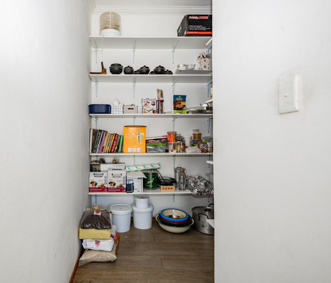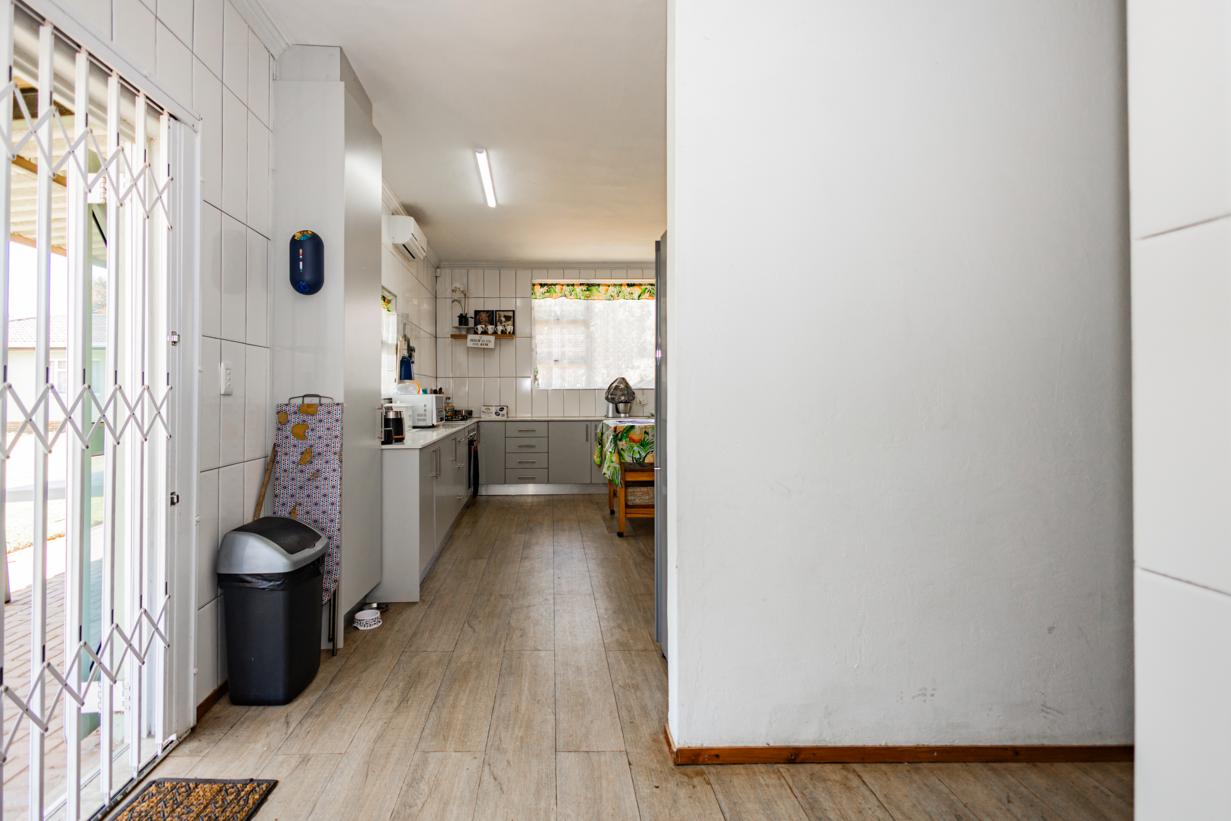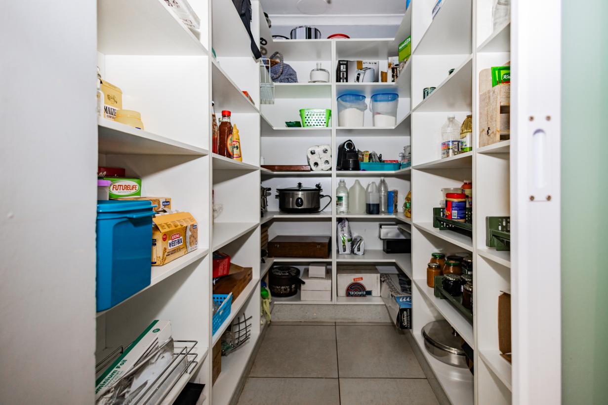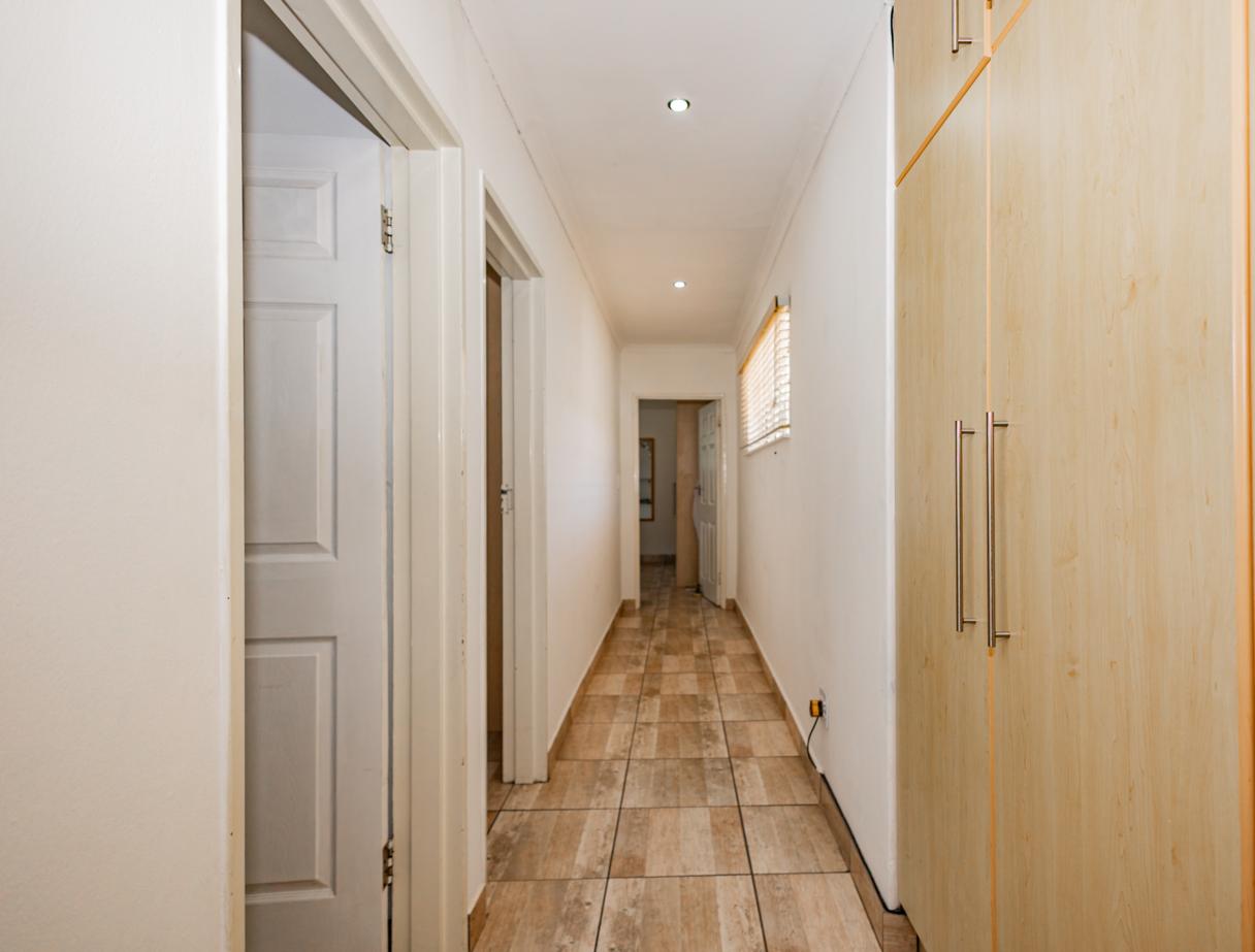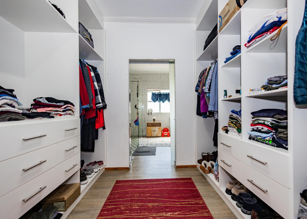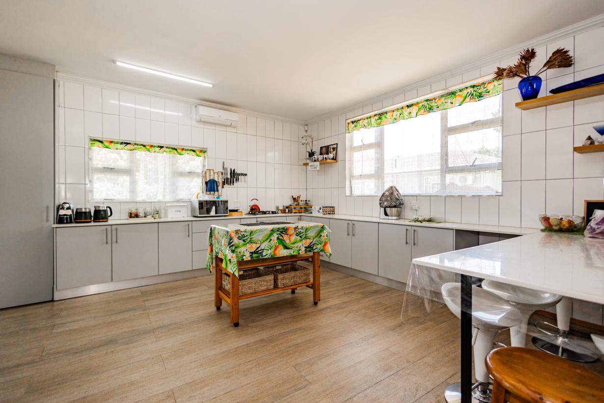 Continuing down the passage, you'll discover a dining room and a beautifully fitted kitchen equipped with a gas hob, Caesarstone countertops, a walk-in pantry, a scullery, and a laundry area.