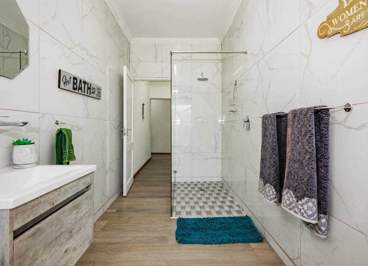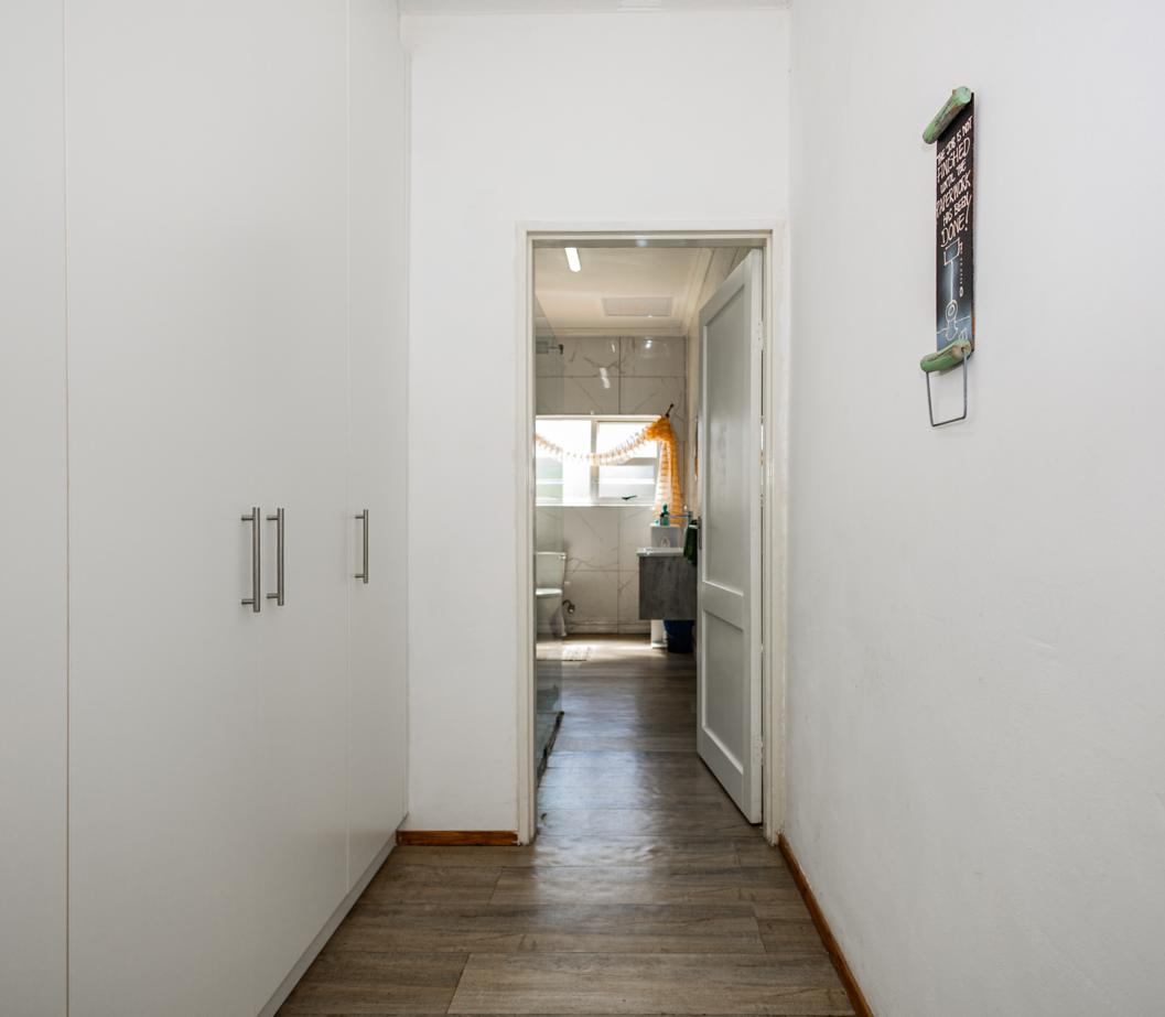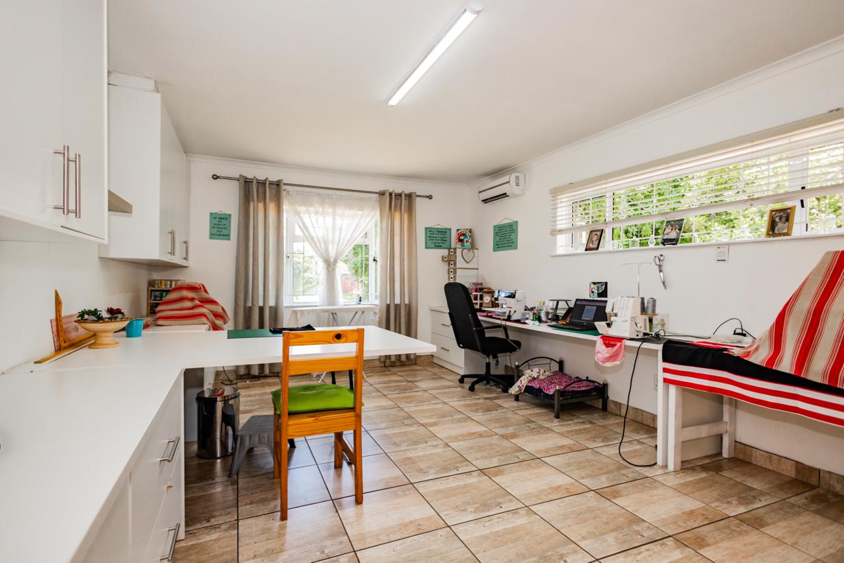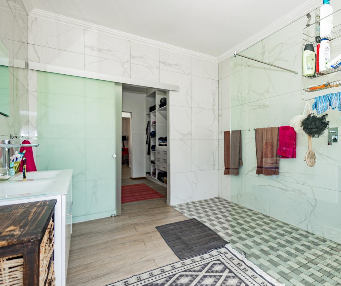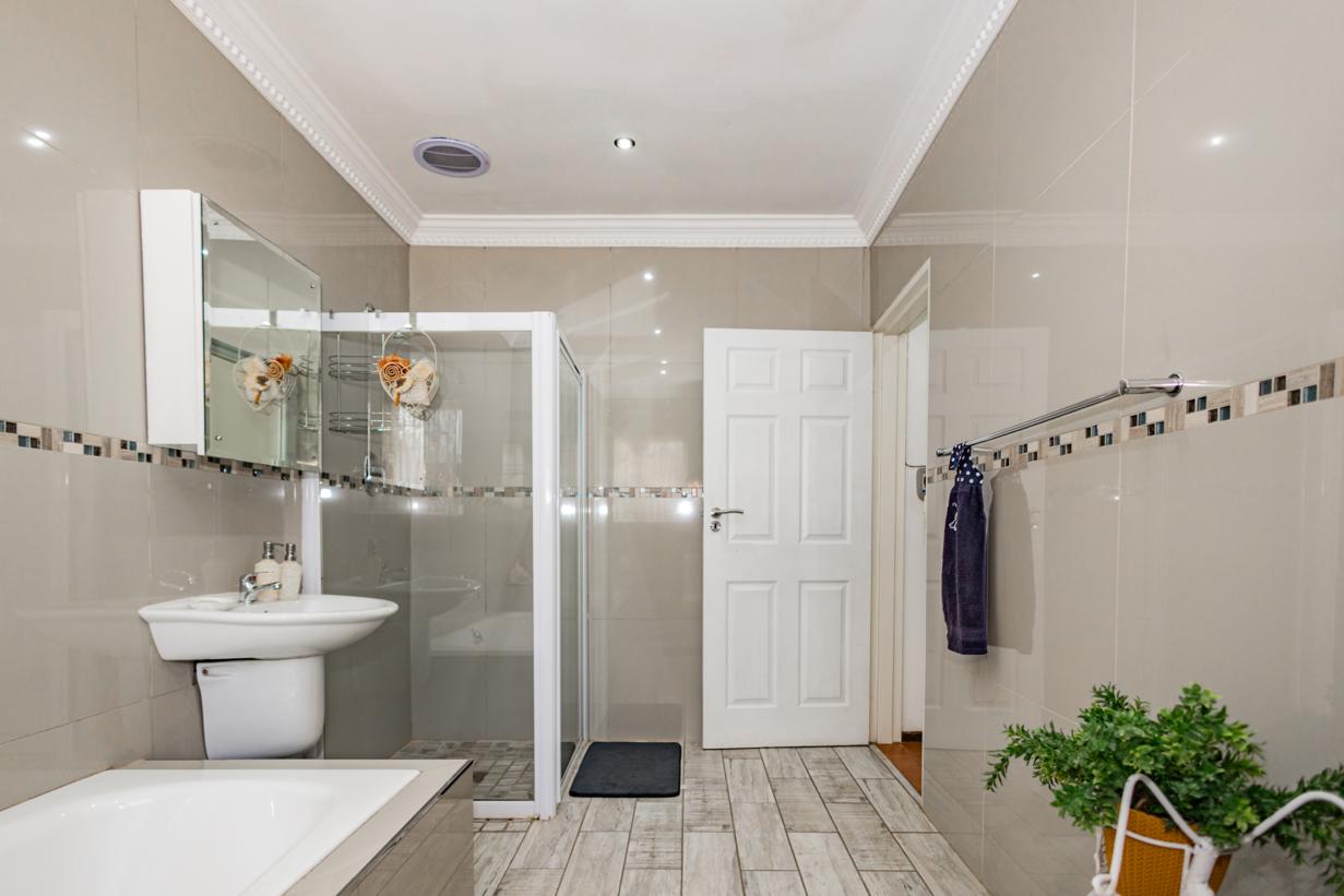 Continuing down the passage, you'll discover a dining room and a beautifully fitted kitchen equipped with a gas hob, Caesarstone countertops, a walk-in pantry, a scullery, and a laundry area.