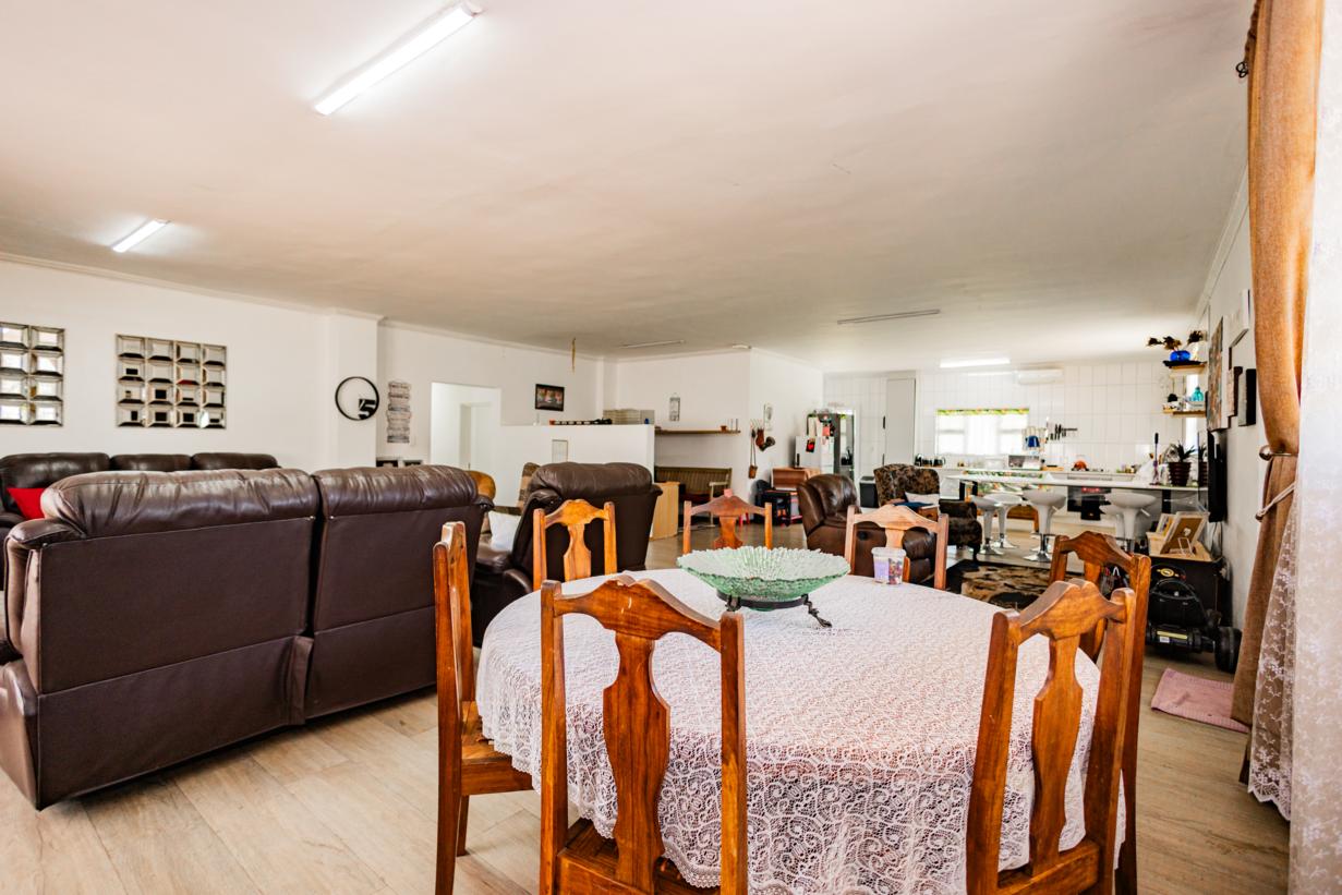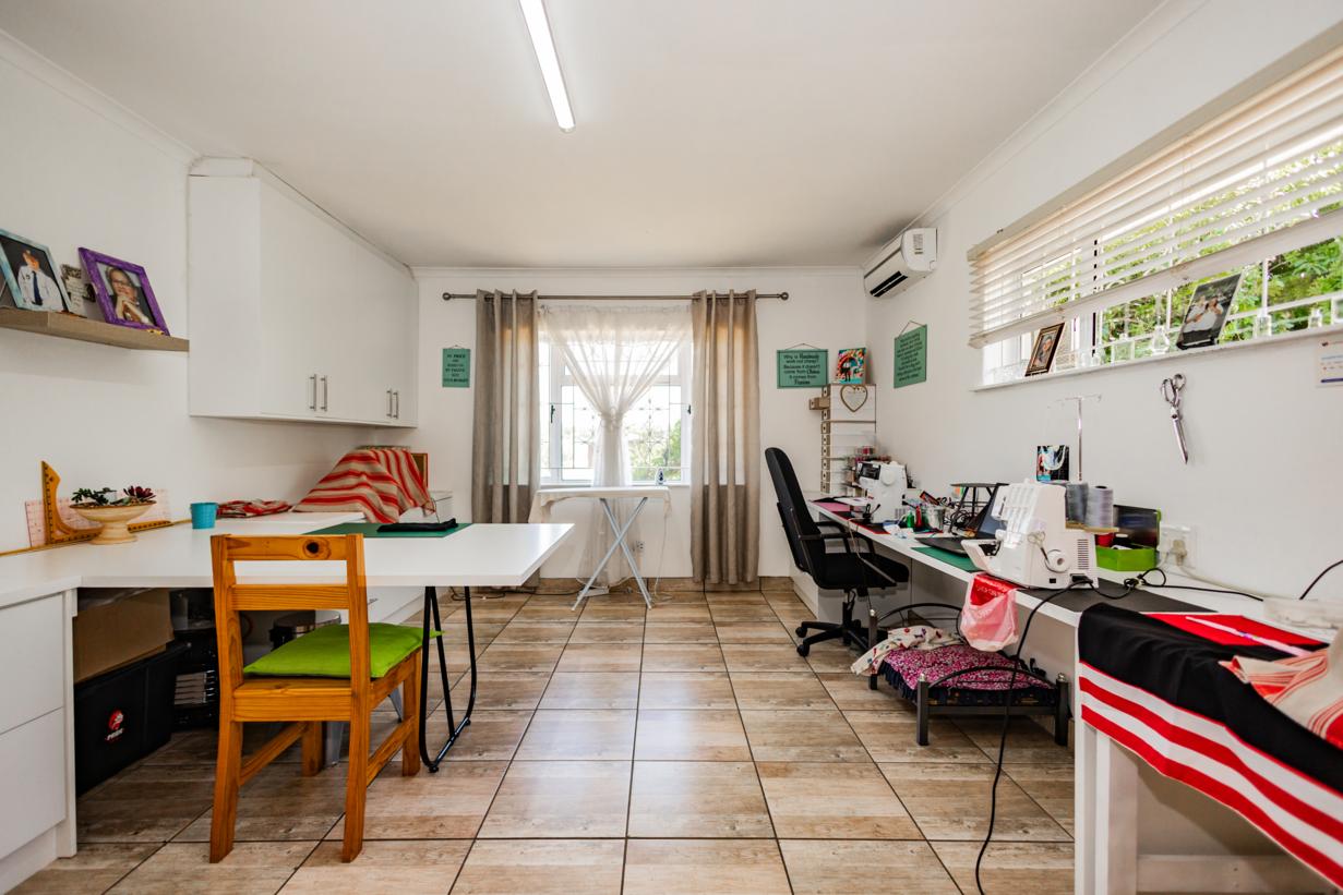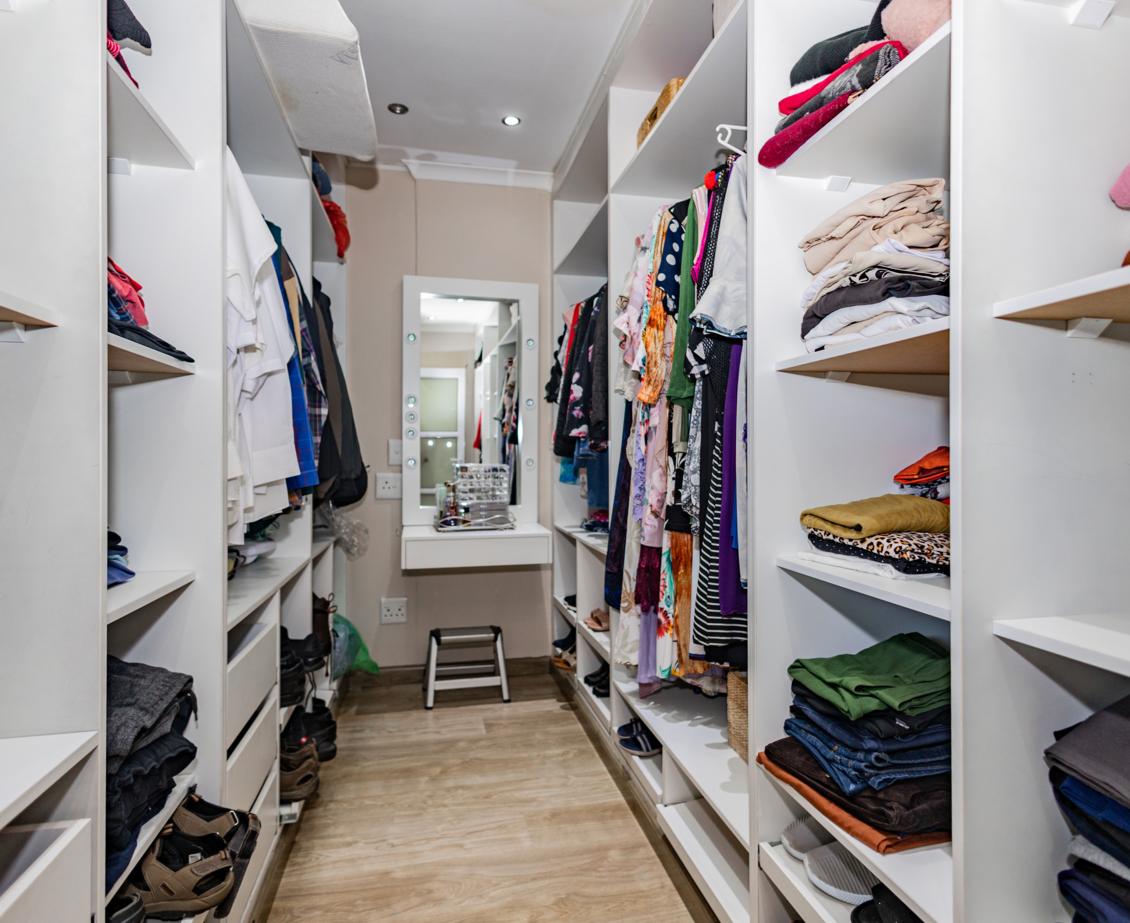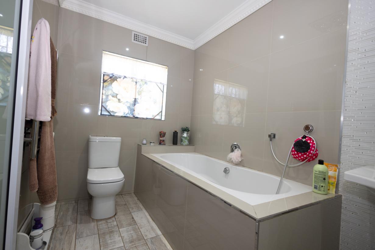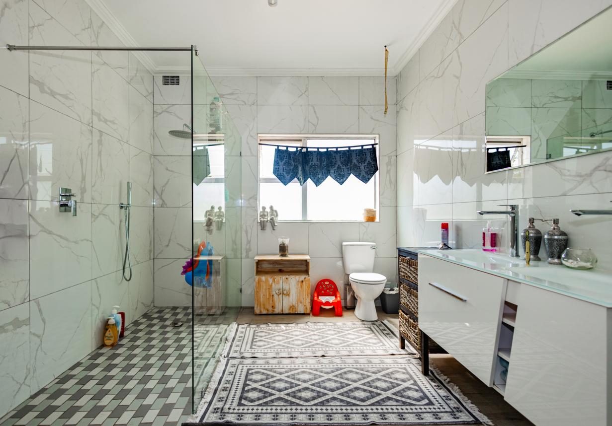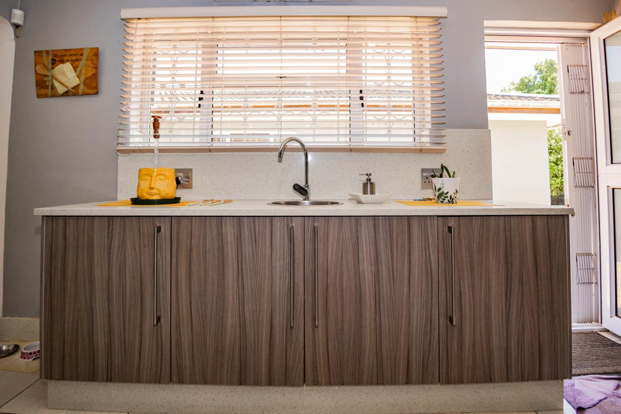 Continuing down the passage, you'll discover a dining room and a beautifully fitted kitchen equipped with a gas hob, Caesarstone countertops, a walk-in pantry, a scullery, and a laundry area.