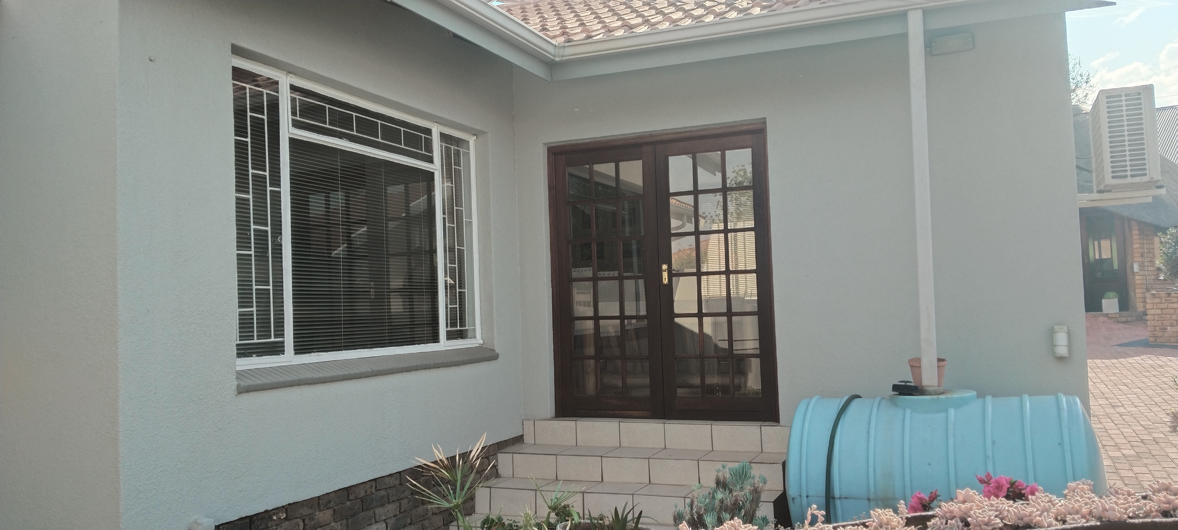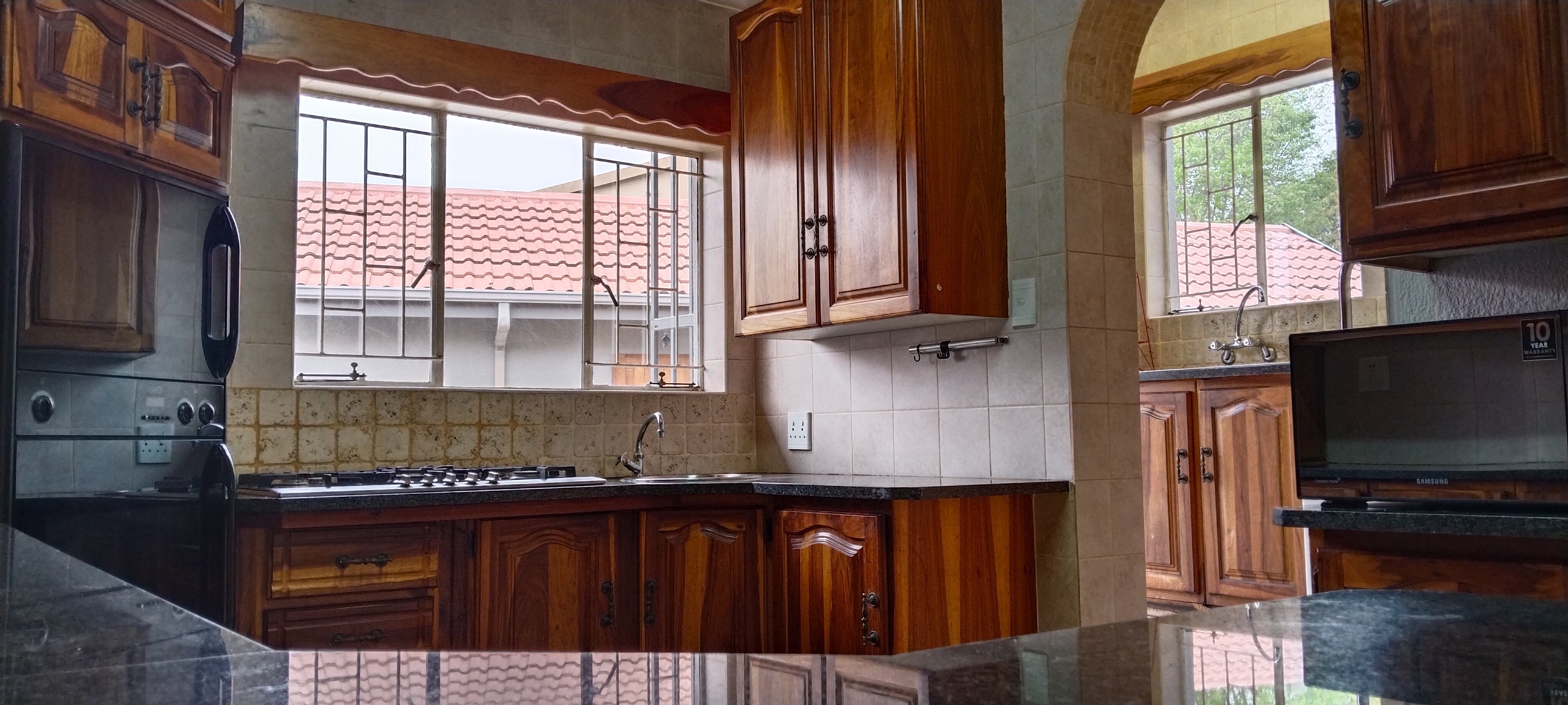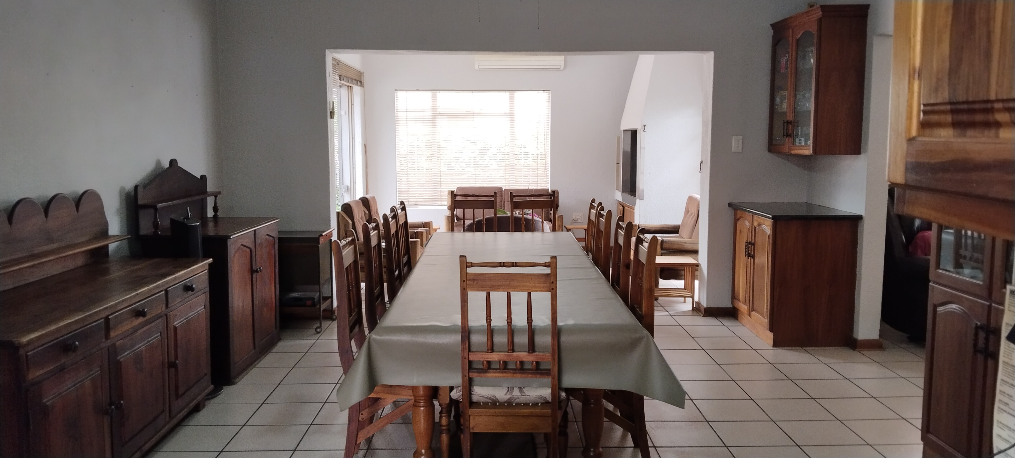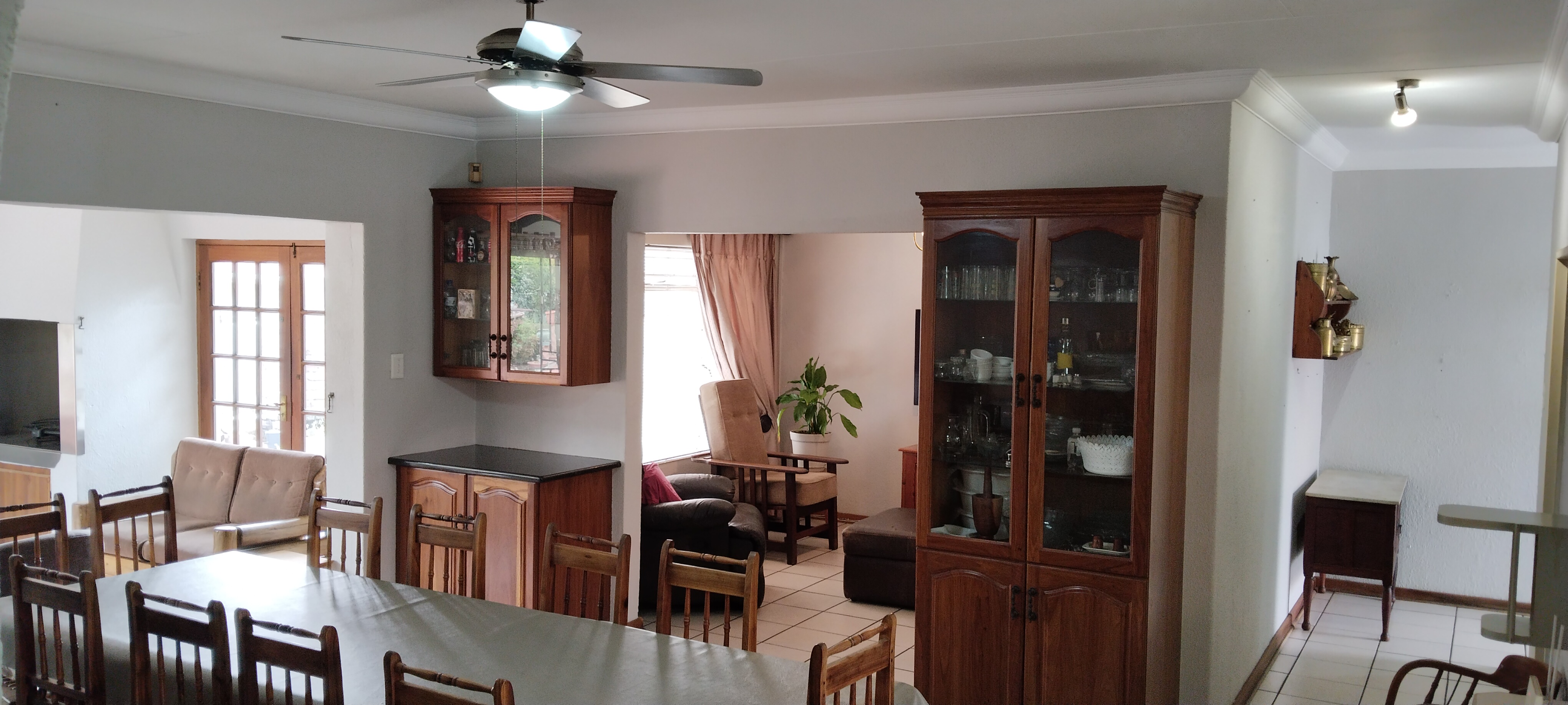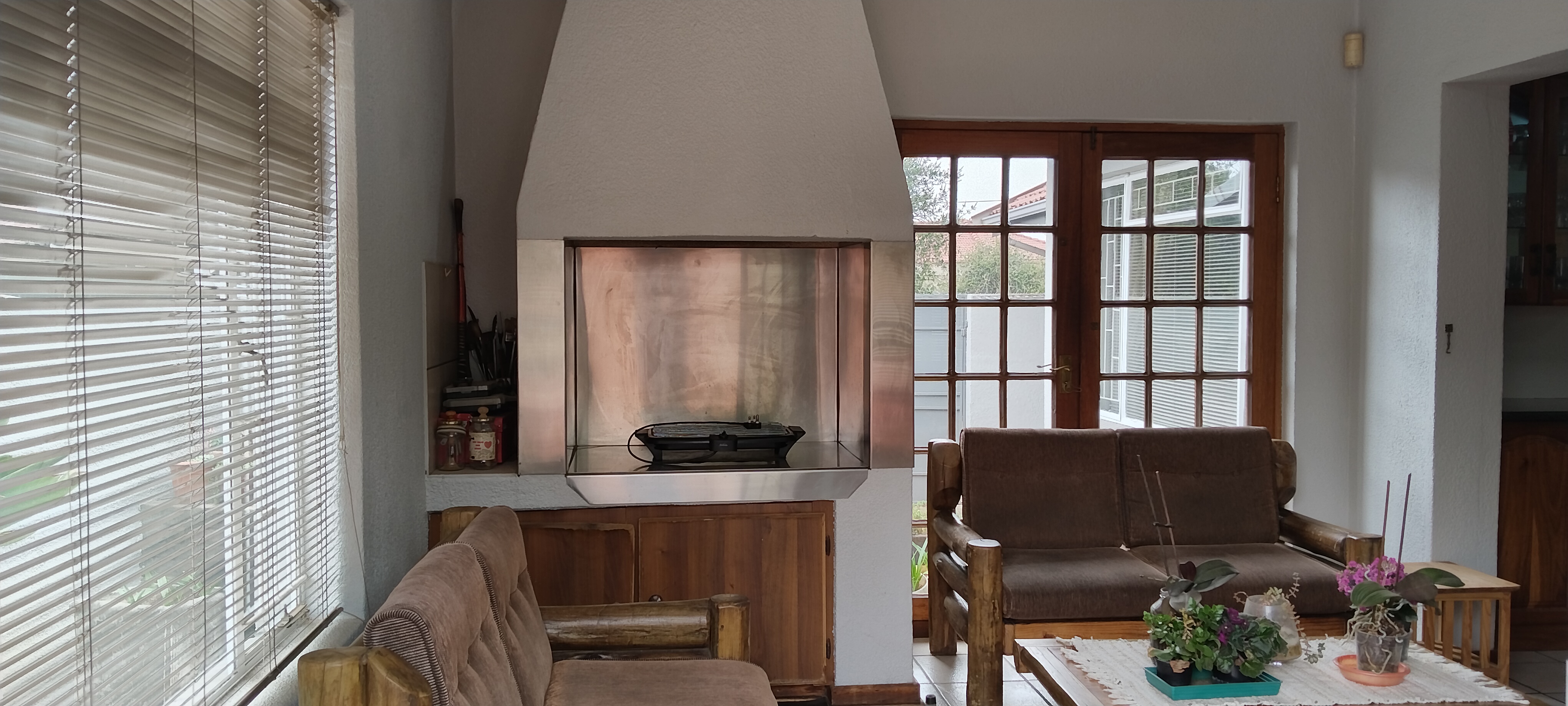 The solid imbuia wood kitchen with adjoining scullery flows seamlessly into a spacious, open-plan dining area, currently accommodating a 12-seater table. From here, step into a sun-drenched indoor braai room with double doors that open out to both sides of the lush garden—perfect for year-round entertaining.
