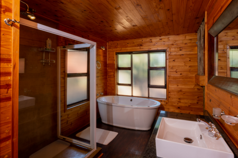 5 private log chalets, each with en suite bathrooms, rustic finishes, and sweeping views.