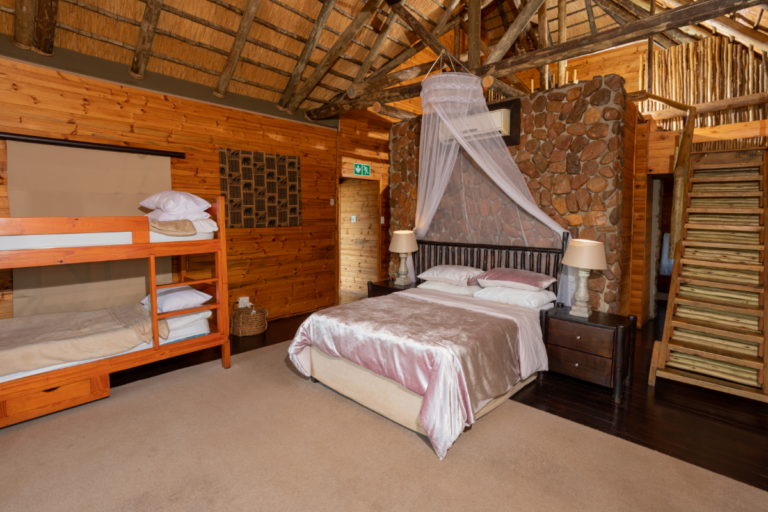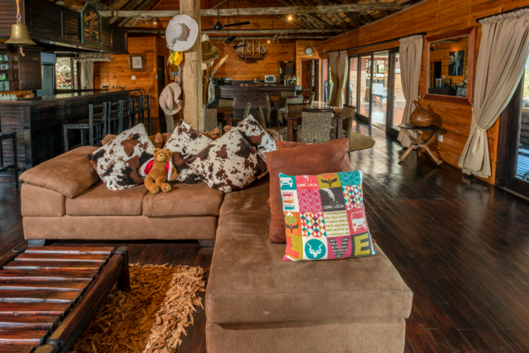From the wide wooden deck, the views are simply unforgettable. Below, Lake Jozini glistens in the African sun. Beyond, the Lubombo Mountains roll into the distance, ancient and wise. This is a place where elephants may stroll past at sunset, and the call of a fish eagle echoes across the water.
