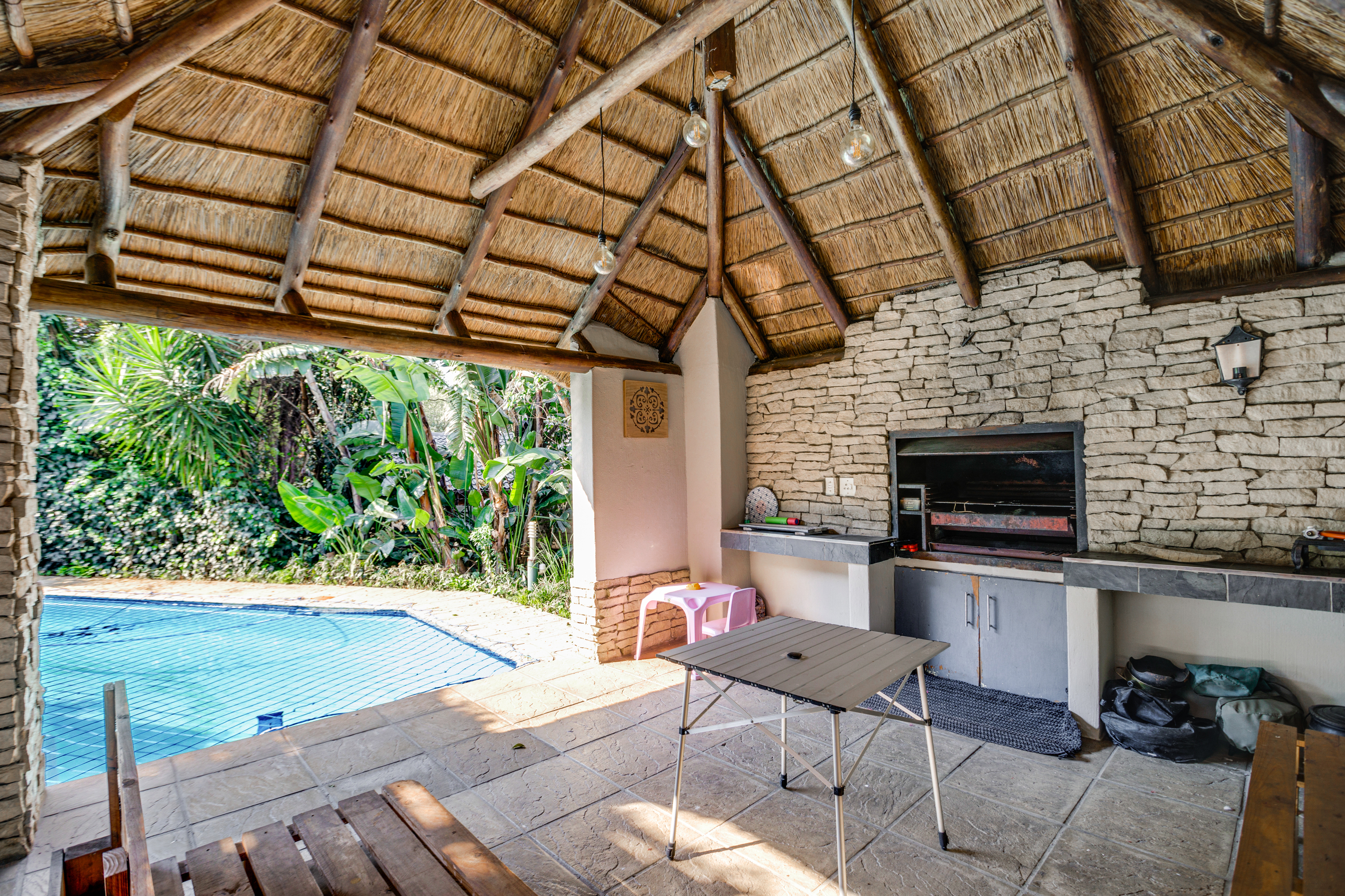 Set on an expansive 1,003 sqm stand, the home welcomes you with spacious open-plan living areas — a sun-filled lounge, elegant dining room, and a modern kitchen featuring a gas stove and glass hob. The layout flows effortlessly to the entertainment patio and sparkling 88,000-litre swimming pool, surrounded by a lush garden that creates a sense of peace and privacy.