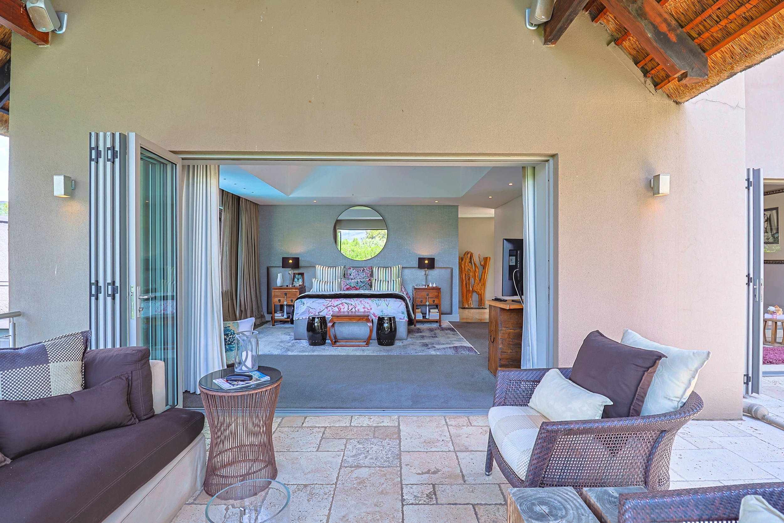 While the home's signature thatch roof beautifully complements the African skyline and estate's natural surroundings, the interior is a revelation of modern sophistication with no exposed thatch within the living spaces apart from the Magnificent entrance, allowing clean lines, high-end bulkheads, and luxurious contemporary finishes to define every room.