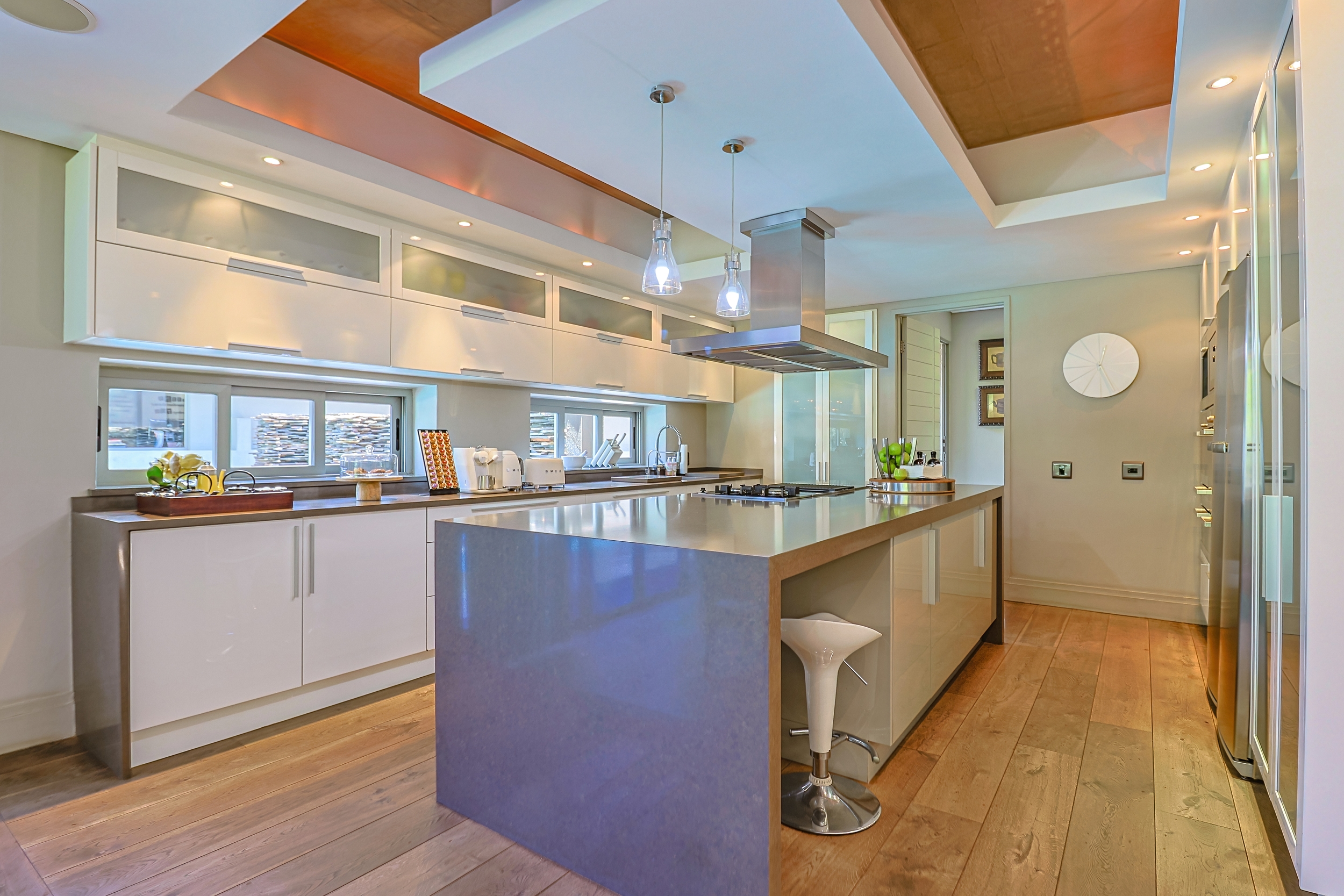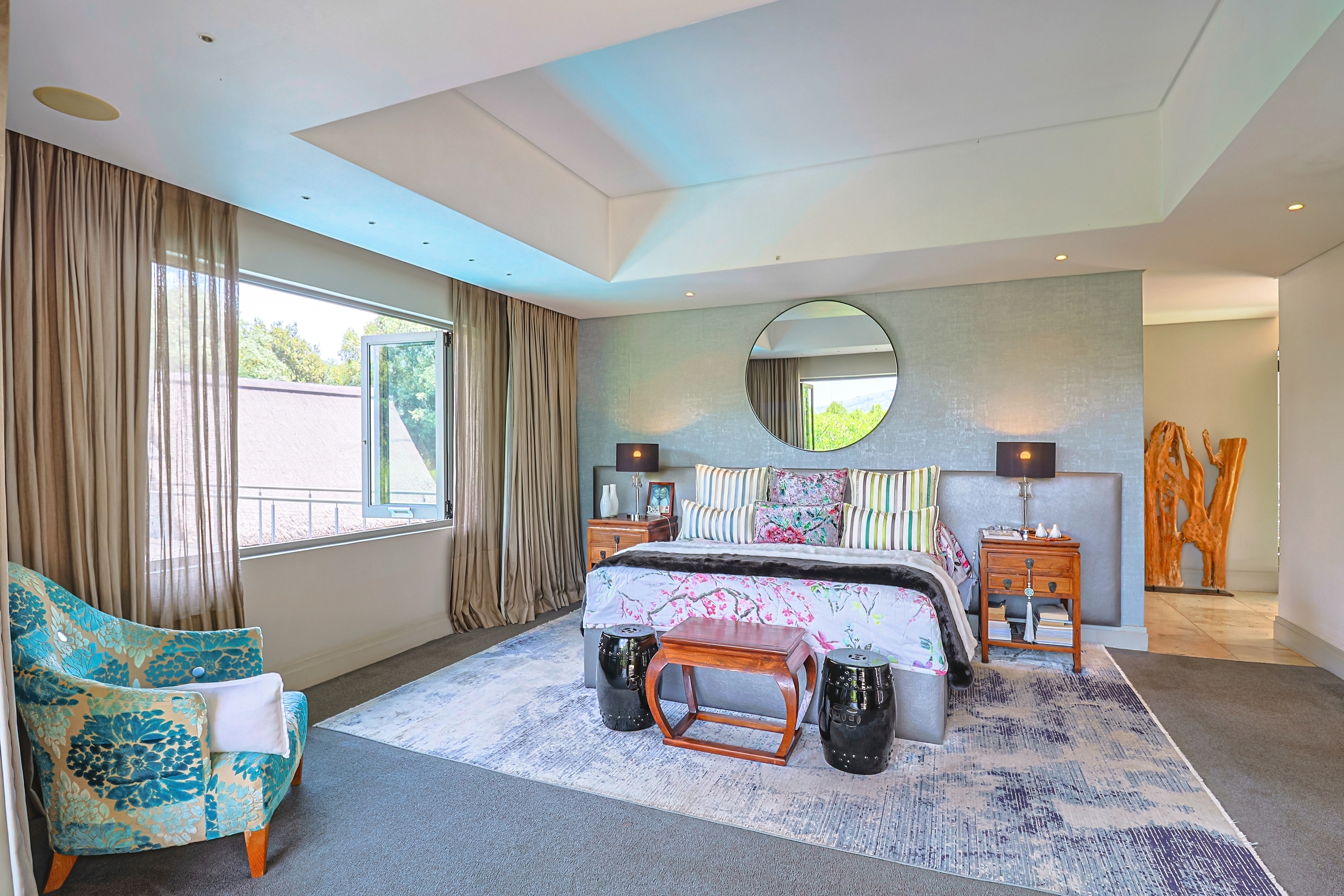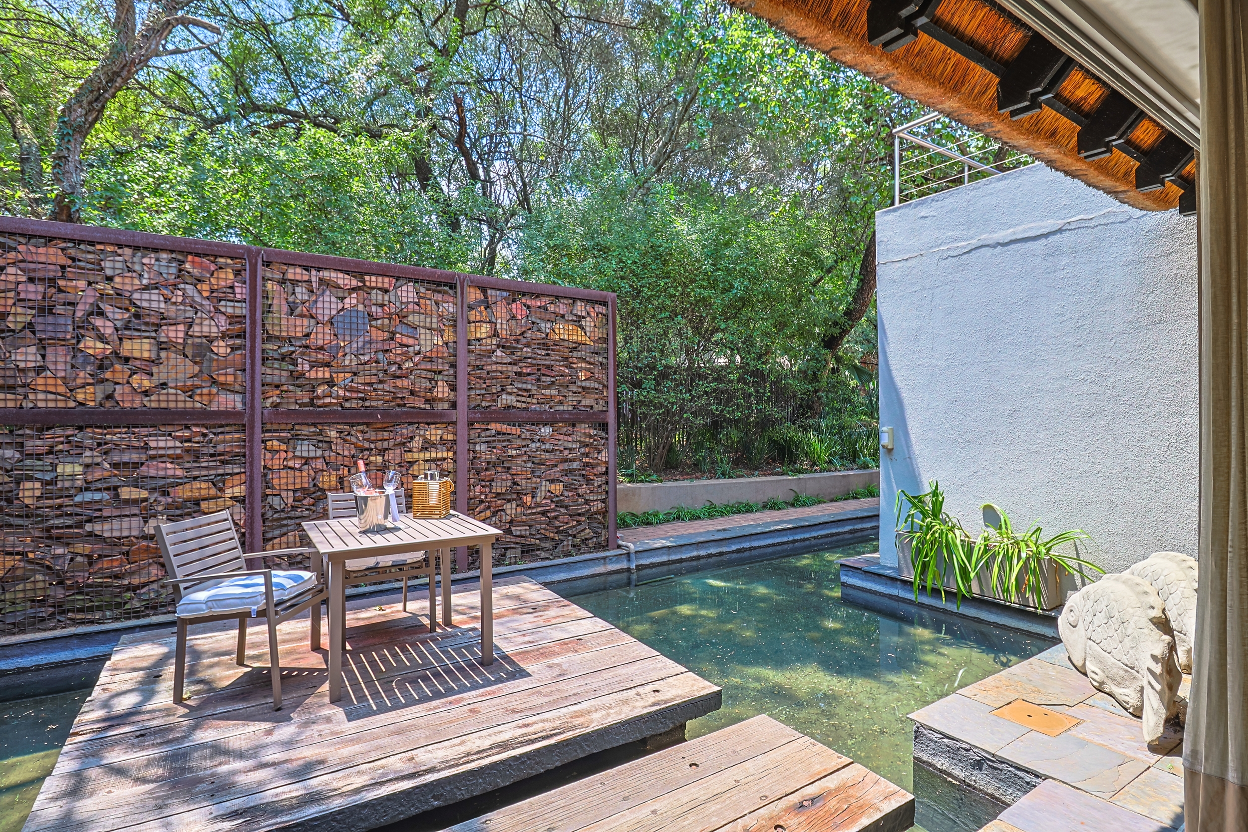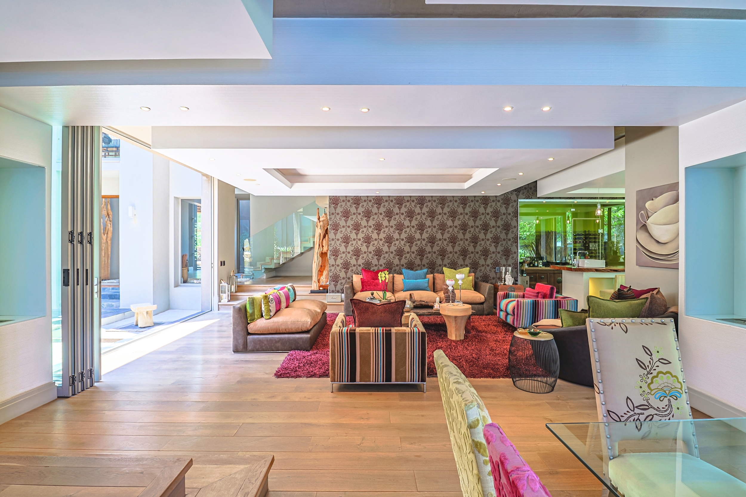 Step through the magnificent triple-volume covered Portico into a grand entrance hall bathed in natural light, where a captivating walkway over water leads to an enchanting open-air Zen garden complete with a tranquil pond and fountain - the first of five exquisite water features that infuse the property with serenity. The interior flows with understated elegance and an Zen-Afro ambience, highlighted by bespoke furniture, tasteful finishes, and effortless indoor-outdoor connectivity. The modern kitchen, equipped with premium Miele appliances, features panoramic windows and folding doors that open directly to the pool, gardens, and outdoor entertainment areas - making it the perfect hub for culinary creativity and effortless entertaining.