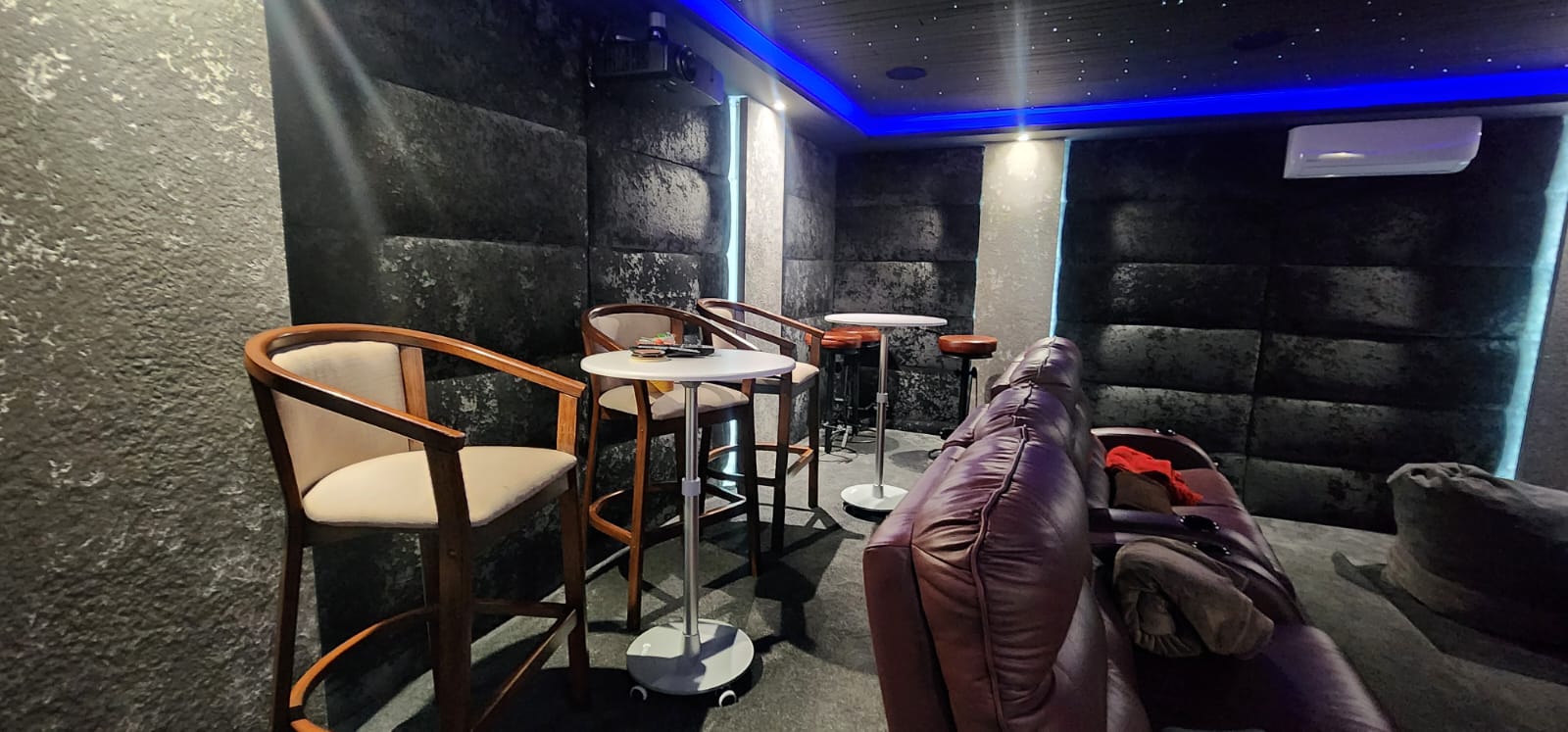 For guests or additional family, the charming cottage offers a delightful dining room, kitchenette, two bedrooms, and a bathroom with a luxurious bath, shower, and toilet. For movie enthusiasts, indulge in your own personal cinema, perfect for cozy gatherings.
