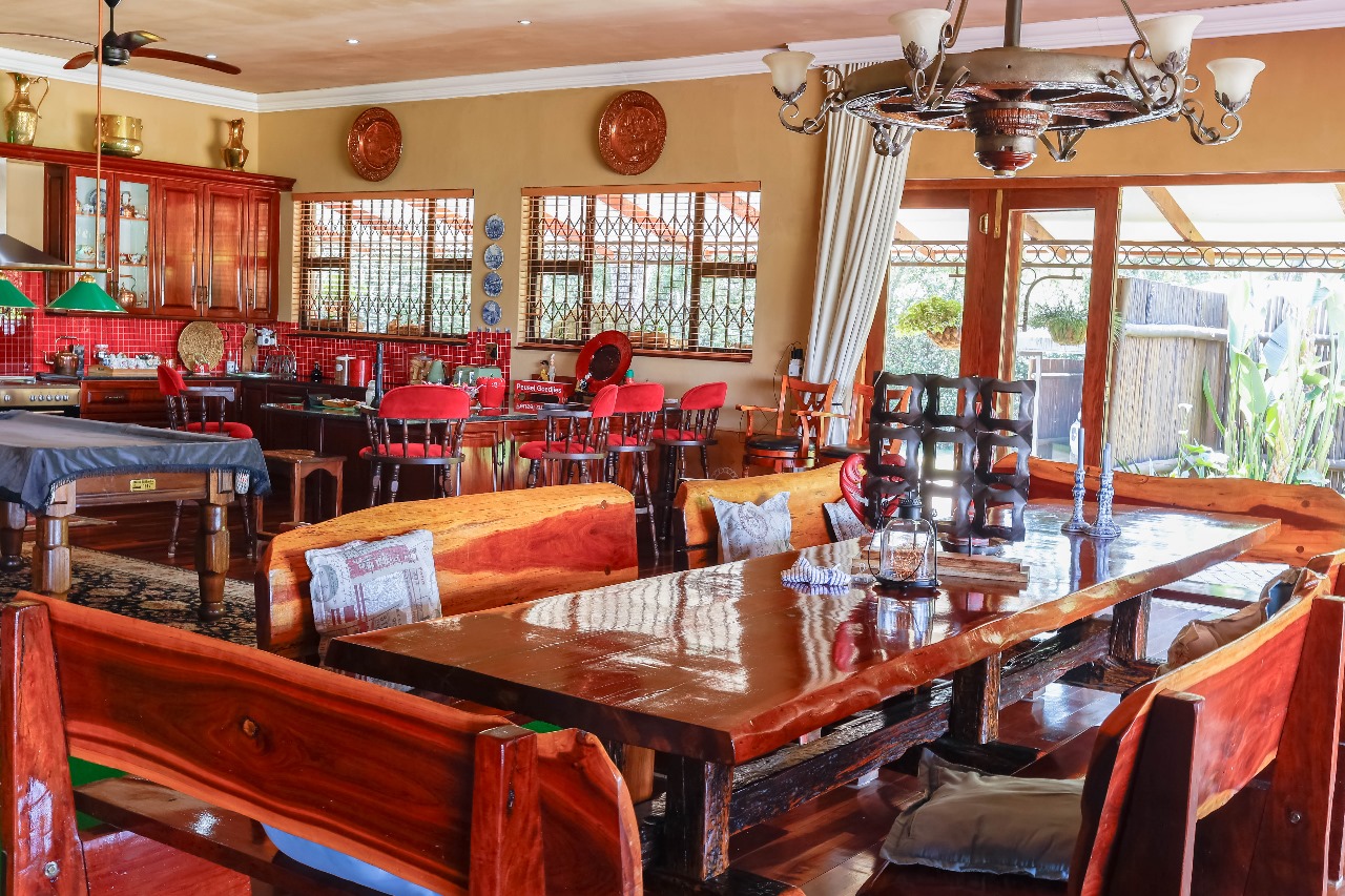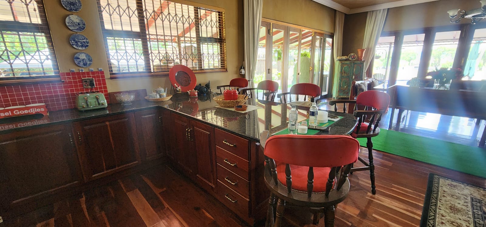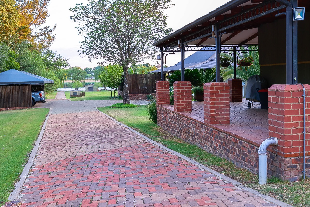 This beautifully designed main house is situated on a spacious plot, offering an open-plan layout that seamlessly blends luxury and comfort. At the heart of the home is a huge fireplace, perfect for cozy gatherings in the expansive kitchen. Enjoy a walk-in cold room and a vibrant living area that serves as a social hub, complete with a cozy TV room and an inviting dining area. All these spaces effortlessly flow onto an entertainment deck, where you’ll find a magnificent sparkling pool and a rejuvenating jacuzzi, accompanied by a well-appointed braai area—ideal for hosting friends and family. The sleeping quarters boast four spacious bedrooms, each featuring its own private bathroom. Three of these bedrooms open directly onto the deck, allowing you to wake up to breathtaking river views every morning. With air conditioning throughout the entire residence and numerous extra features included, this property is designed for both relaxation and entertainment.