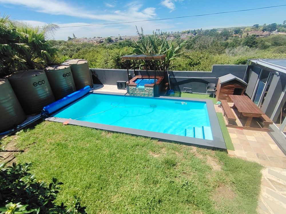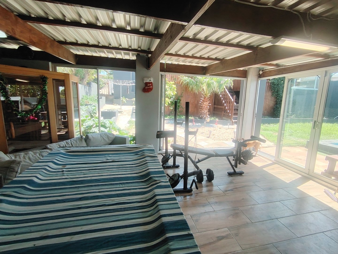 Step into a stunning entertainment room featuring stacker doors that open onto a beautifully maintained garden and sparkling pool with jacuzzi - pool has a roll up cover for protection.