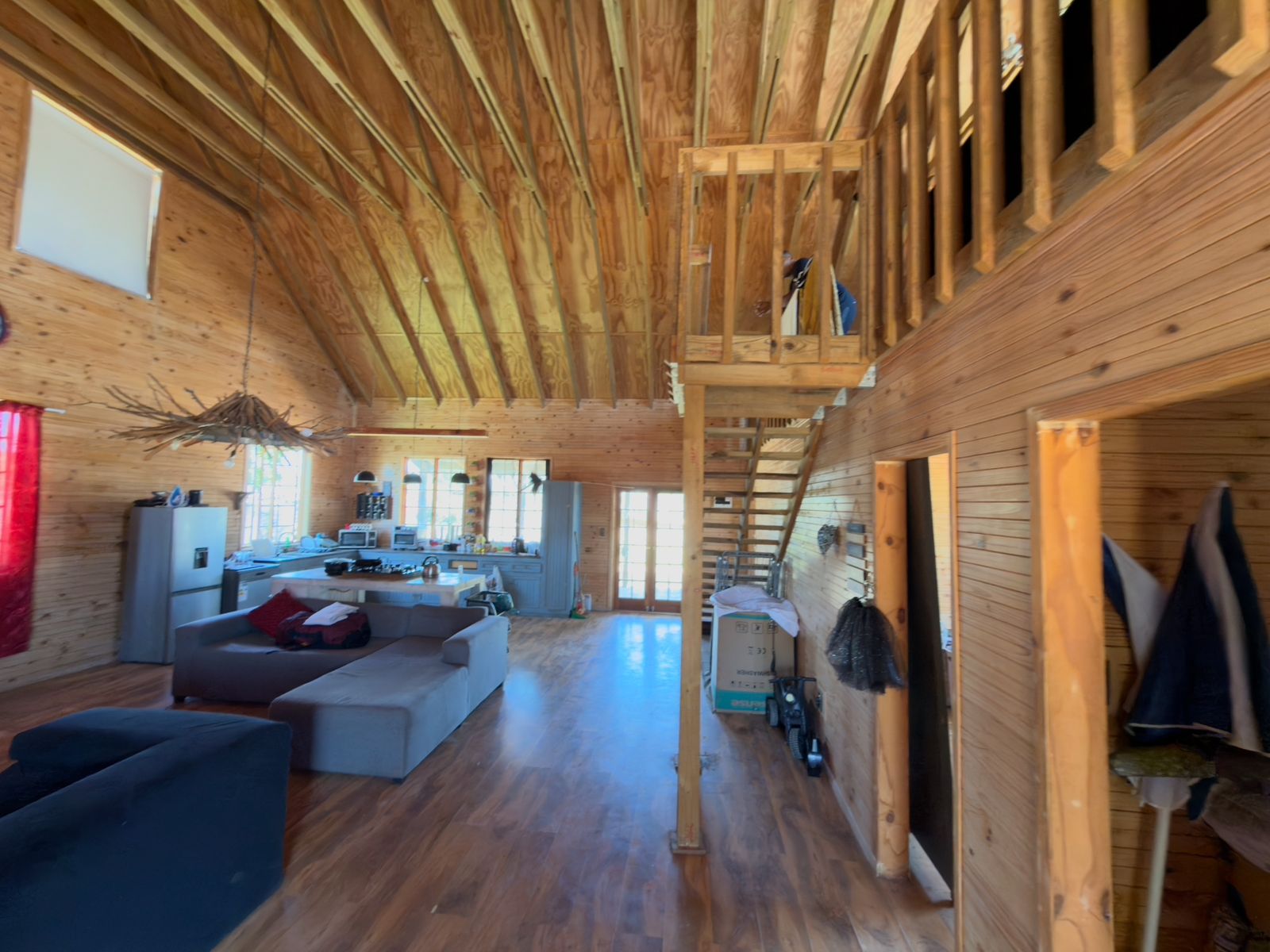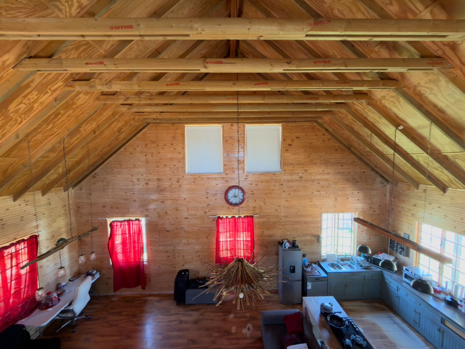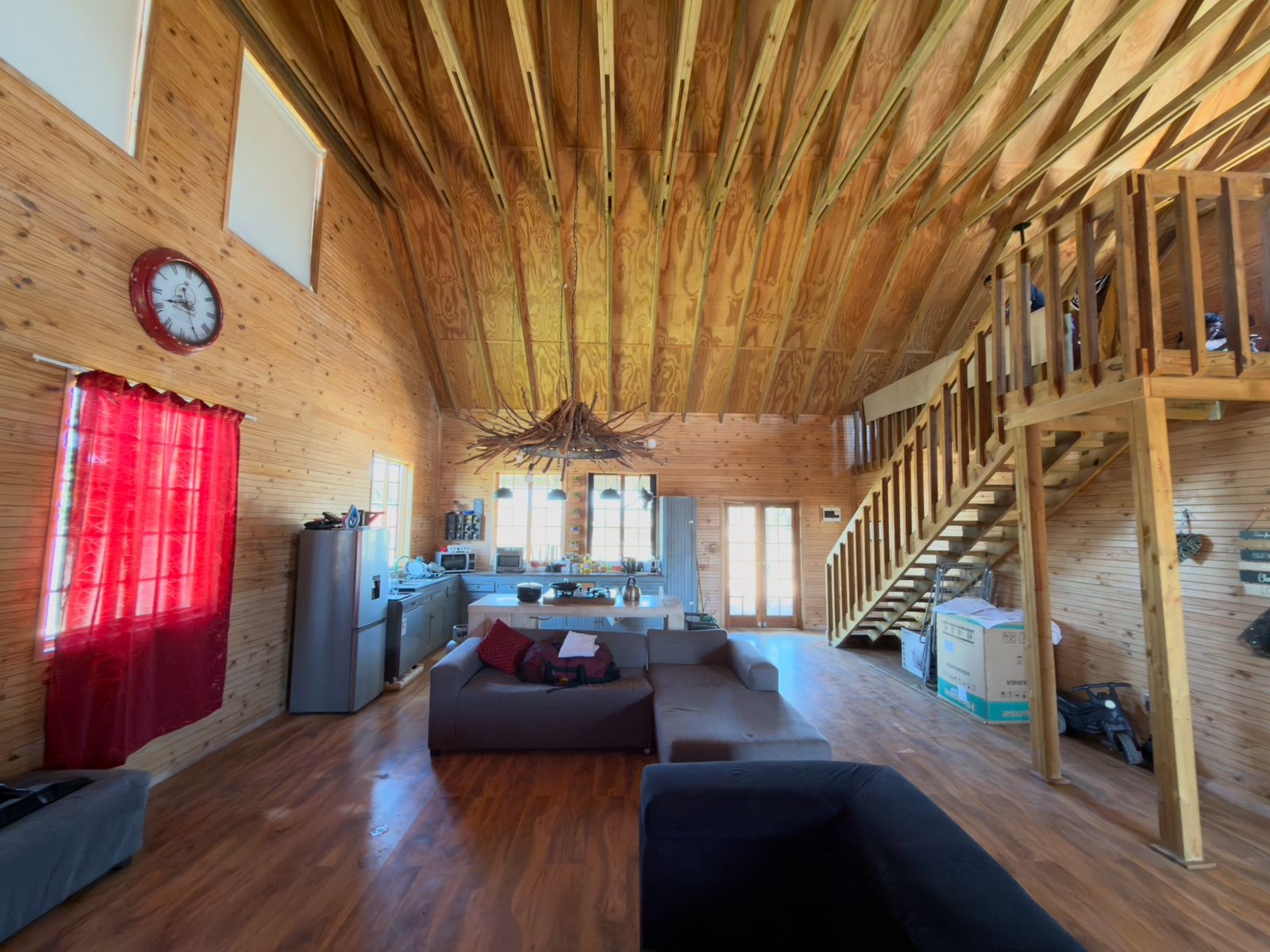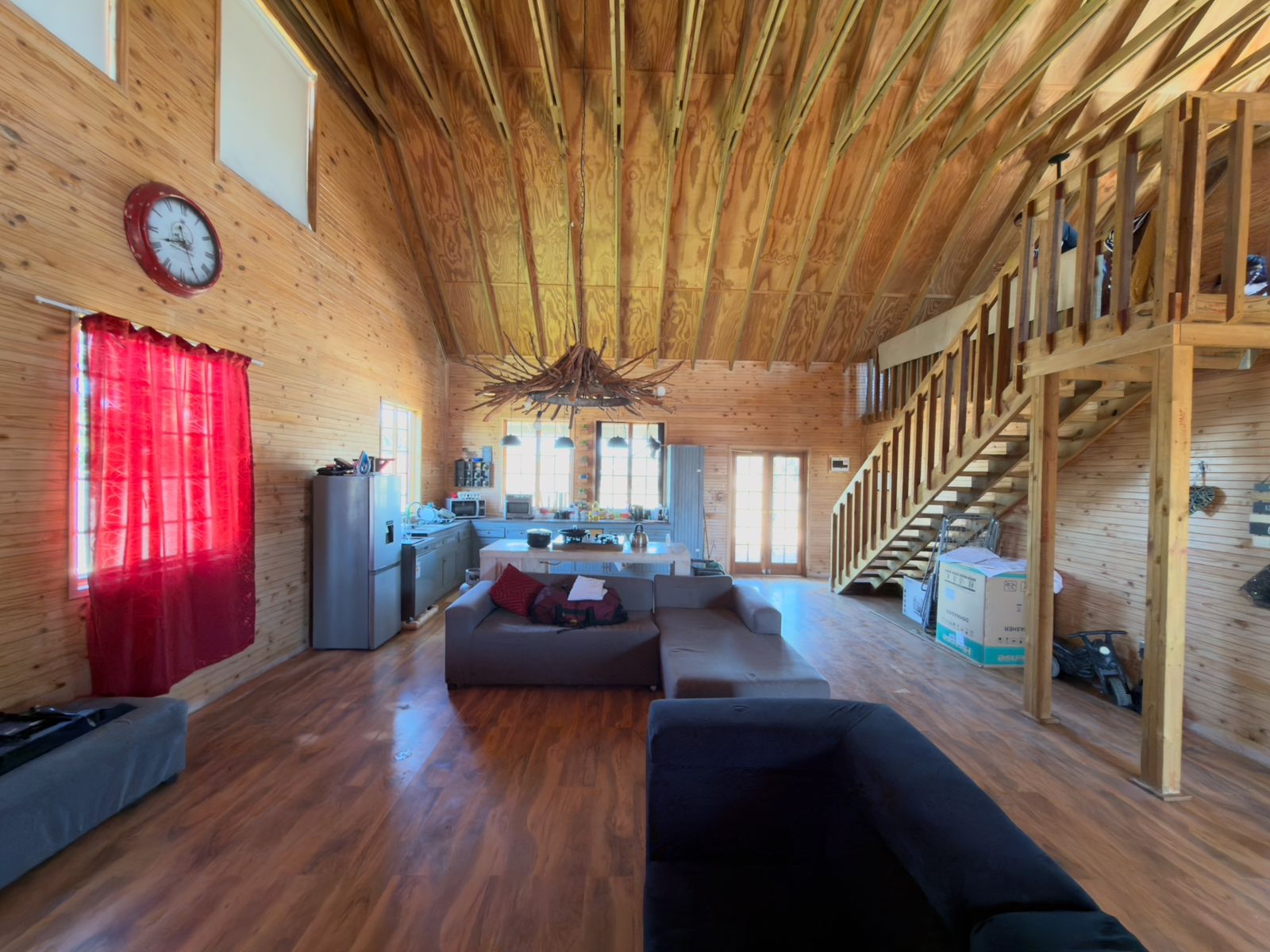 Step inside to be wowed by an 8m double-volume, exposed-beam, mezzanine-style living space. The open-plan Family Room, Dining Room, and Kitchen create a grand American-style barn vibe, perfect for entertaining. The ground floor features two cozy bedrooms and a well-appointed bathroom. Ascend the stairs to find a spacious Main Bedroom on the left and a versatile Office Space on the right.